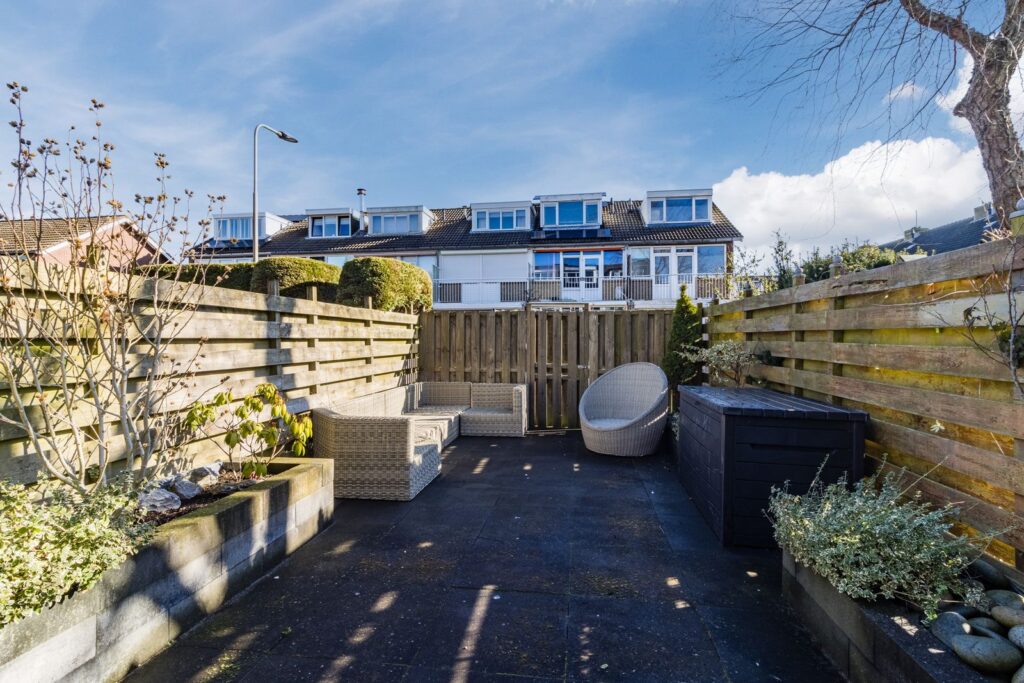 De diepe achtertuin (ca. 7.80 x 4.25) beschikt over een achterom en biedt gedurende de dag volop zon.