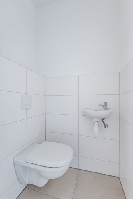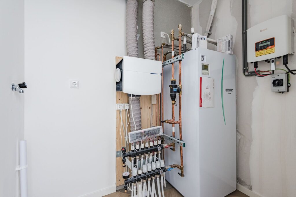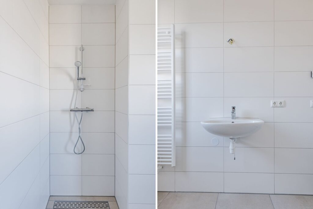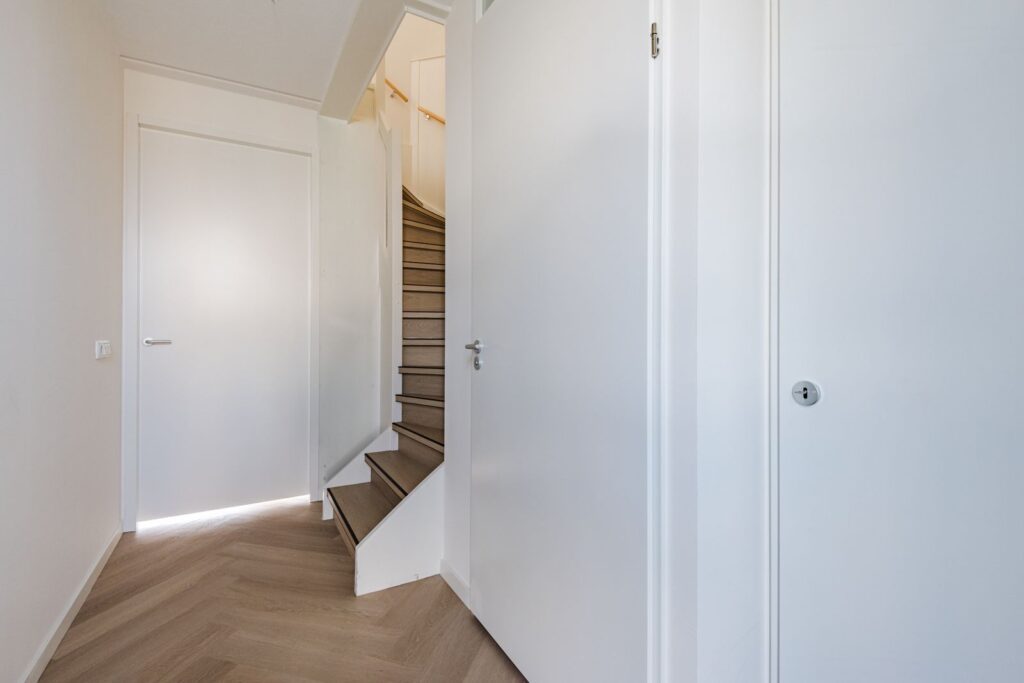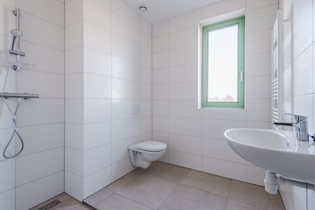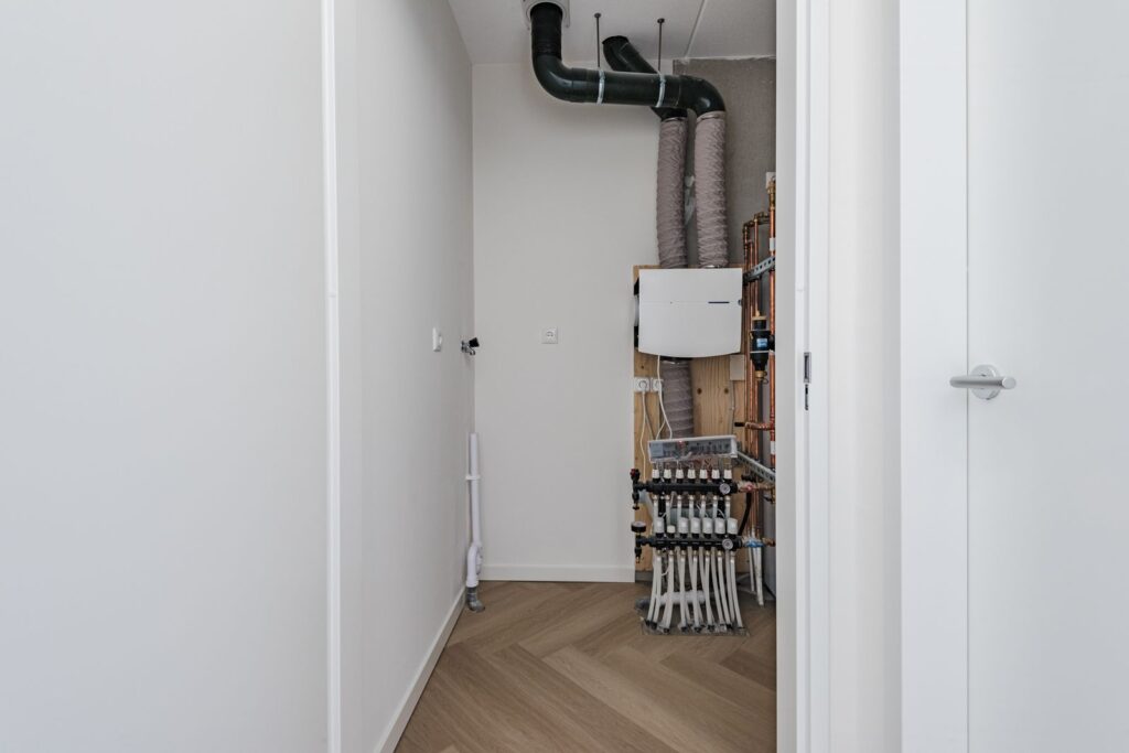 Overloop, drie slaapkamers, technische ruimte en een badkamer. De badkamer is voorzien van een wastafel, toilet en douche. Technische ruimte, voor het buffervat voor warm water, warmtepomp, verdeler vloerverwarming, ventilatie unit en opstelplaats voor de wasmachine