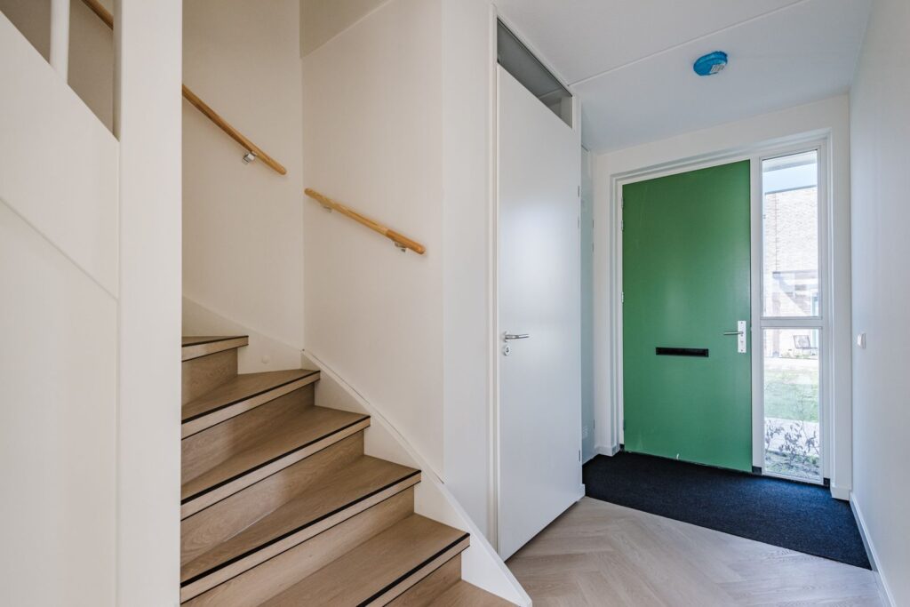 Entree, hal met meterkast, toilet , trapopgang naar de verdieping en toegang tot de woonkamer met open keuken. De open keuken is aan de voorzijde van de woning. De woonkamer is tuingericht en voorzien van openslaande deuren naar de tuin.