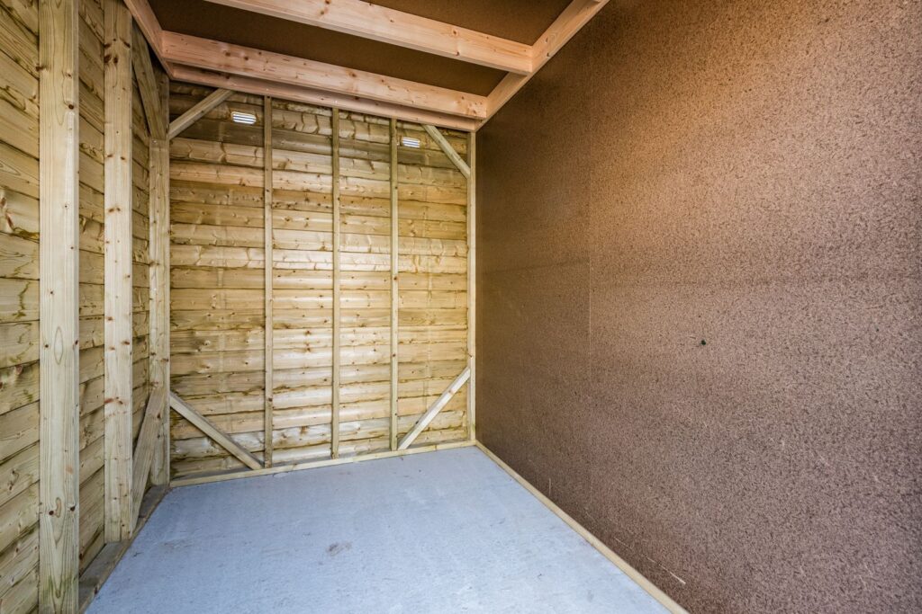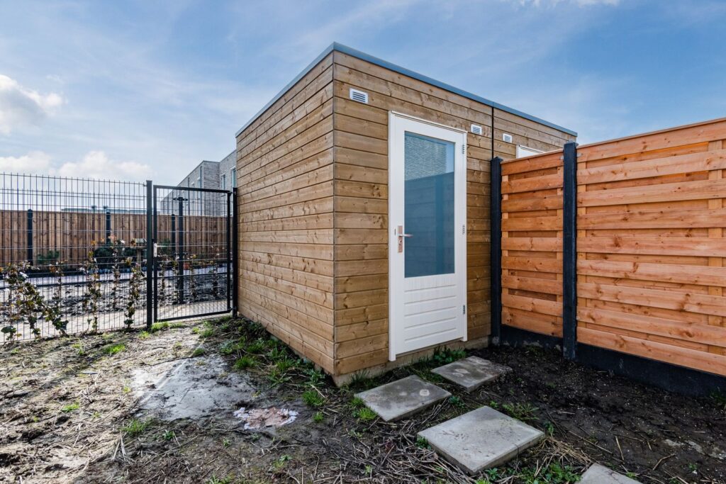 Diepe zonnige achtertuin op het zuidoosten met een houten berging en schutting.