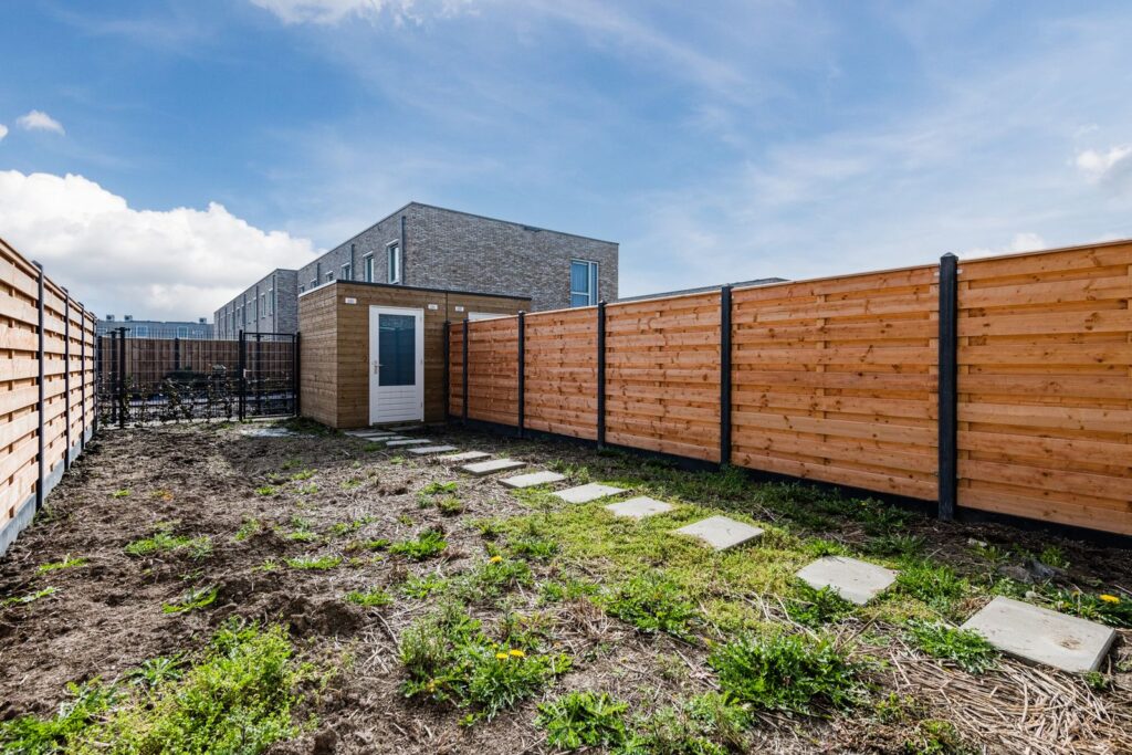 * Diepe zonnige achtertuin met berging, schutting en afsluitbaar hekwerk.
