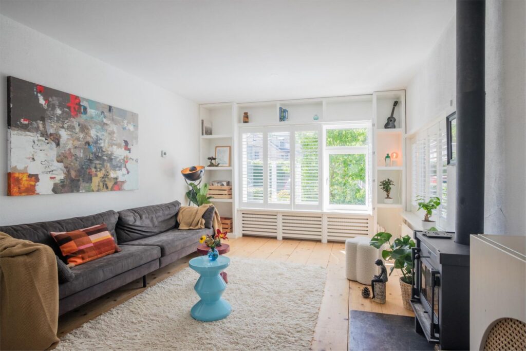 De zitkamer aan de voorkant is bijzonder licht en sfeervol, met een groot formaat houtkachel van Janus en een stevige houten vloer die doorloopt in de keuken. Via de zitkamer bereik je ook de ruime bijkeuken/garage met eigen ingang én een multifunctionele ruimte die nu in gebruik is als werkkamer, maar voorheen ook als logeerkamer. Deze ruimtes zijn volledig geïsoleerd, verwarmd en voorzien van veel bergruimte.