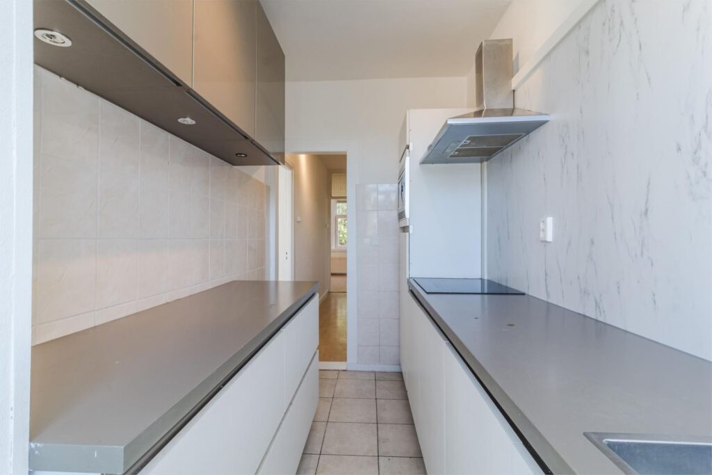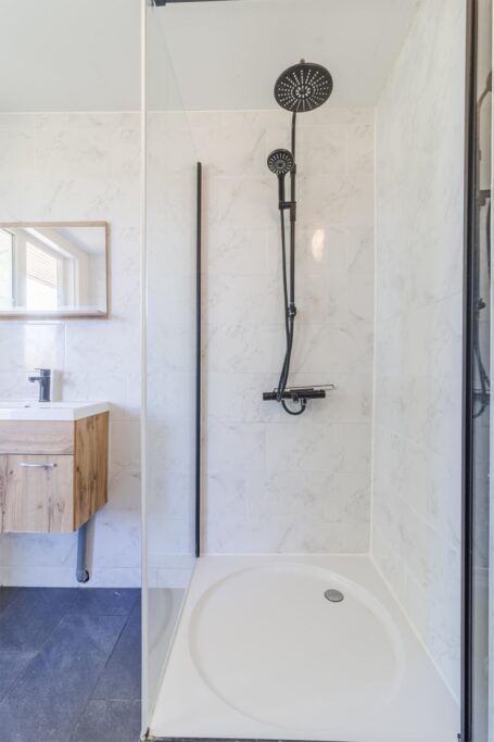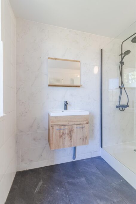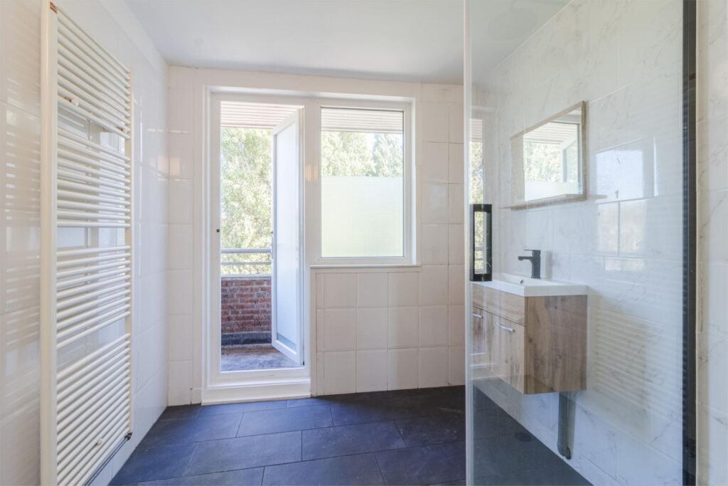 De badkamer springt eruit: licht, ruim en strak afgewerkt met tijdloze tegels. Je vindt er een ruime douchecabine, een designradiator en een modern wastafelmeubel met extra bergruimte. En het mooiste? Ook vanuit hier stap je direct het balkon op!