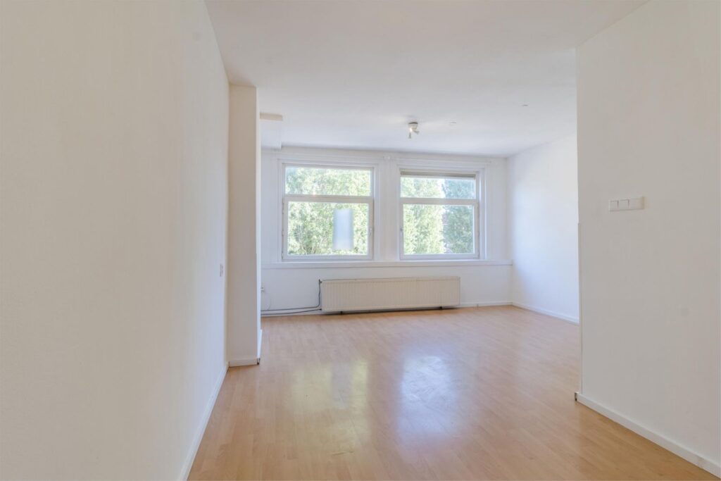 De woonkamer is licht, praktisch ingedeeld in een L-vorm en strak afgewerkt. Dankzij de goede indeling kun je de ruimte helemaal naar eigen smaak inrichten.