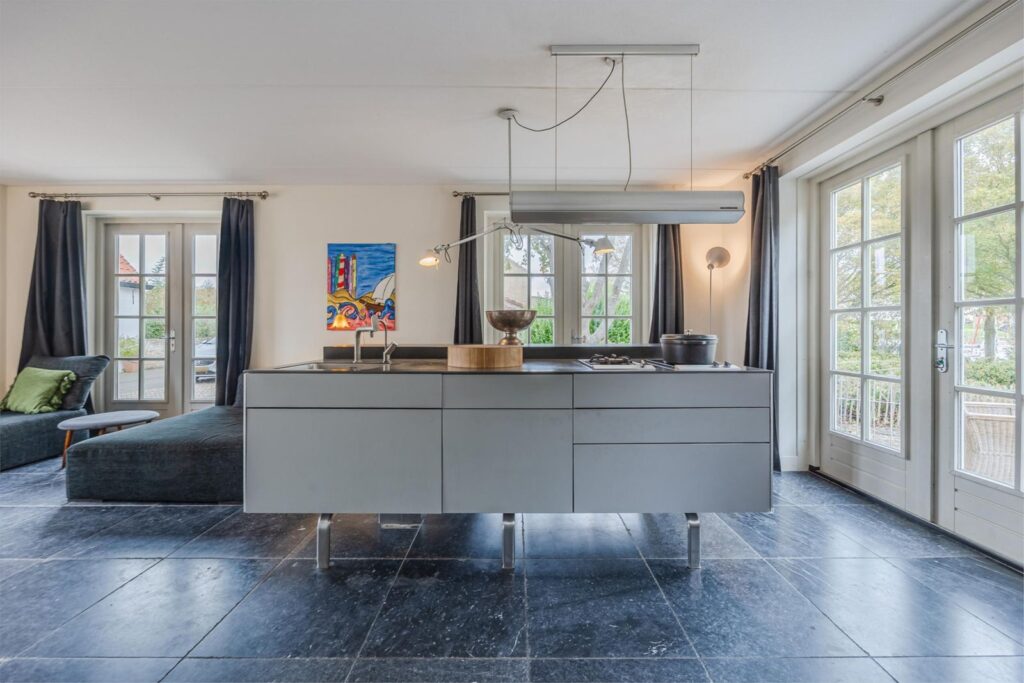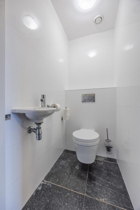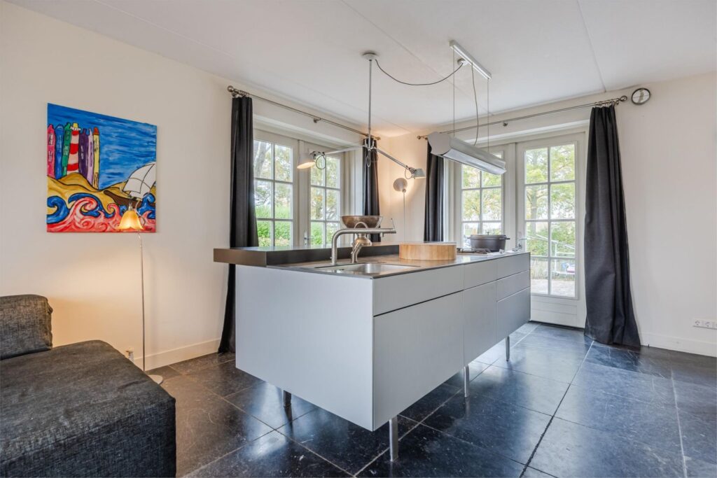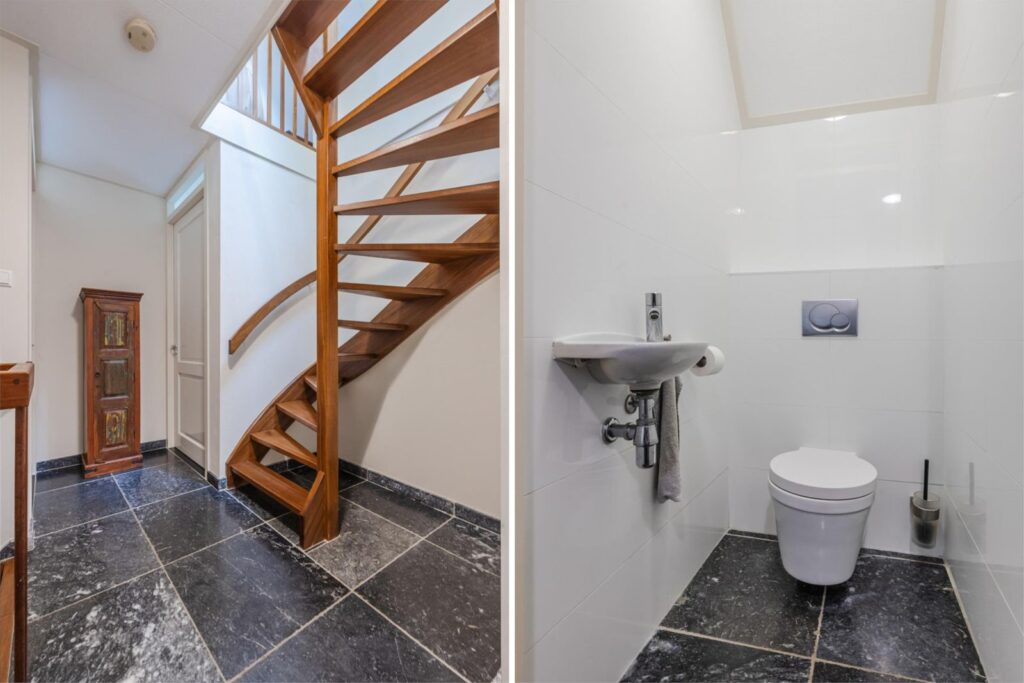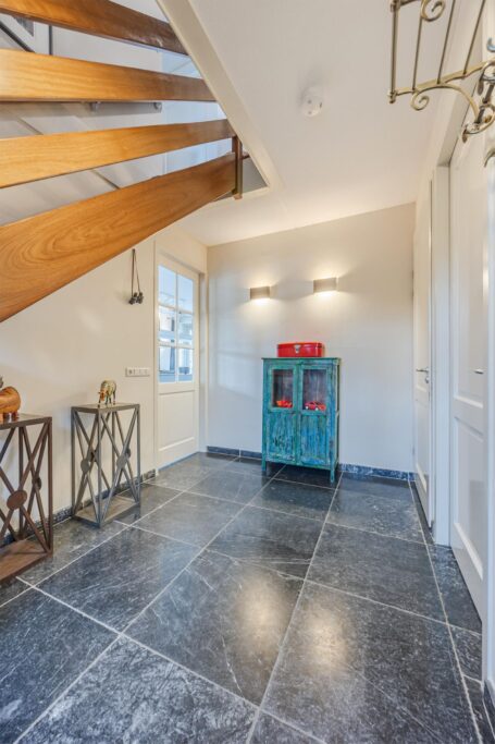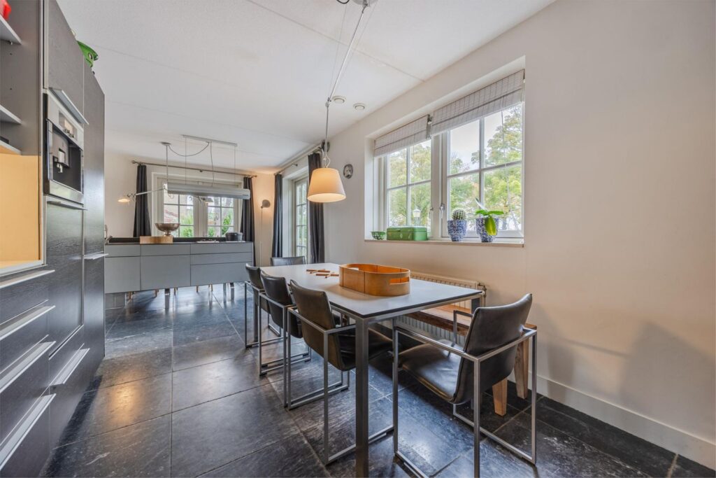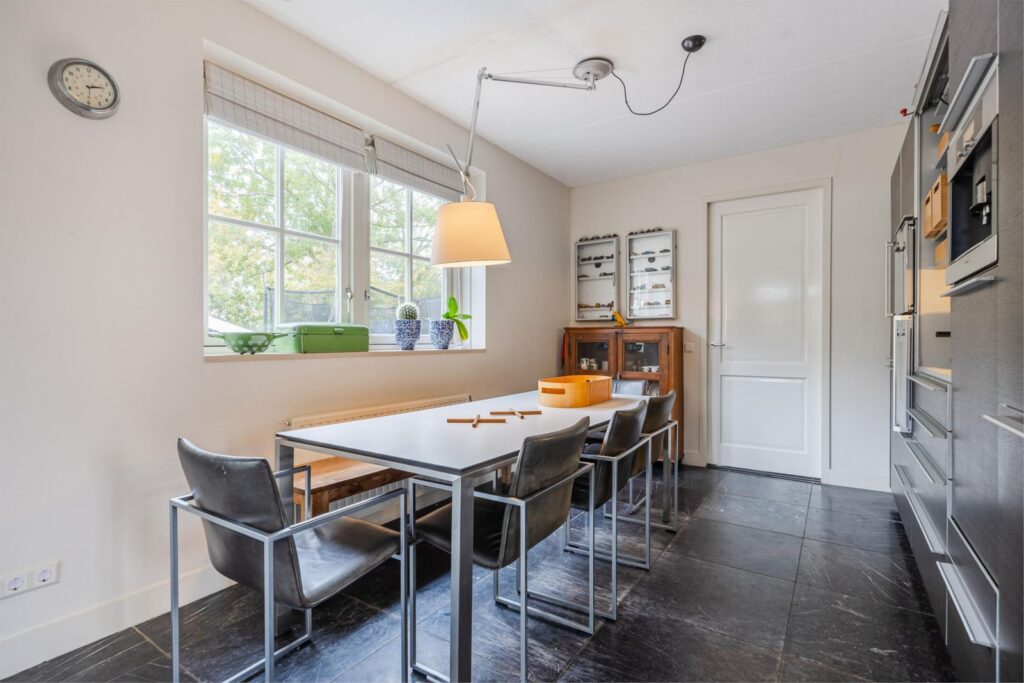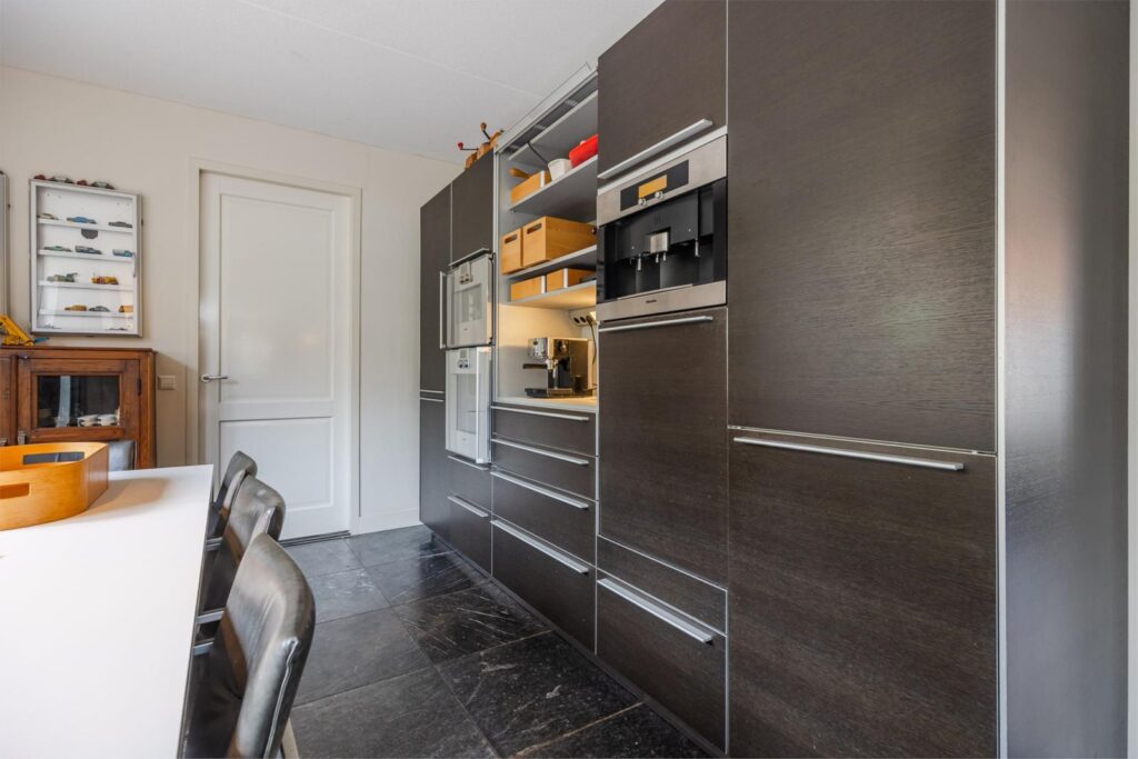 Het huis is gebouwd in 2009, zeer mooi en degelijk gebouwd door Selekthuis .Het is degeonderheid. Het is ruim en licht, door de kiep/ kantel-ramen en de drie paar openslaande deuren. Prachtige natuurstenen vloer met vloerverwarming ( ook onder het terras) Het terras achter kan desgewenst een aanbouw worden. De benedenverdieping heeft een ruime woonkeuken met de living. De keuken is van Bulthaup met Gaggenau apparatuur. Verder een zeer ruime hal met de trap en toilet, een bijkeuken en een slaapkamer met badkamer, met douche, wastafel en toilet. Deze badkamer is ook bereikbaar vanuit de bijkeuken. In de bijkeuken bevinden zich de aansluitingen voor wasmachine en droger. In de kast bevindt zich de ketel . Ook is er een spoelbak met warm en koud water.