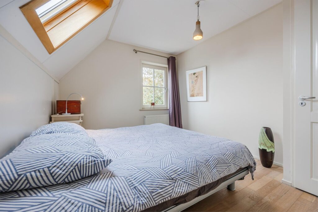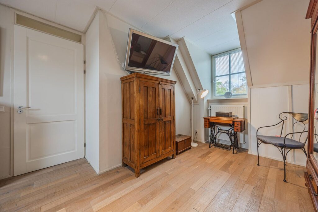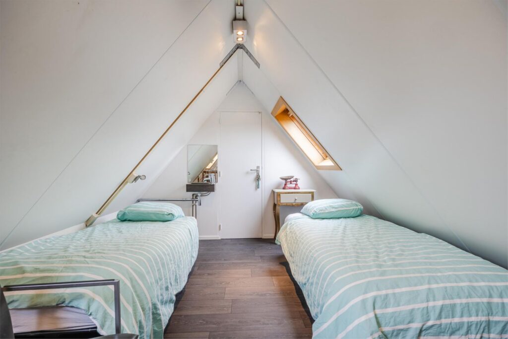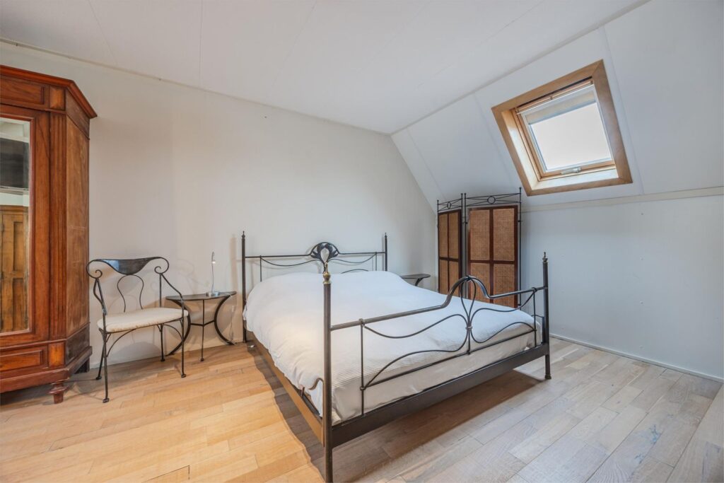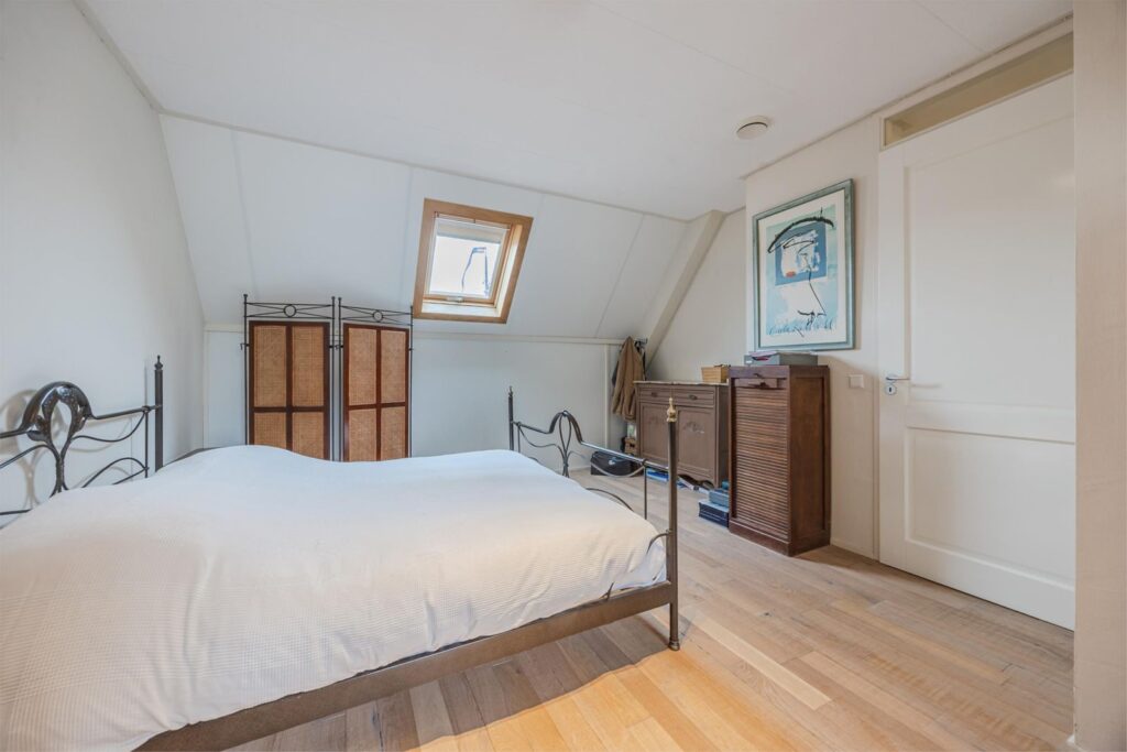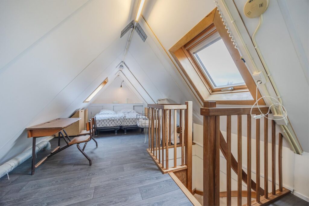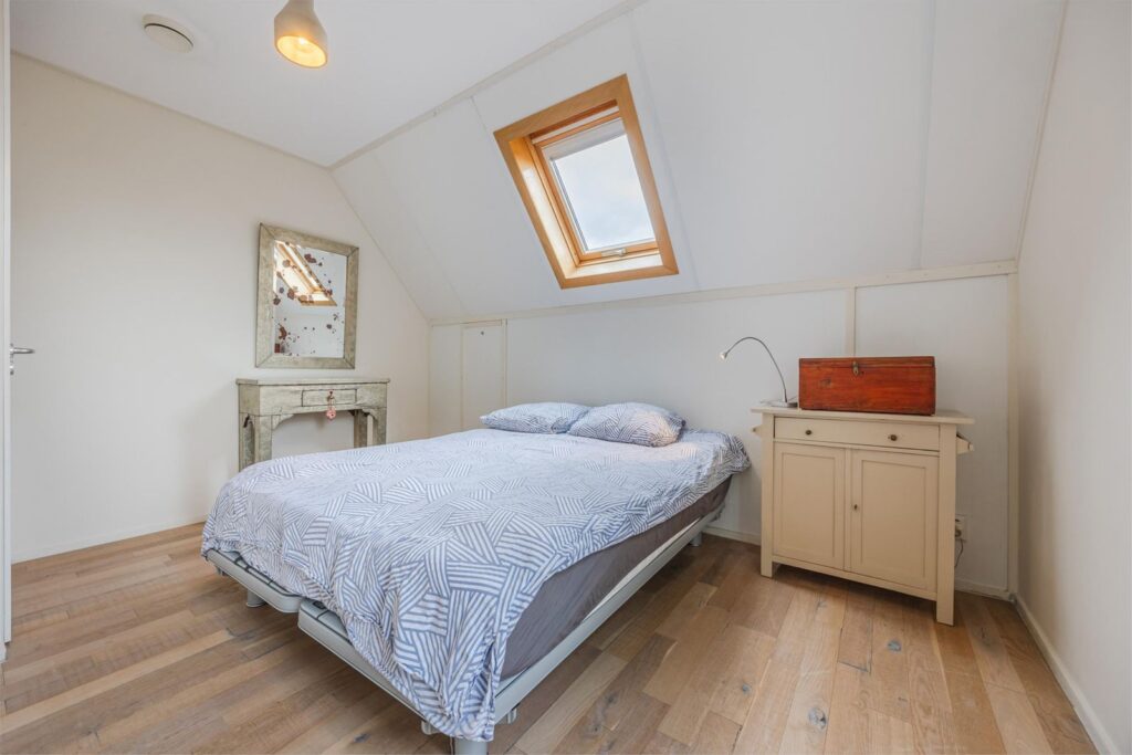 Op de bovenste verdieping is nog een vijfde slaapkamer met verwarming en wastafel . Aan de voorkant zijn 2 dakramen en aan de achterkant 1 dakraam. In de kast bevinden zich de warmte terugwin installatie en de omvormer van de zonnepanelen.