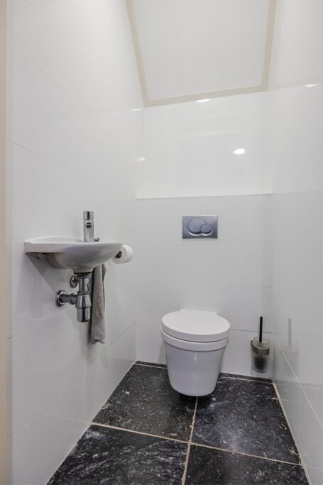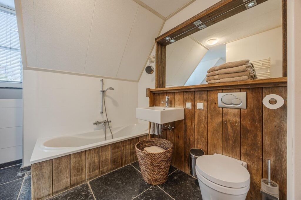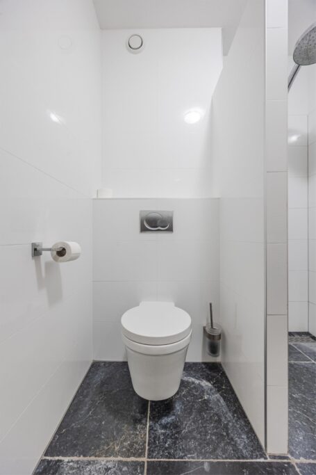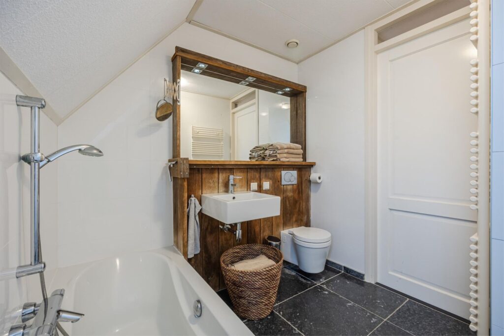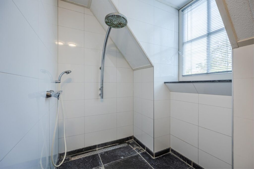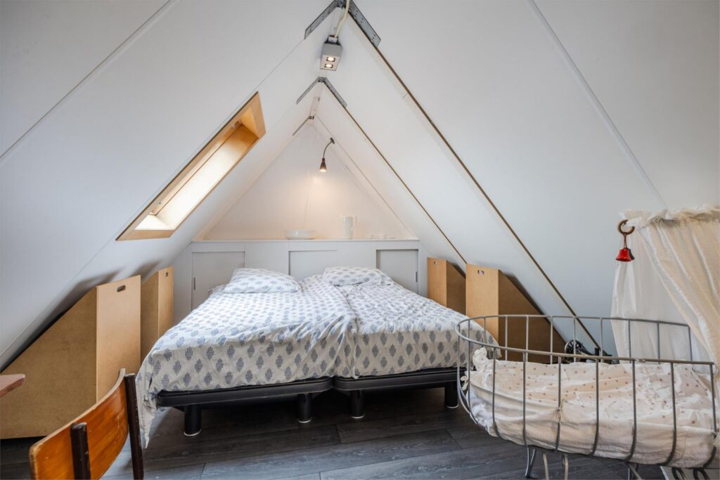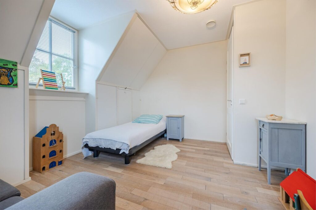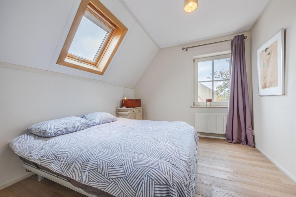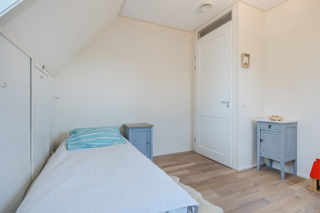Op de bovenste verdieping is nog een vijfde slaapkamer met verwarming en wastafel . Aan de voorkant zijn 2 dakramen en aan de achterkant 1 dakraam. In de kast bevinden zich de warmte terugwin installatie en de omvormer van de zonnepanelen.