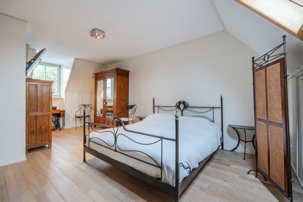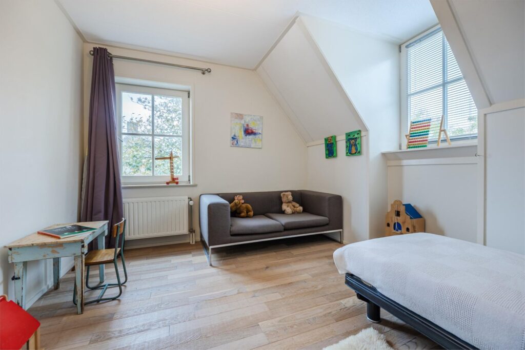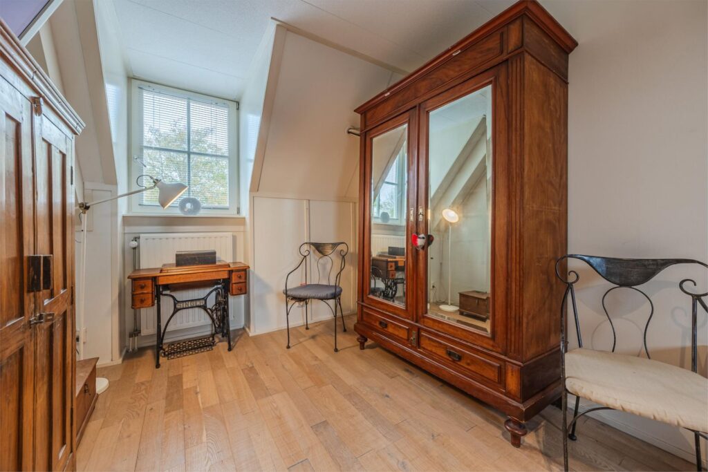 Op de eerste verdieping zijn 3 slaapkamers, allen met aan 2 zijden ramen. Ruime overloop met vaste trap naar de zolder een badkamer met douche, bad, wastafel en toilet en nog een los toilet. Op deze verdieping zijn 3 dakkapellen, 2 openslaande ramen en 2 dakramen.