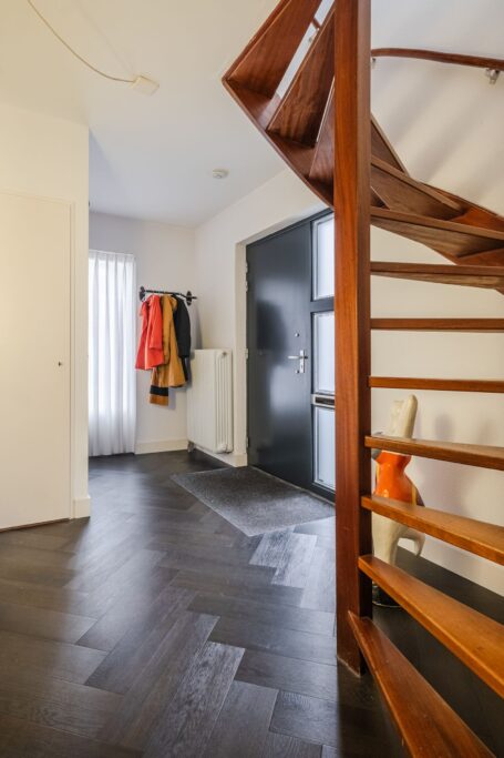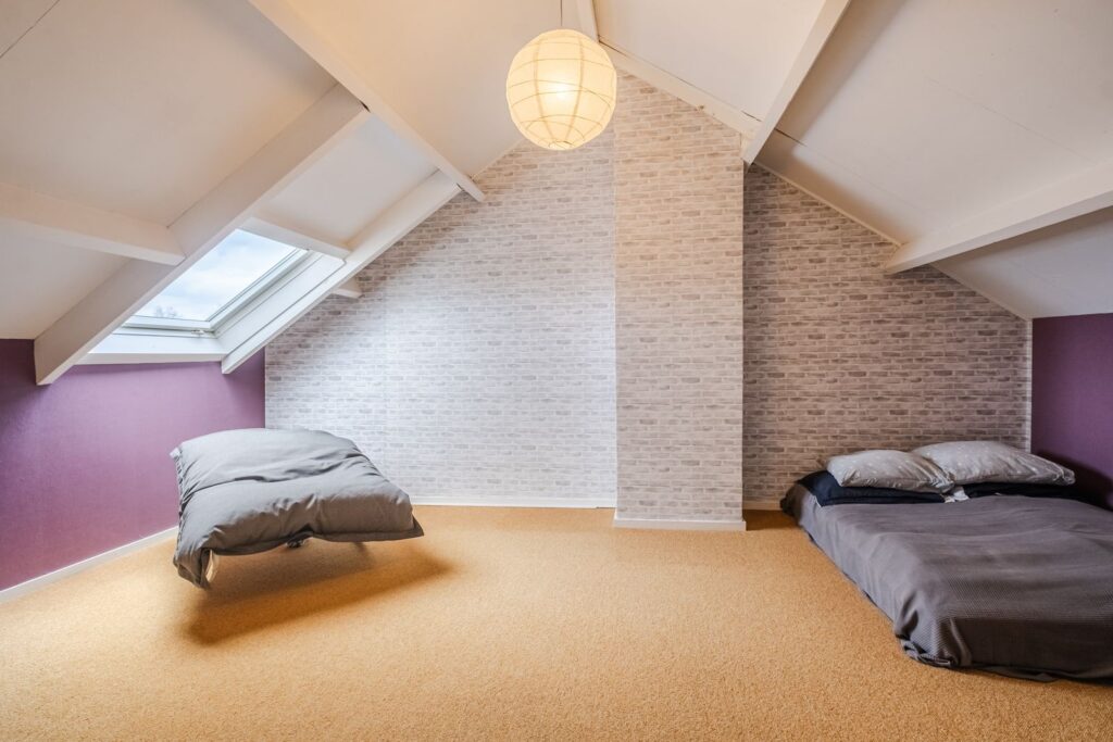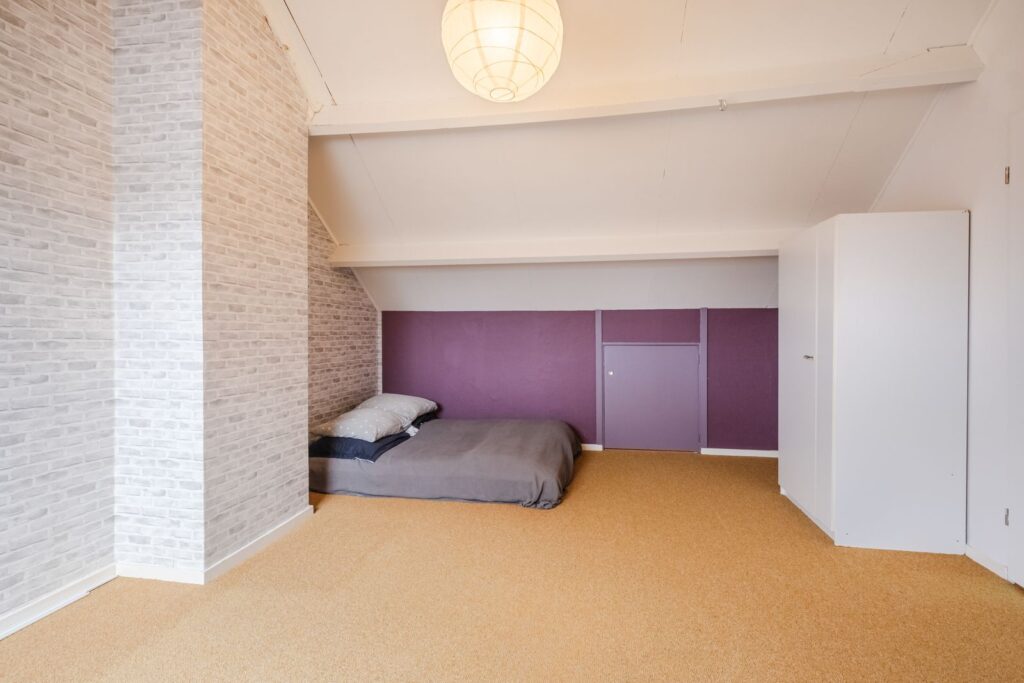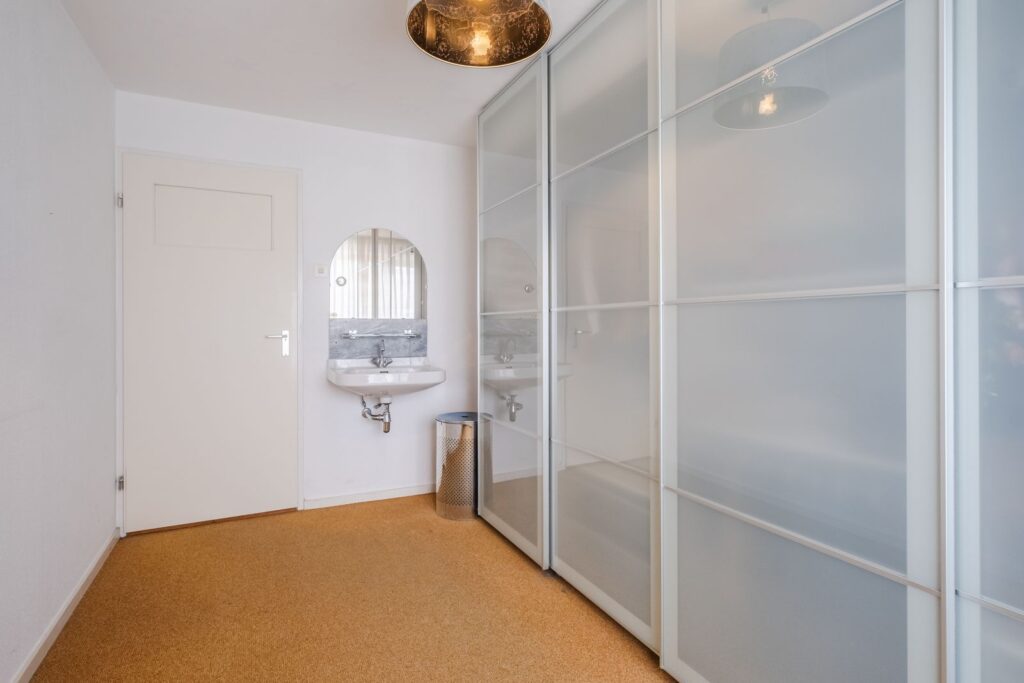 Vaste trap naar grote zolder met wastafel. Deze is voorzien van 2 dakramen. Hier bevind zich ook de cv ketel en de aansluitingen voor wasmachine en droger.