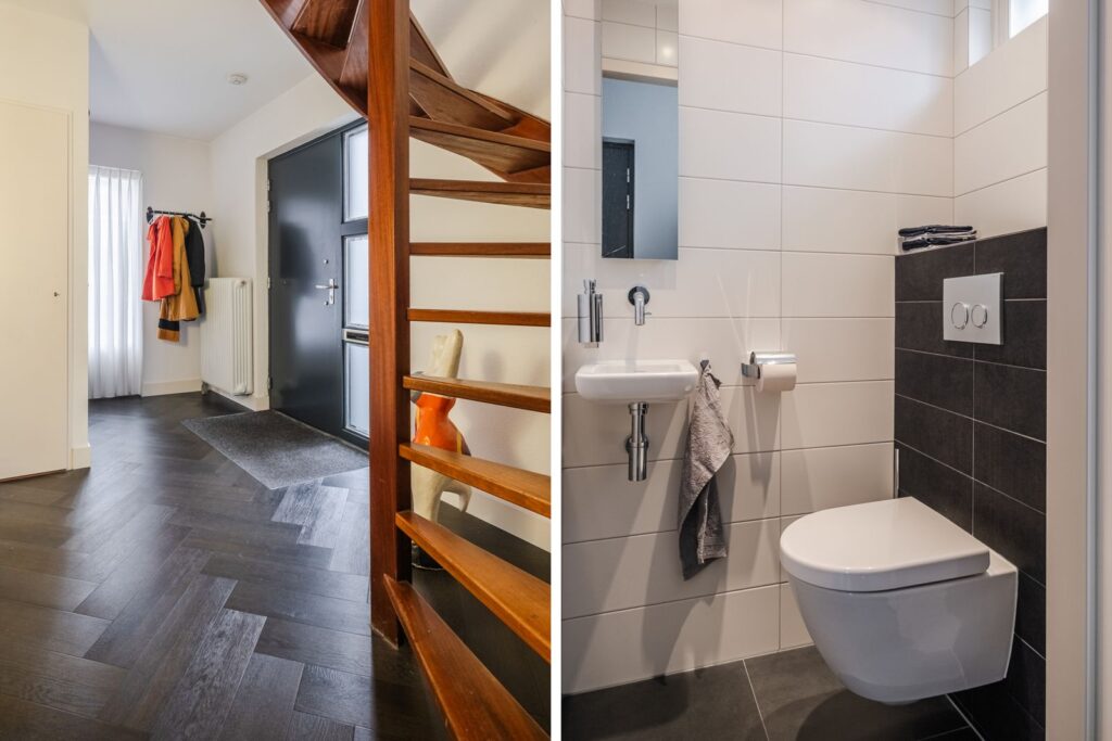 Mooie en praktische ingedeelde badkamer voorzien van hangend toilet en wastafel meubel.