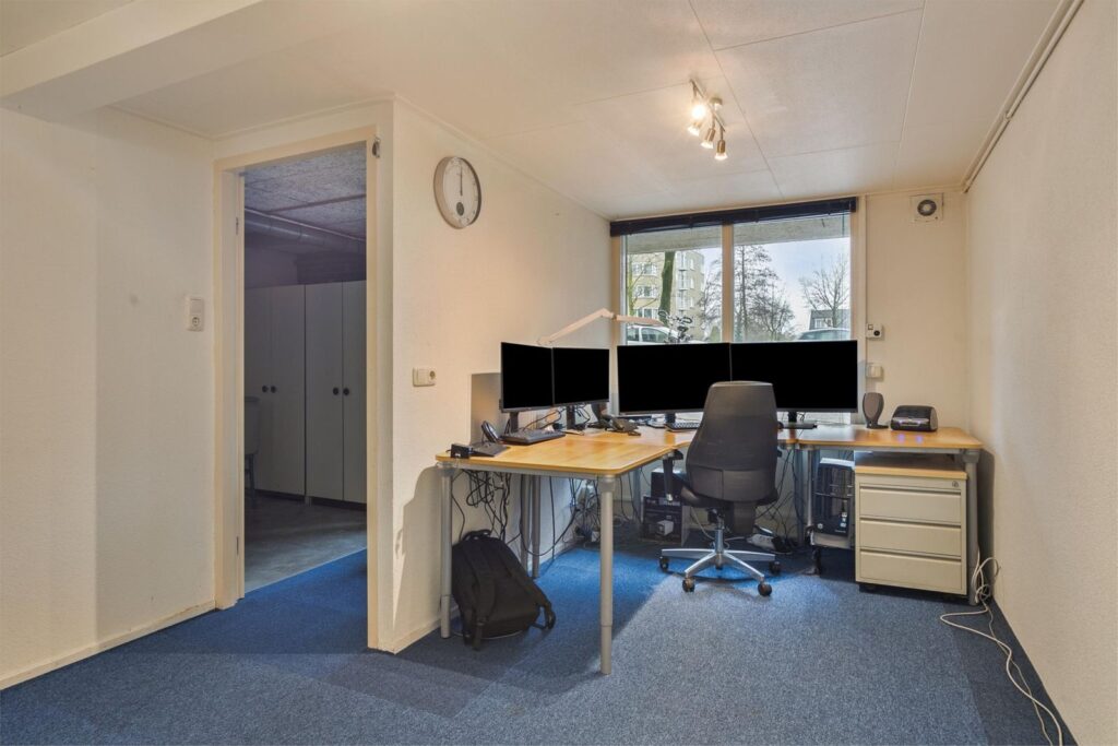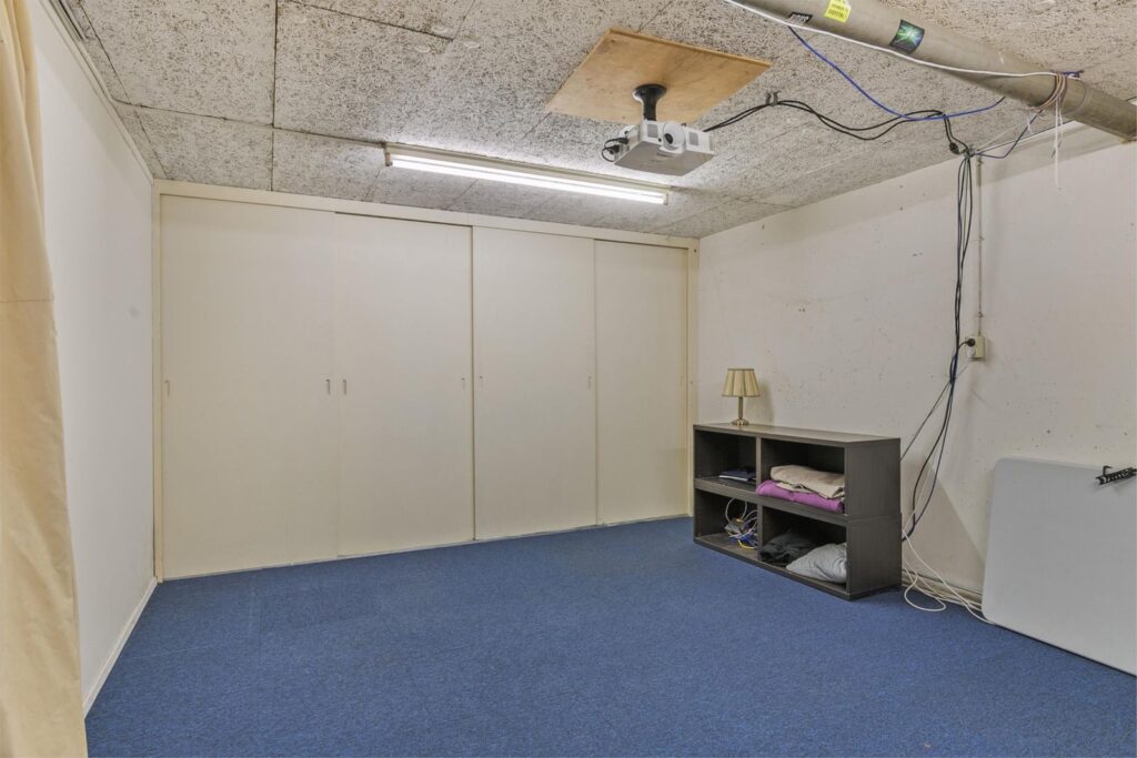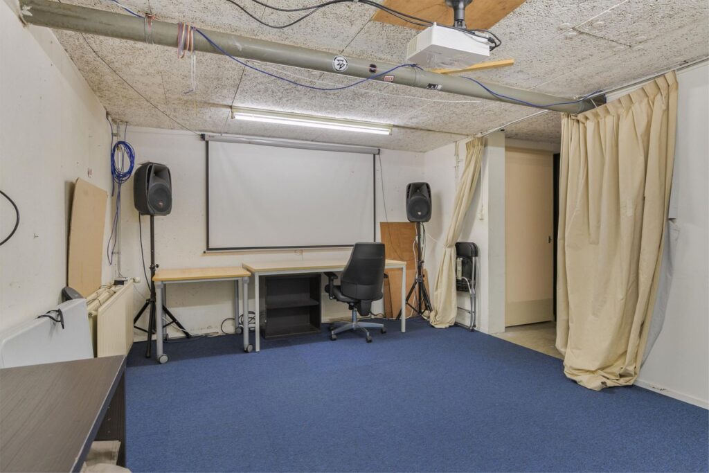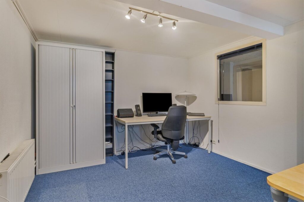 Via de woonkamer, of buitenom met een eigen ingang, kunt u naar het souterrain. Hier vindt u een kantoor en een bioscoop/party ruimte.