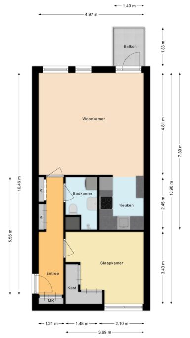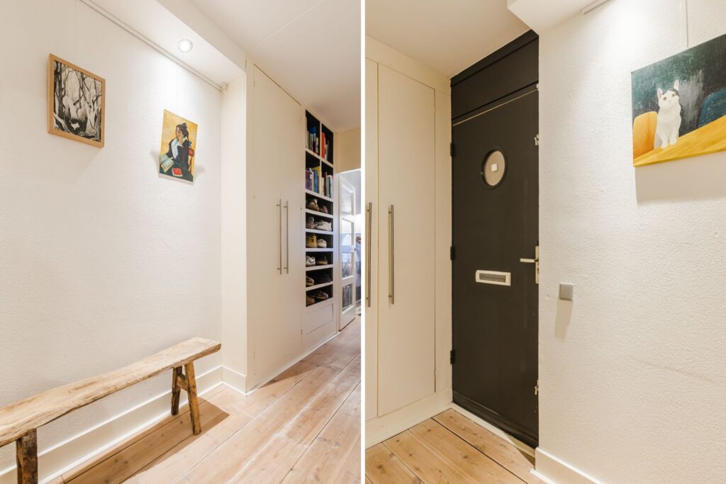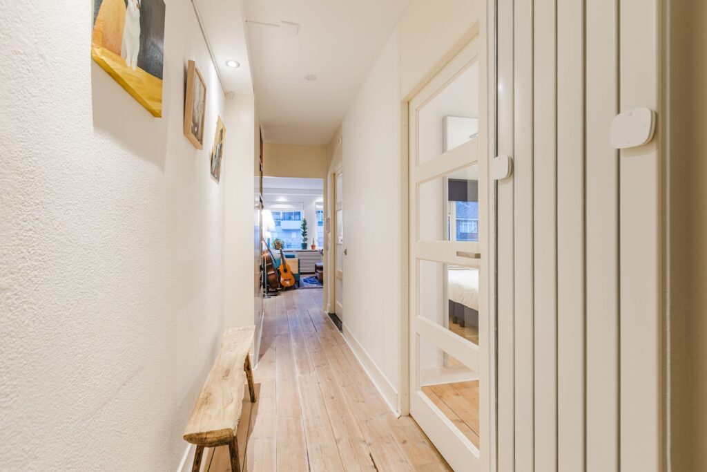 Bij binnenkomst in de woning komt u in de hal met een ingebouwde garderobekast en meterkast. De hal biedt toegang tot de slaapkamer, de badkamer en de woonkamer.