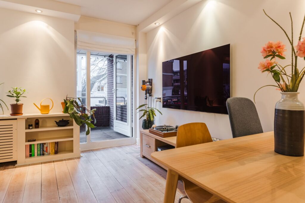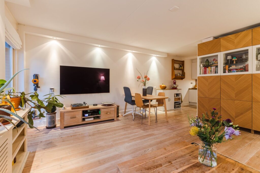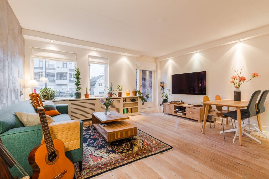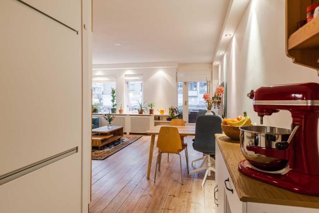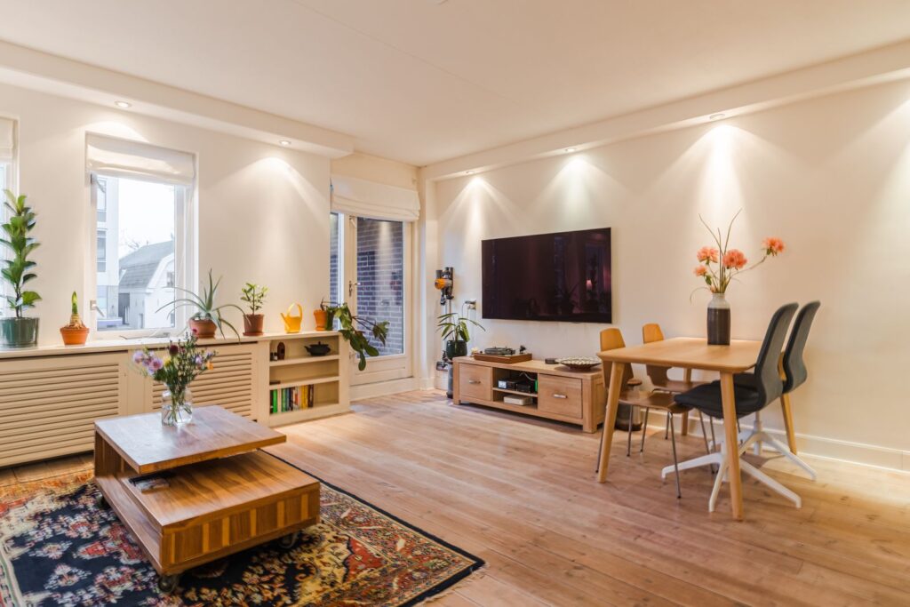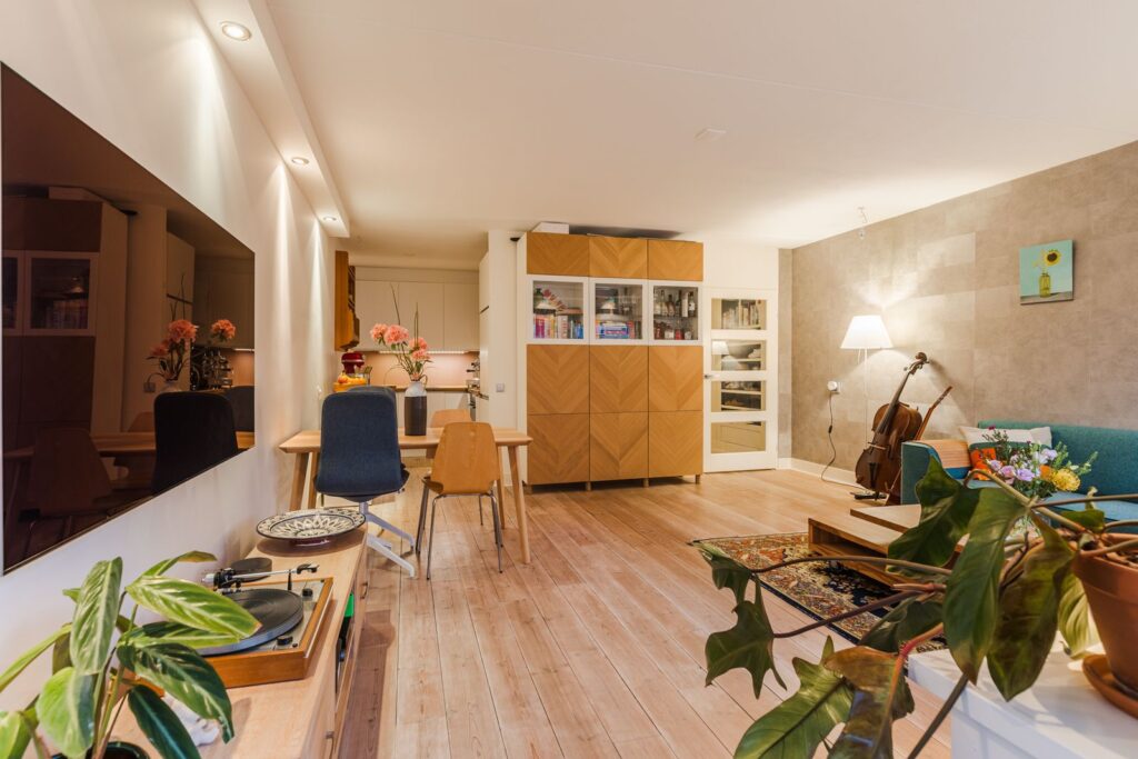 - Moderne afwerking: houten vloer, gestucte muren in de woonkamer, inbouwspotjes;