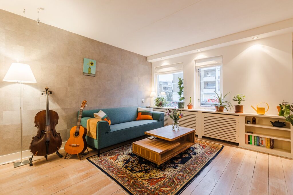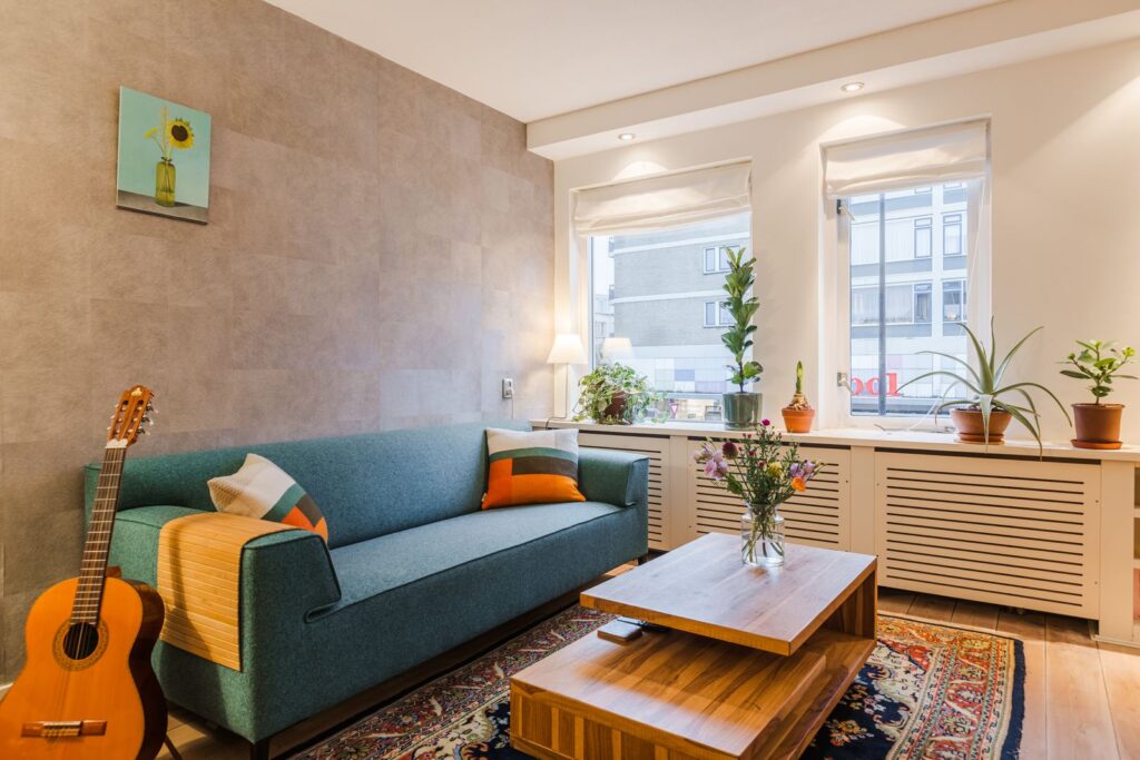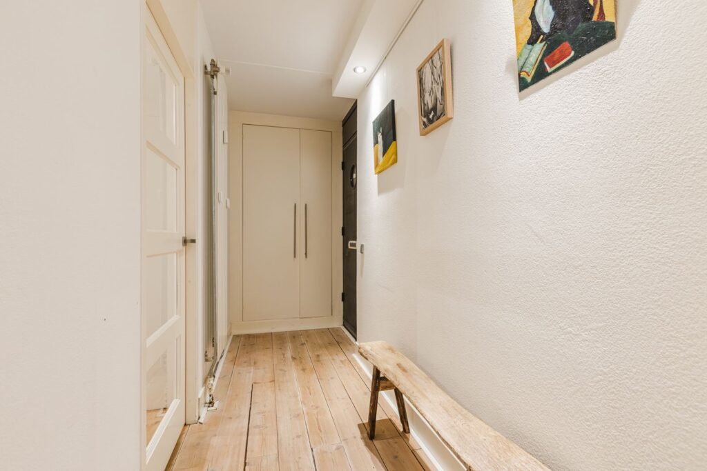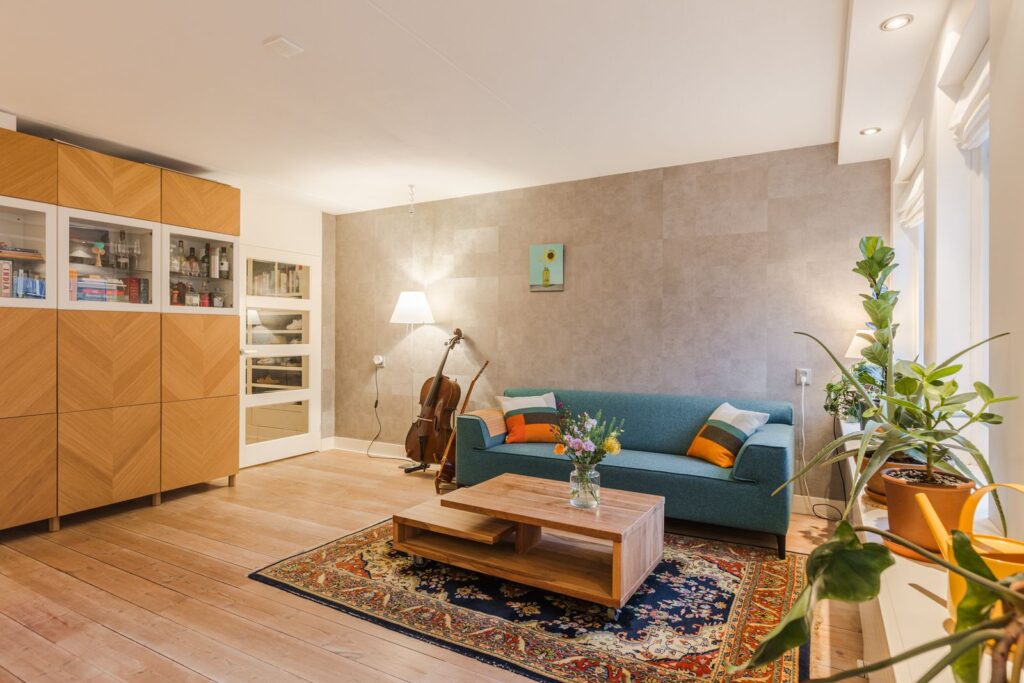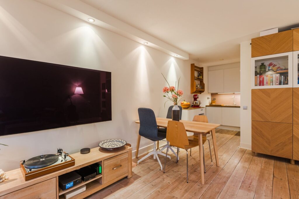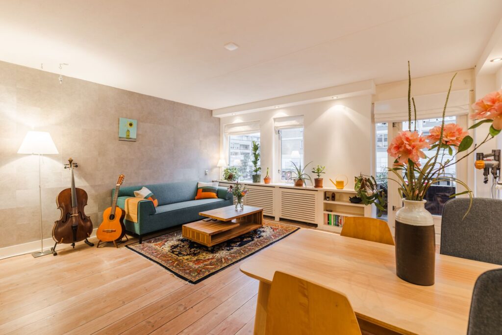 - Moderne afwerking: houten vloer, gestucte muren in de woonkamer, inbouwspotjes;