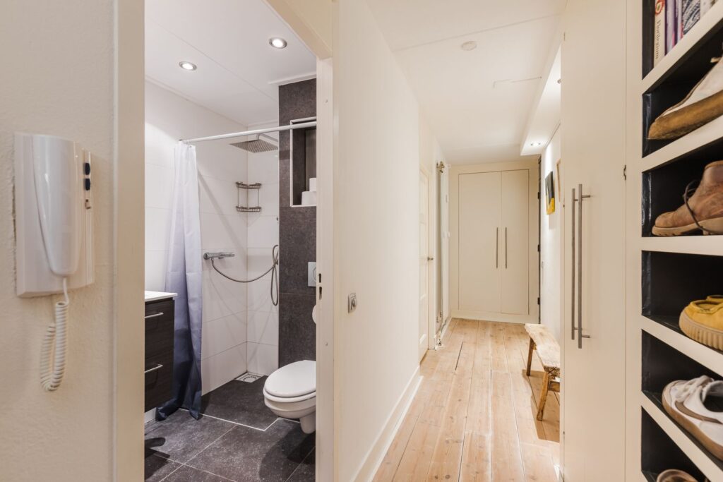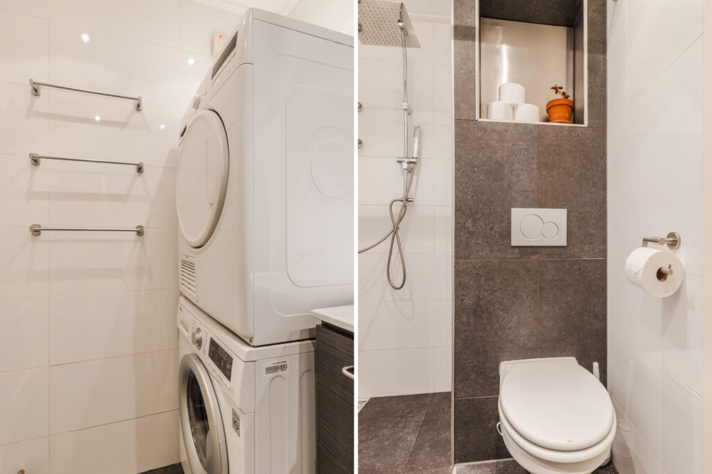 De moderne badkamer is uitgerust met een comfortabele regendouche, een toilet, wasmachineaansluiting en inbouwspotjes.