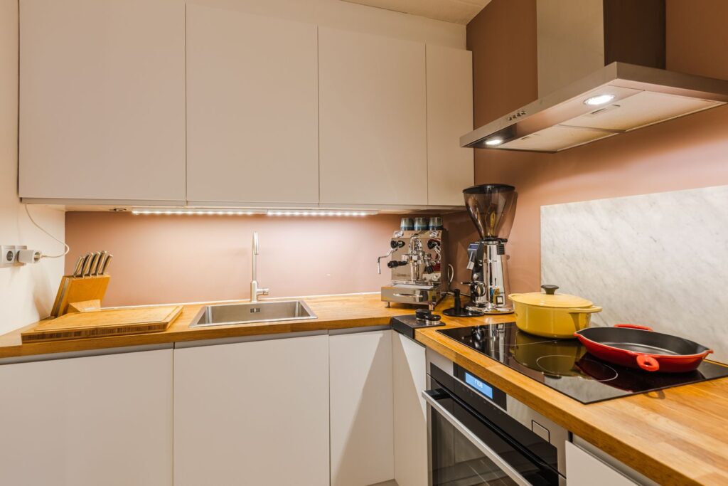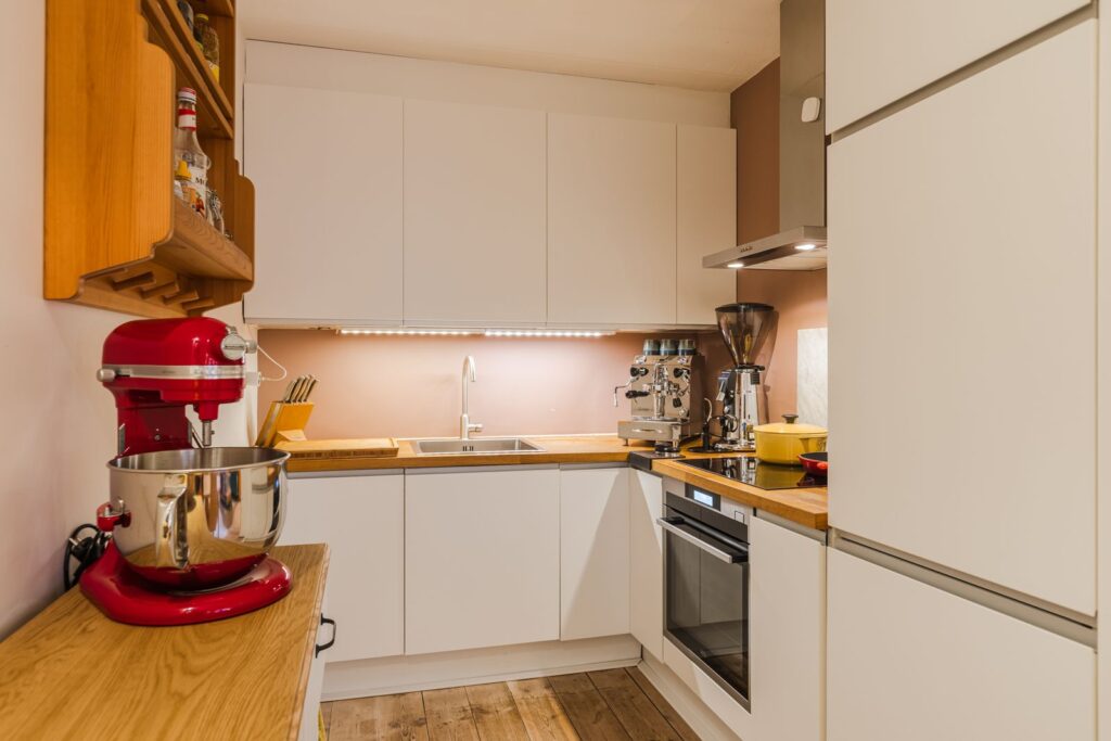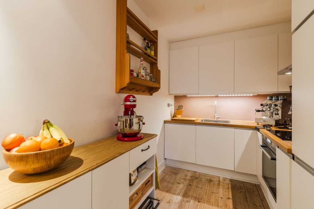 De moderne, open keuken is van alle gemakken voorzien en uitgerust met een vaatwasser, inductiekookplaat, een luxe oven (met zelfreiniging) en een afzuigkap. Het massief houten aanrechtblad geeft de keuken een warme uitstraling.