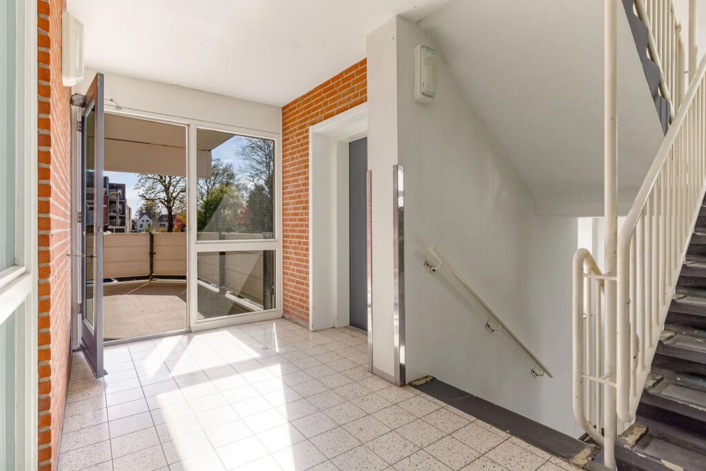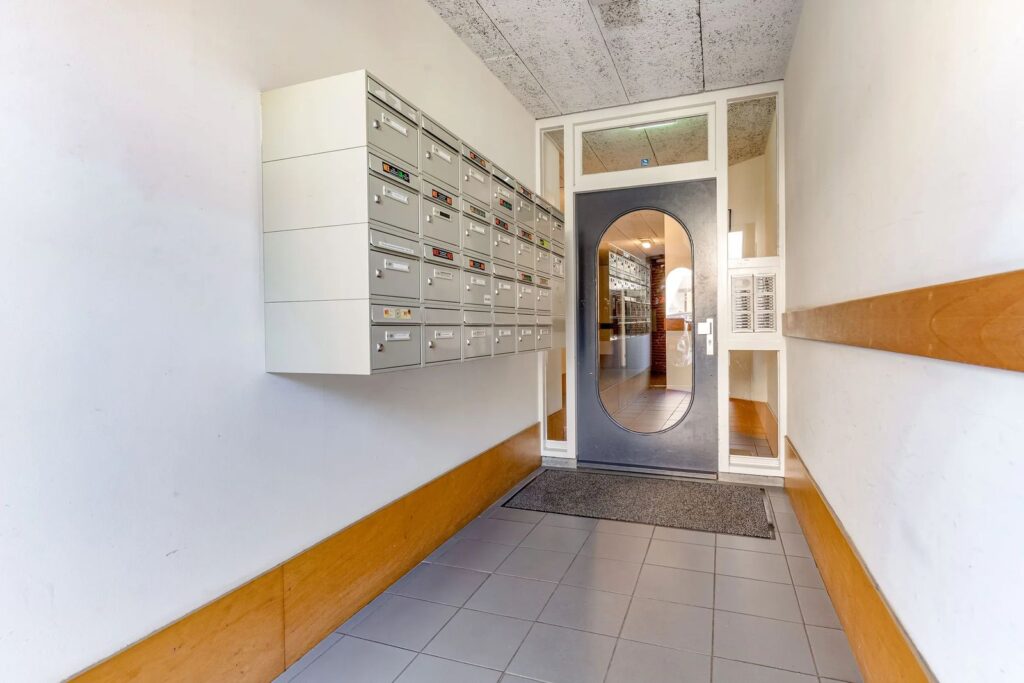 Afgesloten gezamenlijke entree met bellentableau, brievenbussen, trappenhuis en lift.