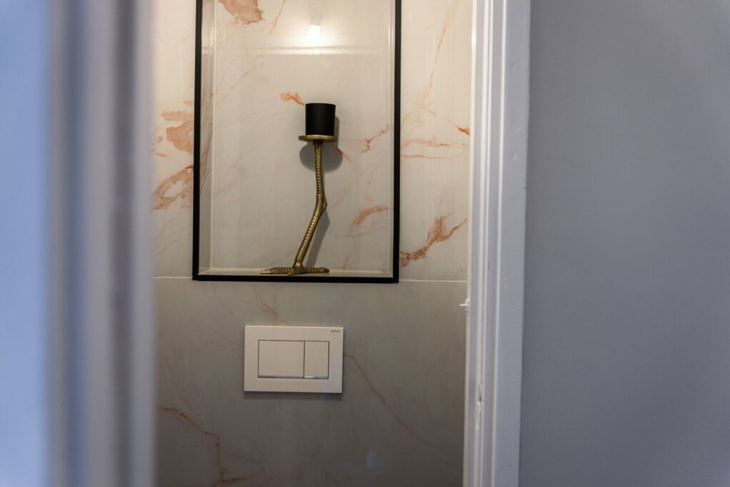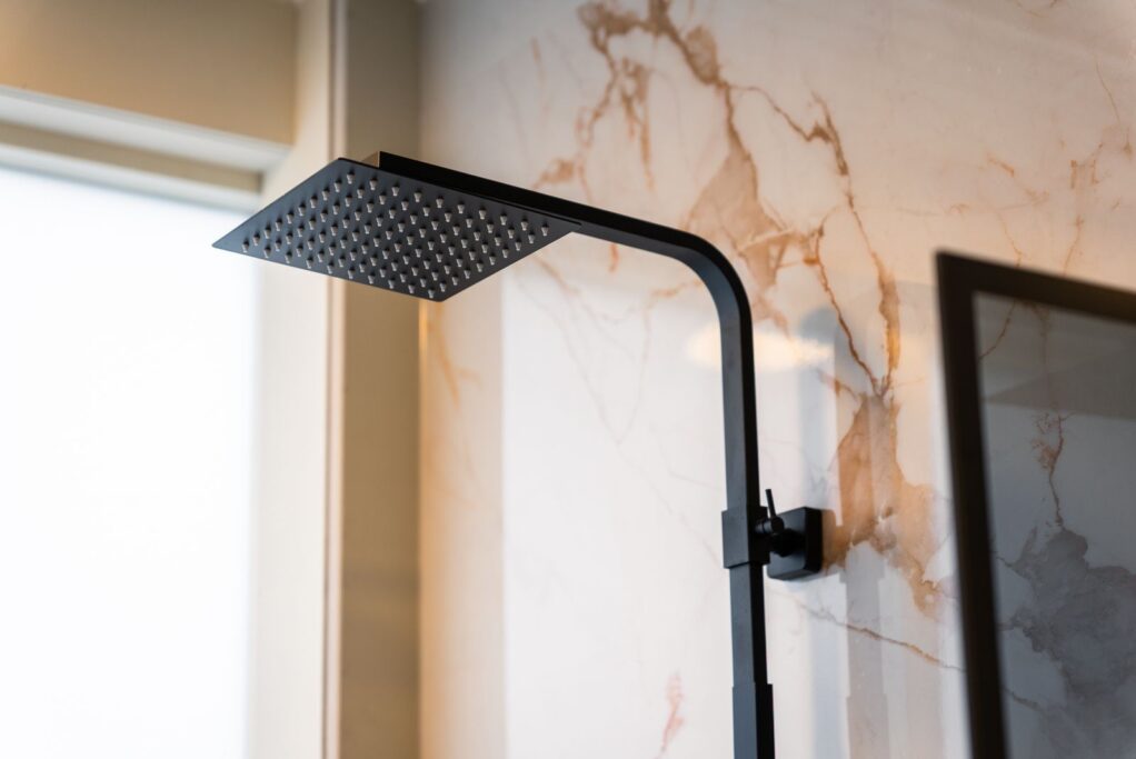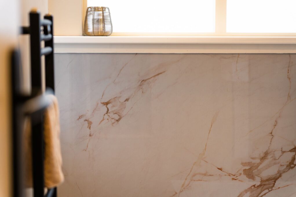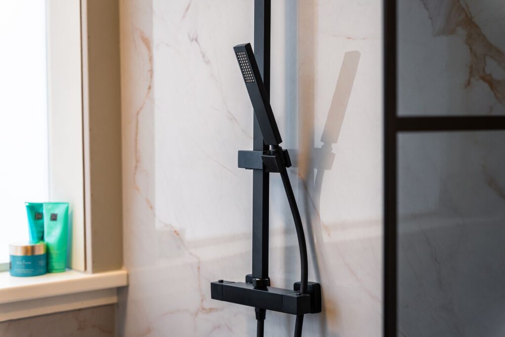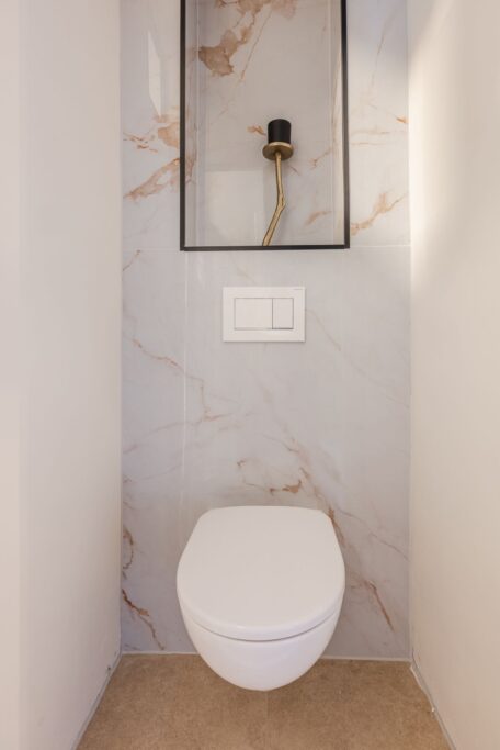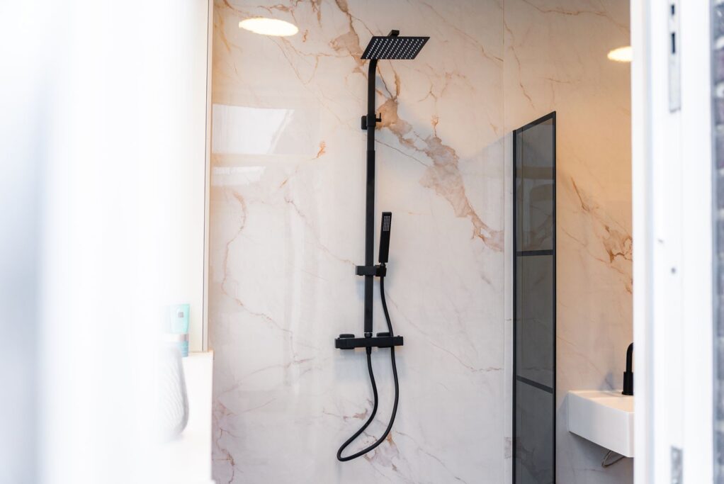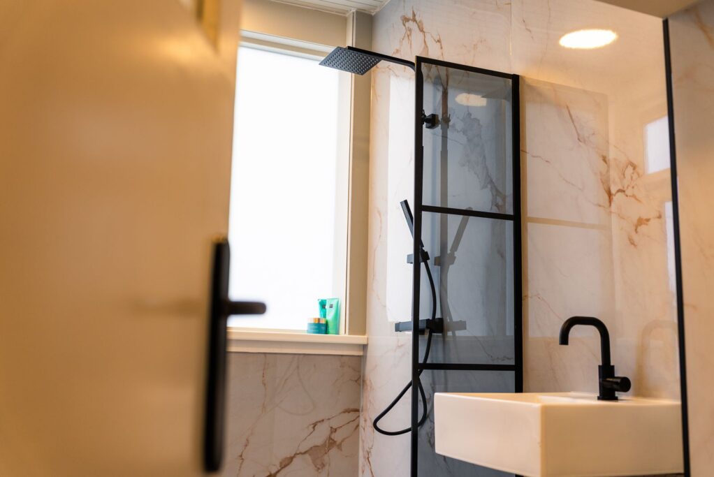 De badkamer is een absolute highlight. De marmerlook tegels geven de ruimte een elegante en luxe uitstraling, terwijl de zwarte afwerking op de kranen zorgt voor een moderne, hoogwaardige touch. De ruime inloopdouche is ontworpen als een eigen wellnessmoment en maakt van de badkamer een plek waar je elke dag opnieuw wilt beginnen en eindigen.