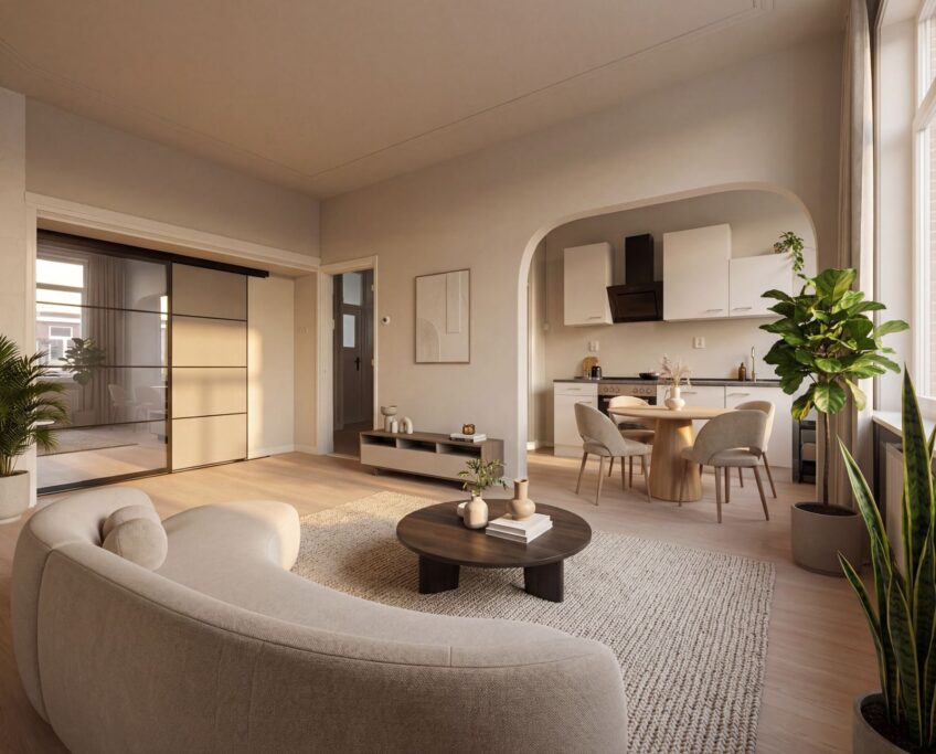 Zodra je binnenstapt merk je de ontspannen flow van de woning. De woonkamer vormt een open en uitnodigende leefruimte die door de grote ramen baadt in daglicht. De verbinding met de nieuwe keuken zorgt voor een fijne, natuurlijke indeling waarin je moeiteloos leeft, werkt en ontspant.