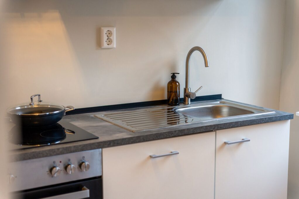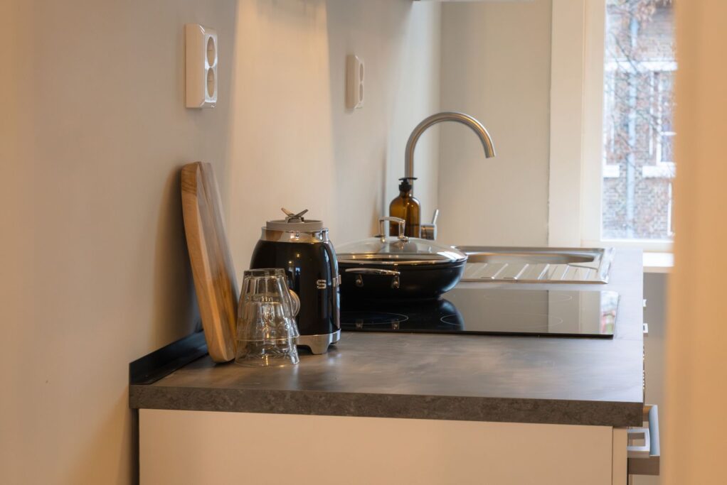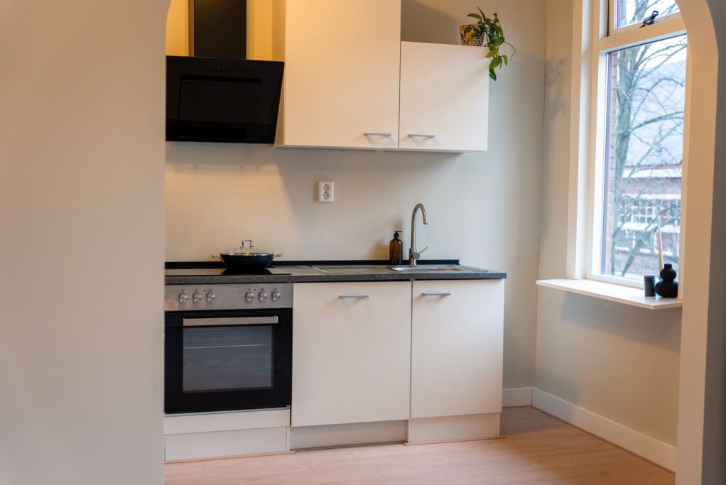 De keuken is strak, modern en praktisch ingericht, met een rustige uitstraling die naadloos aansluit op de rest van de woning. Voorzien van een oven, vaatwasser en voldoende opbergruimte is dit een fijne plek om te koken zonder dat het de sfeer van de ruimte overneemt. Het geheel voelt clean, licht en functioneel, precies zoals bij een instapklare moderne woning past.