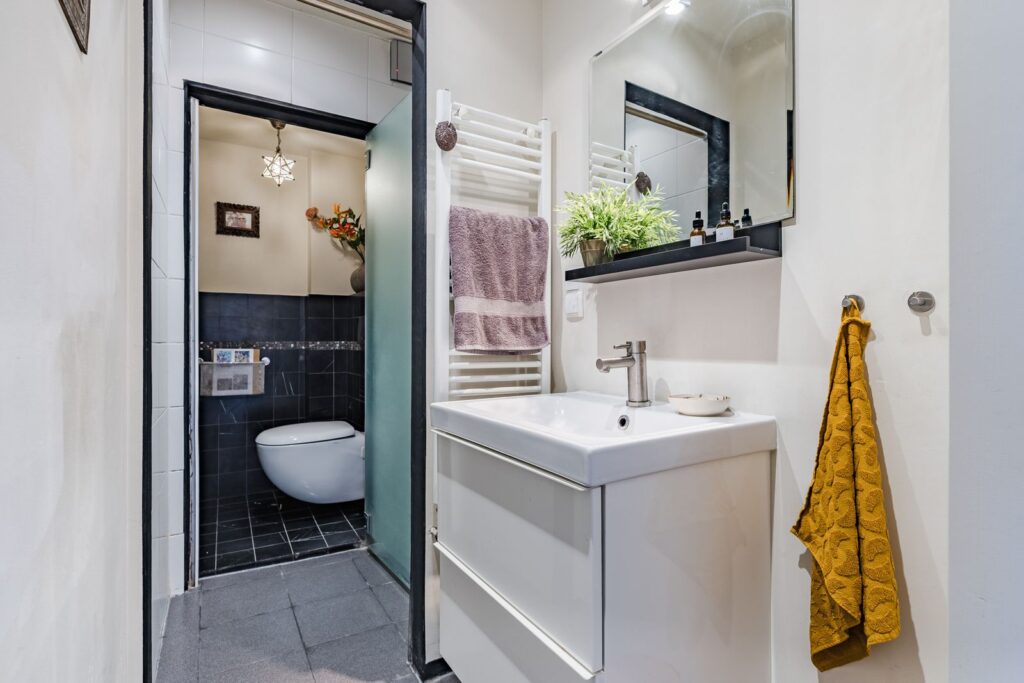 Via het trappenhuis dat je deelt met alleen de bovenburen kom je de woning op de tweede verdieping binnen. Dankzij de grote raampartijen aan voor- en achterkant valt er veel natuurlijk licht de woning binnen. De woonkamer en de slaapkamer zijn aan de voorzijde gesitueerd. De woonkamer heeft openslaande ramen op het zonnige zuidoosten. De badkamer ligt centraal in de woning en beschikt over een wastafelmeubel, handdoekradiator, douche en zwartmarmeren toilet.