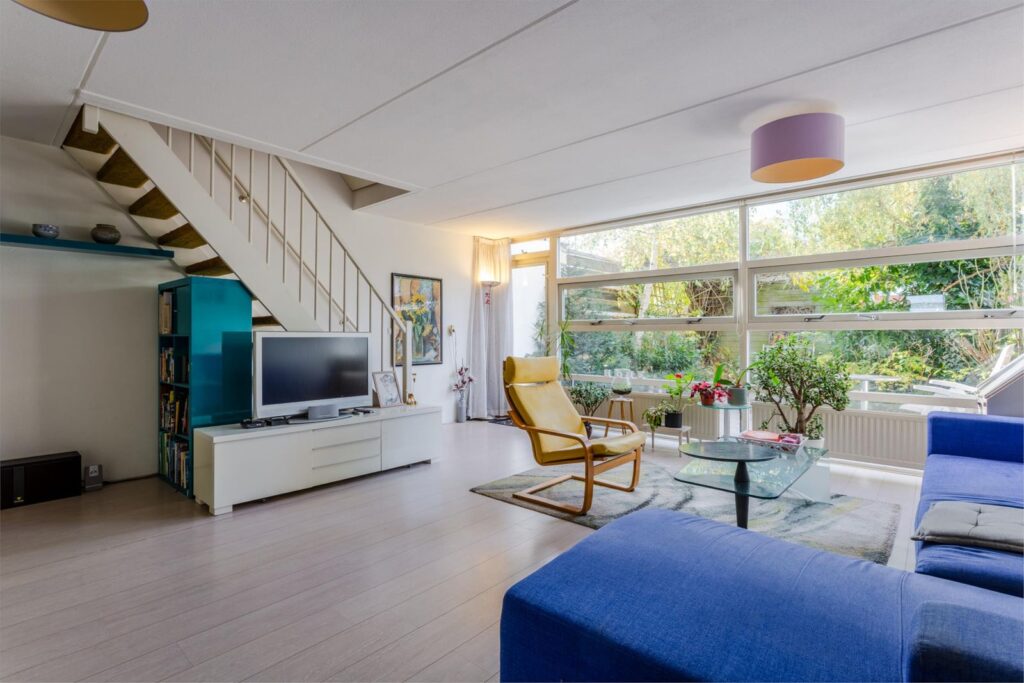 Woonkamer met grote raampartijen, tuindeur en open trap naar de verdieping.