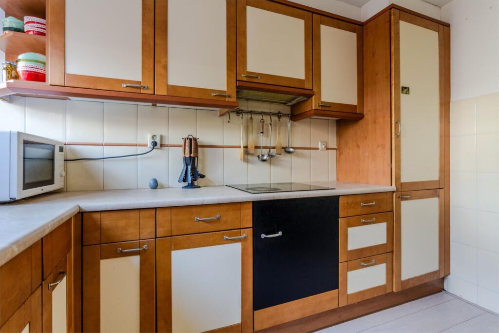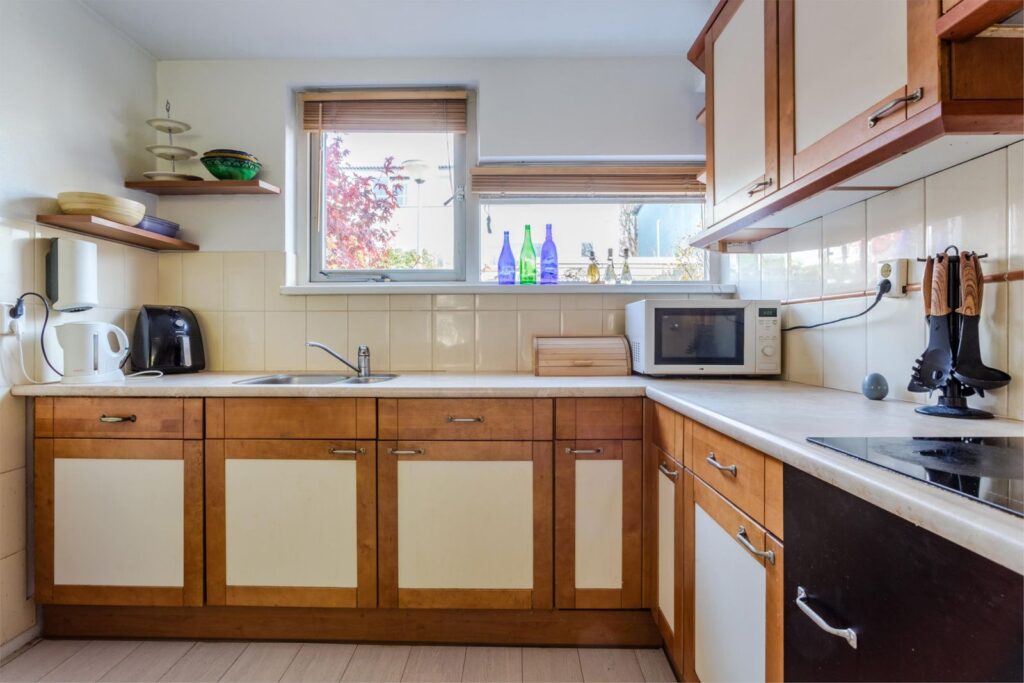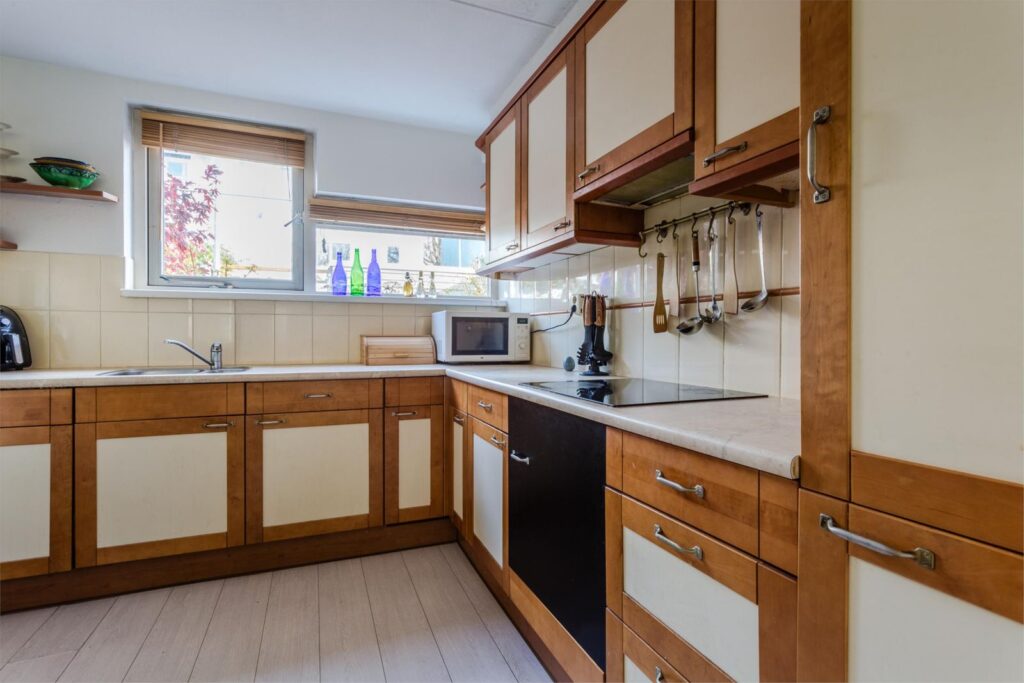 L-vormige open keuken voorzien van diverse inbouwapparatuur o.a. vaatwasser, combikoelkast en inductie kookplaat.