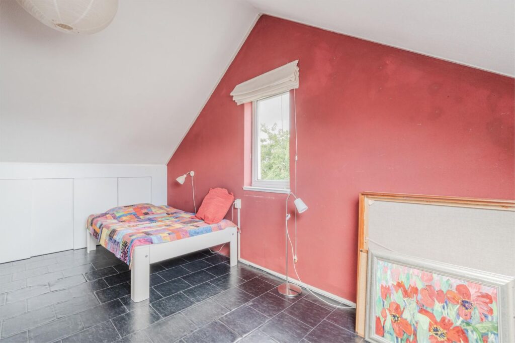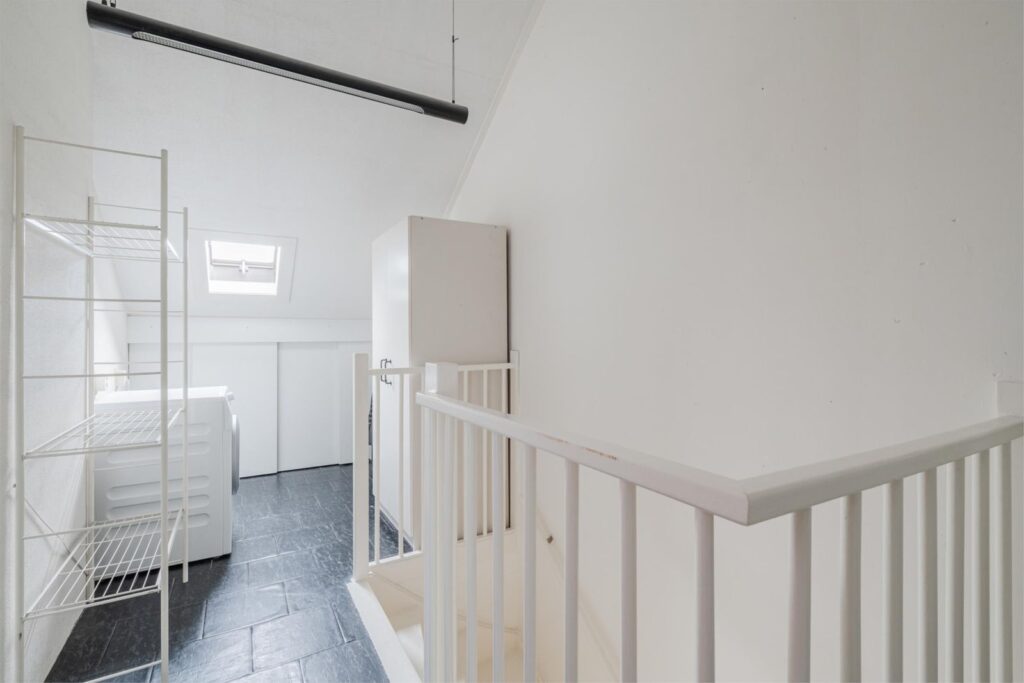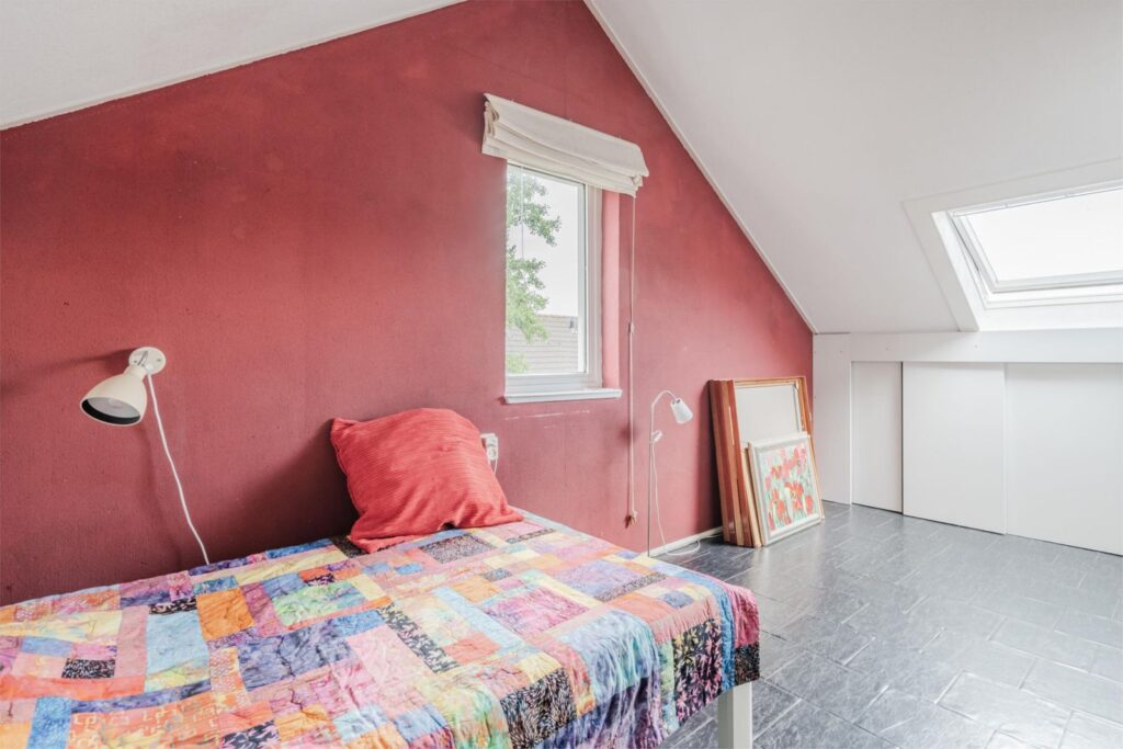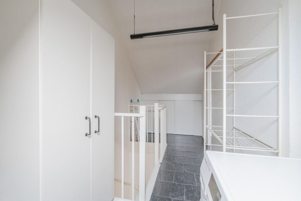 Ruime zolderverdieping met een vierde slaapkamer voorzien van een dak- én zijraam voor veel daglicht. Op de overloop zijn de aansluitingen voor wasmachine en droger aanwezig, plus extra bergruimte achter de knieschotten.