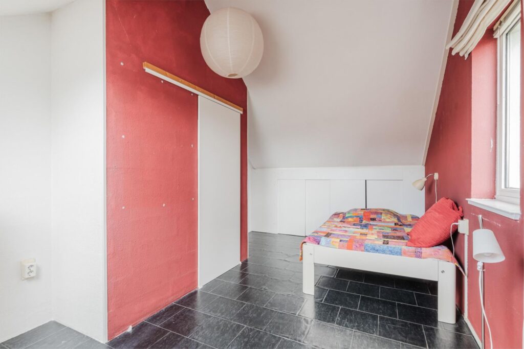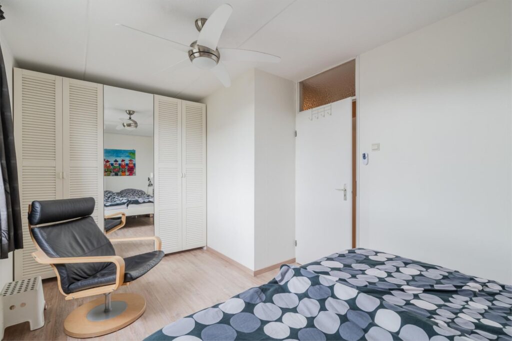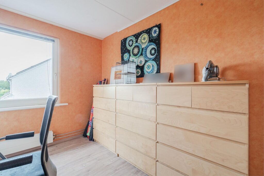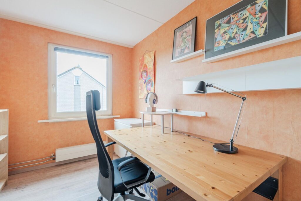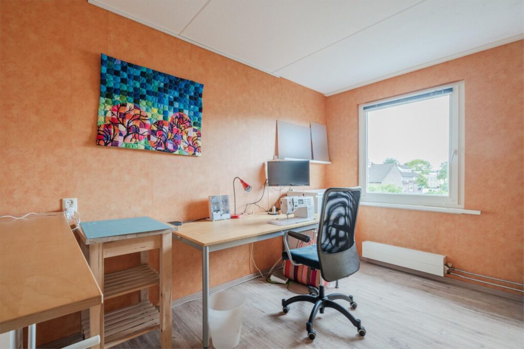Ruime zolderverdieping met een vierde slaapkamer voorzien van een dak- én zijraam voor veel daglicht. Op de overloop zijn de aansluitingen voor wasmachine en droger aanwezig, plus extra bergruimte achter de knieschotten.
