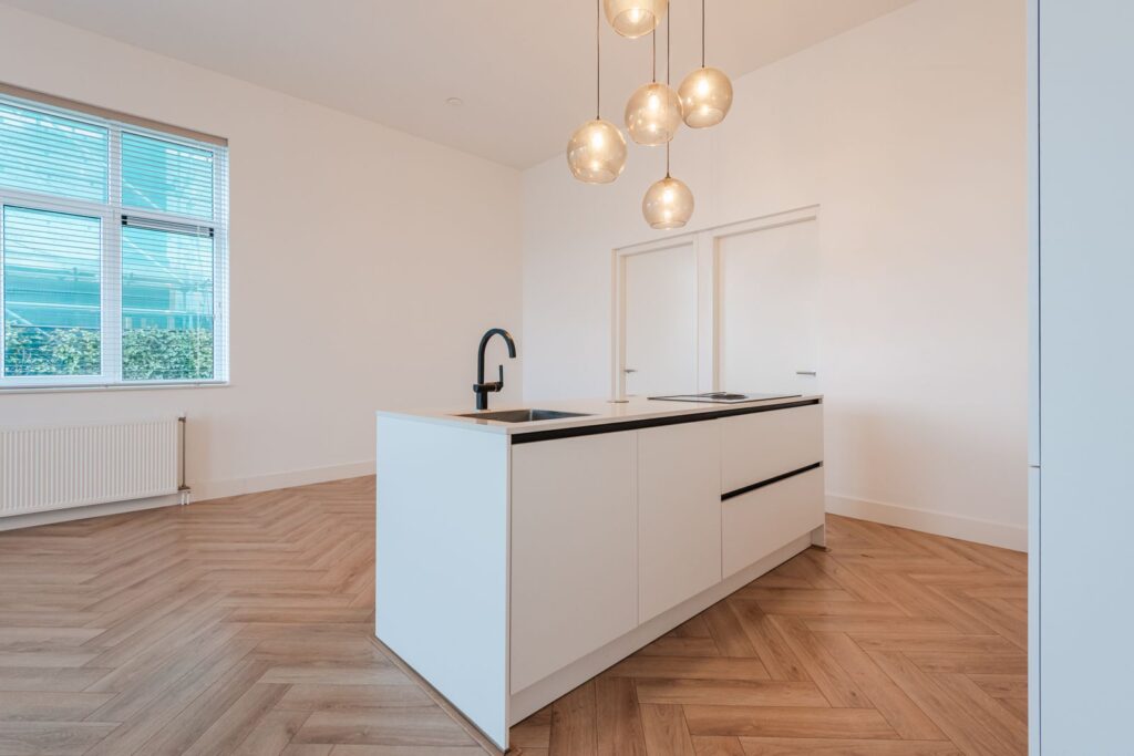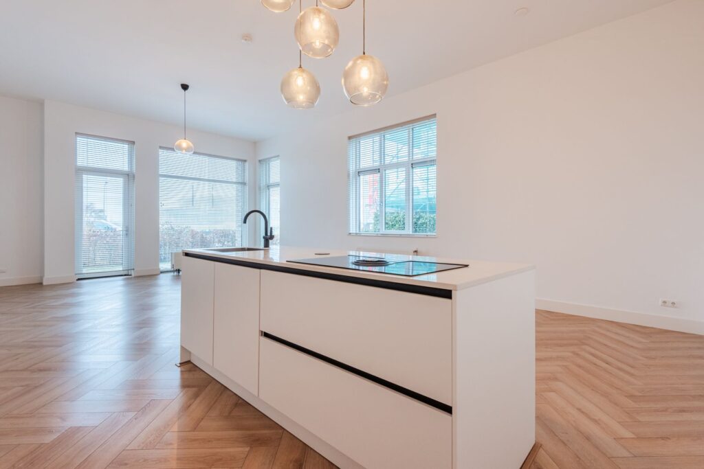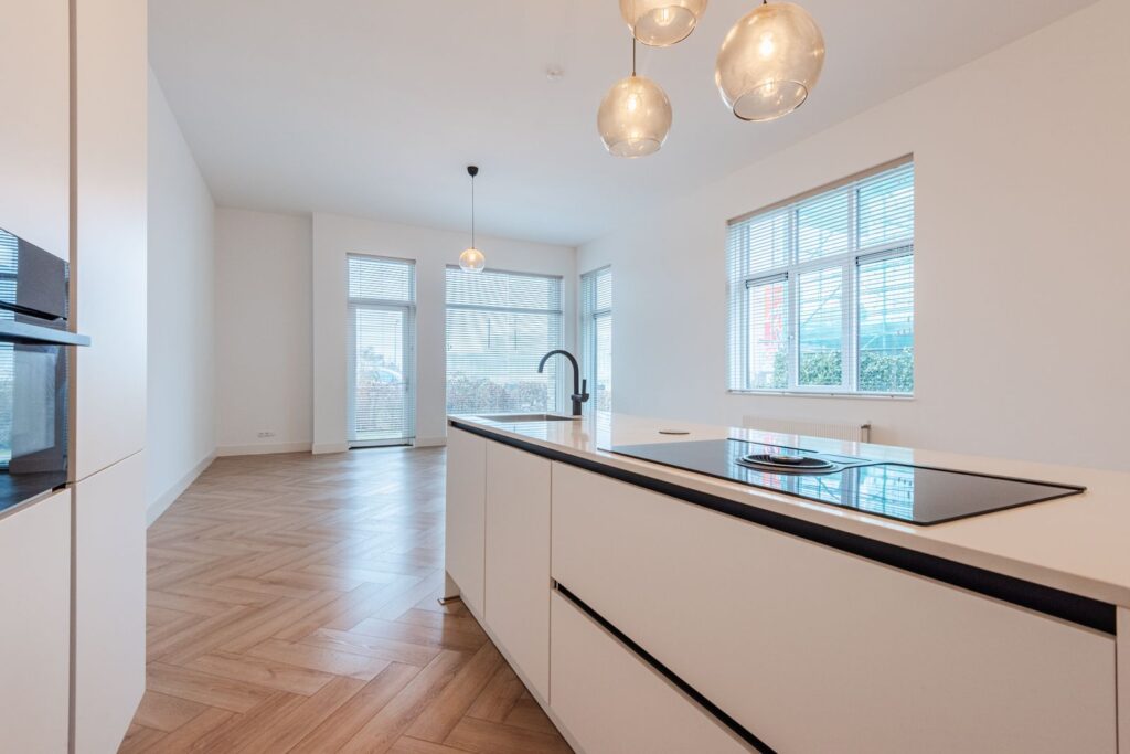 •Spacious living area: A generous living room with an open design kitchen and kitchen island (approx. 9.24 x 4.93 m). The kitchen is equipped with premium AEG appliances, including an integrated cooktop with built-in extraction, a dishwasher, and a fridge-freezer. From the living room, you have access to a cozy terrace (approx. 5 x 2 m).