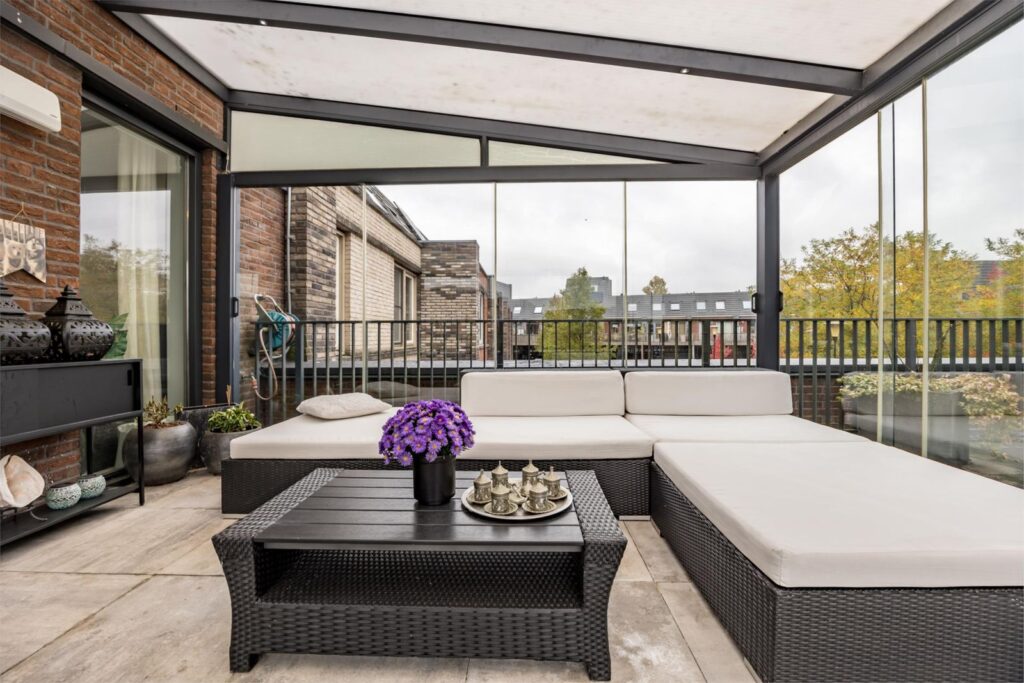 - Buiten: waterrand-terras ca. 60,7 m² met serre | dakterras ca. 27,5 m² met serre (ca. 5×4 m) | extra zonneterras ca. 35 m² (zuid)