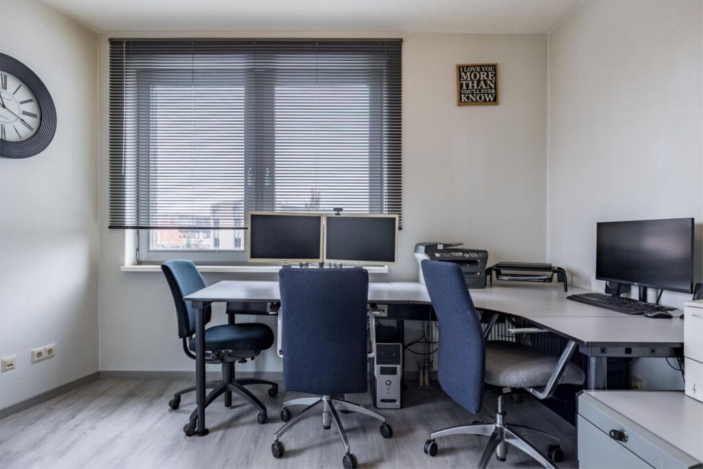 Op de 1e verdieping liggen twee volwaardige (slaap)kamers, waarvan er één nu gebruikt wordt als kantoor/leef-/hobbyruimte. Vanuit hier stap je zó het eigen dakterras van ca. 27,5 m² op, met een serre (ca. 5×4 m) en een stenen barbecue: een tweede buitenwoonkamer, beschut en bijna het hele jaar door te gebruiken. De verdiepingen zijn afgewerkt met laminaat.