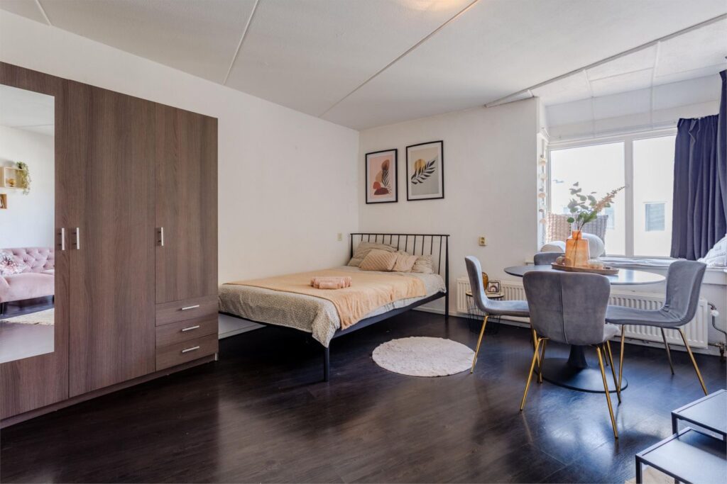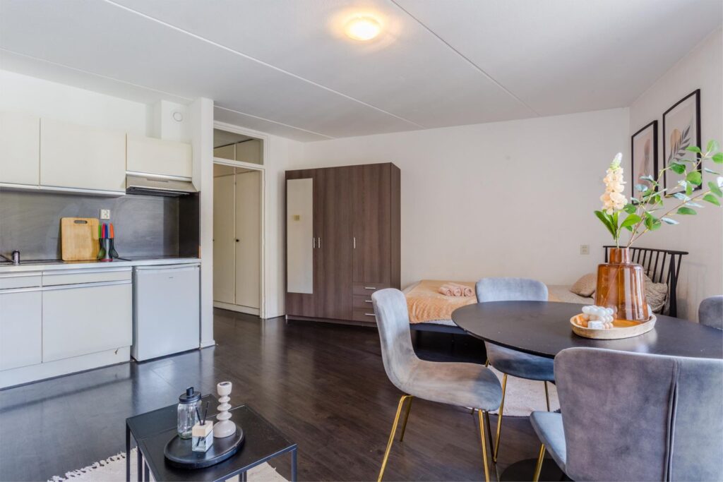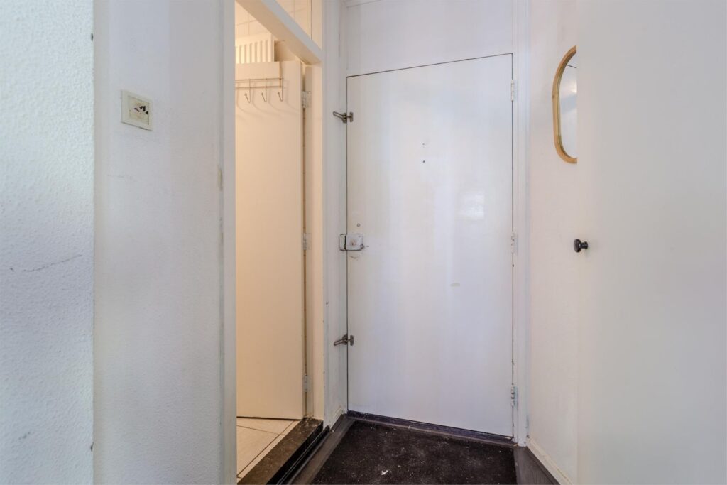 Entree, hal, lichte en praktisch ingedeelde woonkamer met ruimte voor een gezellige zithoek, een slaapgedeelte en de open keuken. De badkamer is functioneel en voorzien van een douche, toilet, wastafel en een aansluiting voor de wasmachine. Via de woonkamer stap je zo het balkon op: een fijn plekje om te ontspannen met een kop koffie of een goed boek.