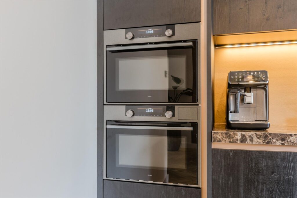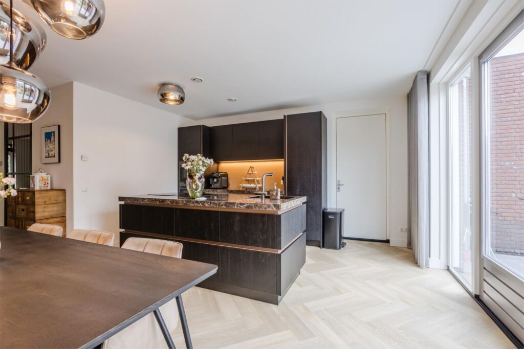 De keuken is voorzien van alle denkbare inbouwapparatuur, een kookeiland en veel opbergruimte. Extra praktisch: vanuit de keuken heb je direct toegang tot de gemetselde berging.