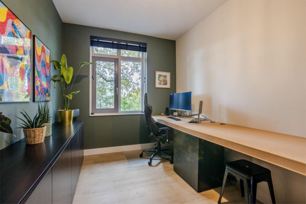 De eerste verdieping telt drie slaapkamers, waarvan één momenteel in gebruik is als thuiswerkplek. De luxe badkamer beschikt over een vrijstaand bad, dubbele wastafel en tweede toilet.