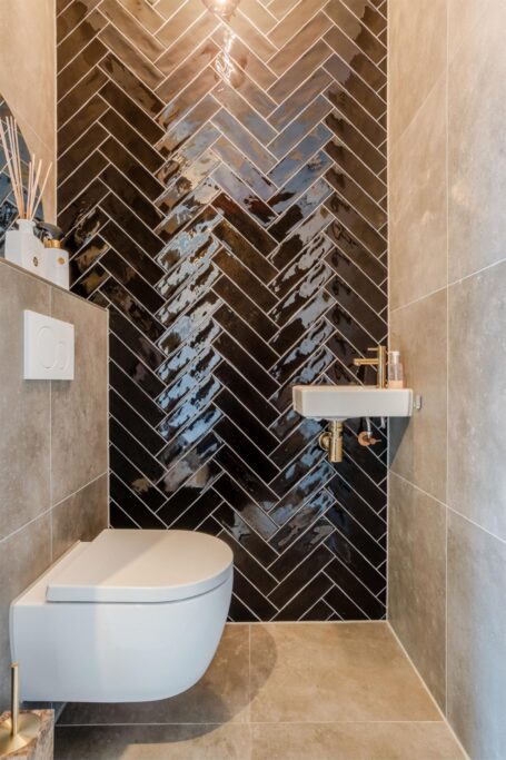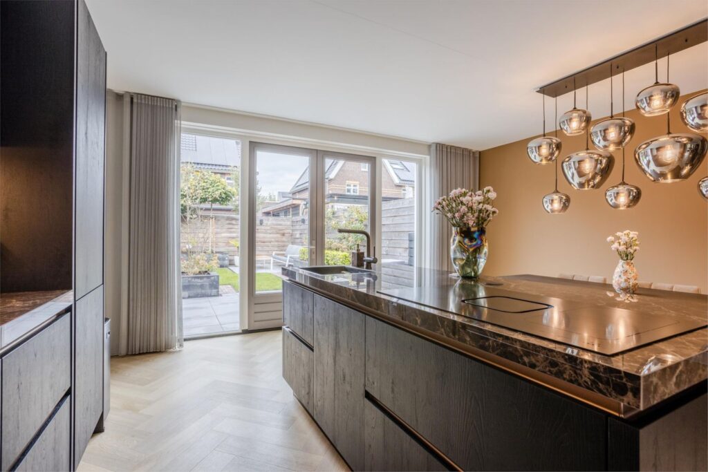 Bij binnenkomst valt meteen de ruime hal op met verlichte trap, maatwerk garderobe en luxe toilet. Via een kamerhoge zwartstalen deur kom je in de lichte woon- en eetkamer met moderne open keuken.