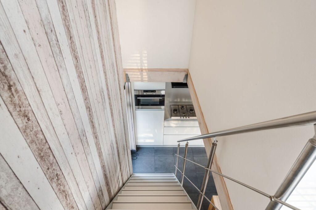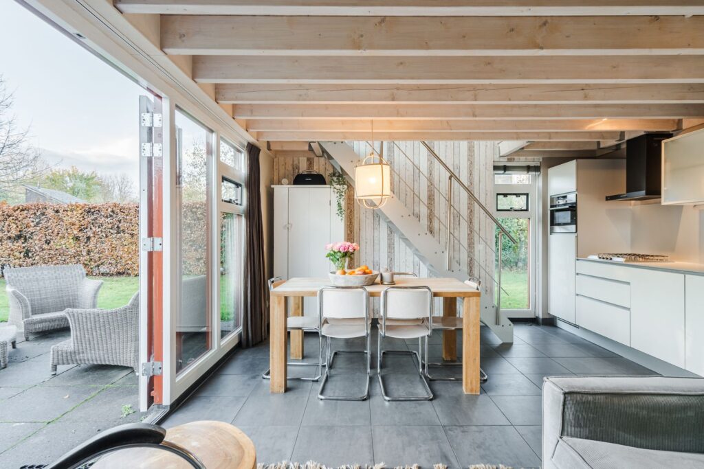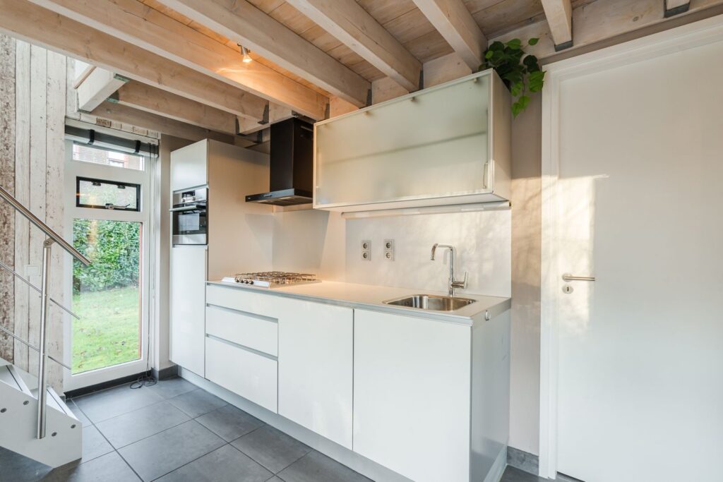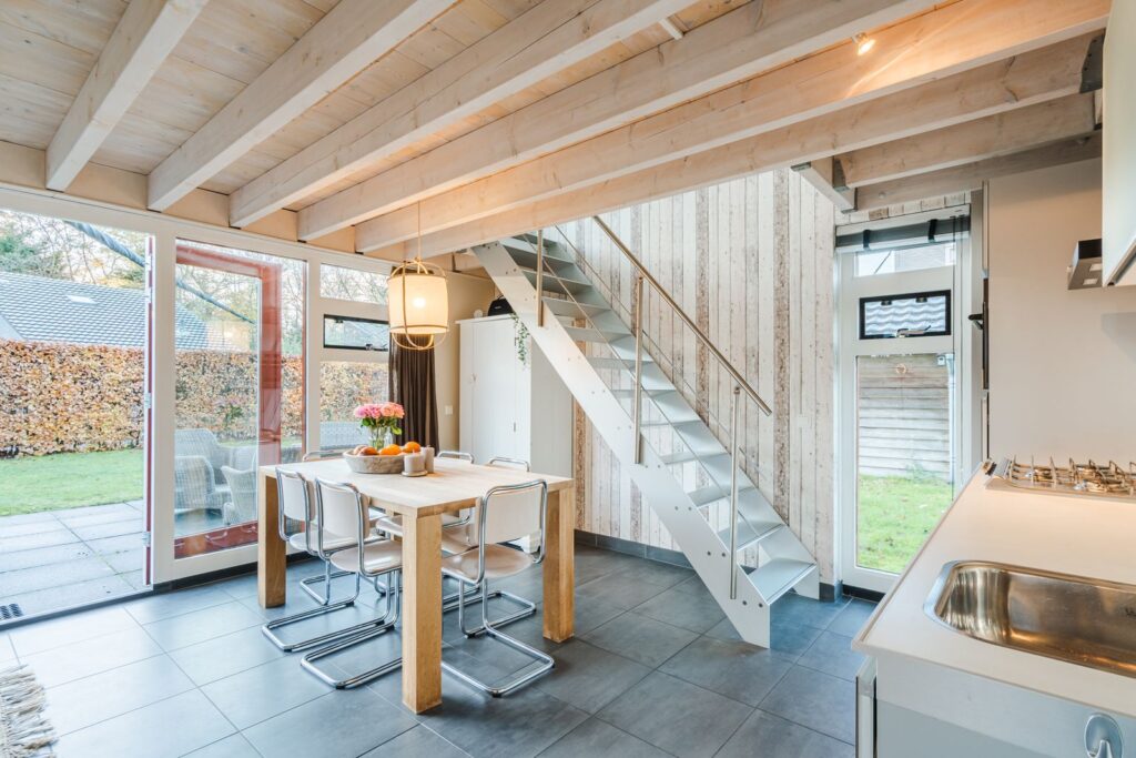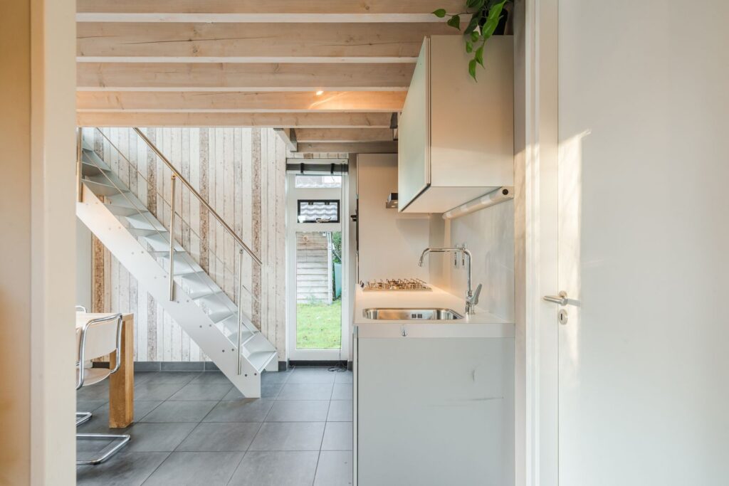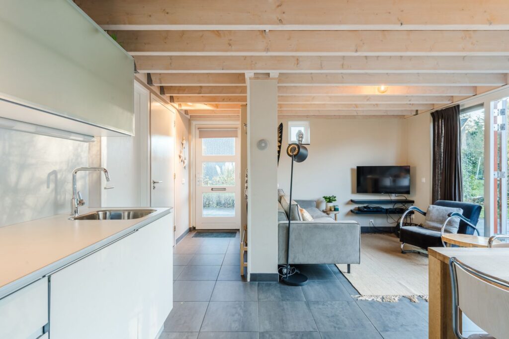 De woning beschikt over een lichte woonkamer met openslaande deuren naar het terras en de tuin. De open keuken is praktisch ingericht en grenst direct aan de woonkamer. Op de begane grond bevinden zich daarnaast een slaapkamer en de badkamer. De grote, tweede slaapkamer ligt op de verdieping, die een kamerbreed uitzicht biedt op de tuin en het park. De indeling is overzichtelijk en efficiënt, geschikt voor comfortabel recreatief gebruik door vier / vijf personen.