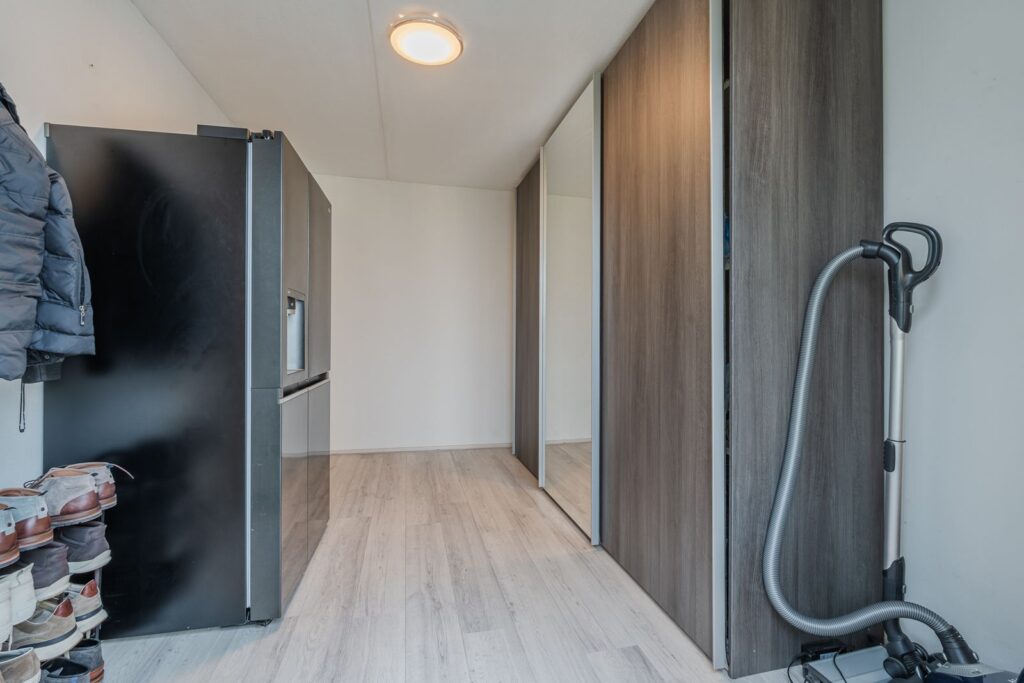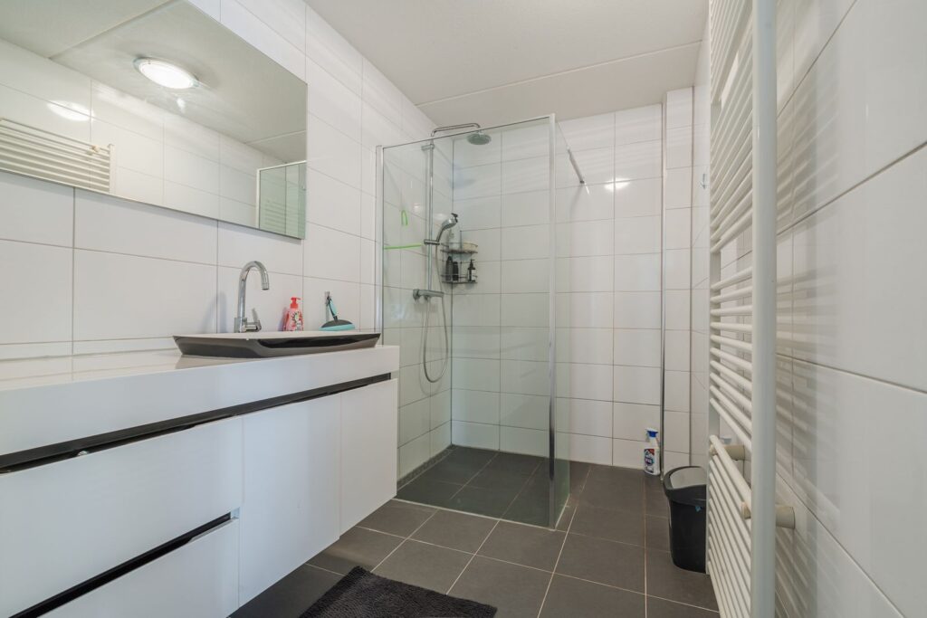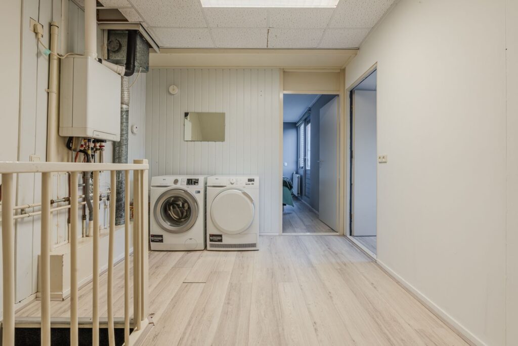 Er is een ruime overloop aanwezig, waar aansluitingen voor was en droogmachine zijn.