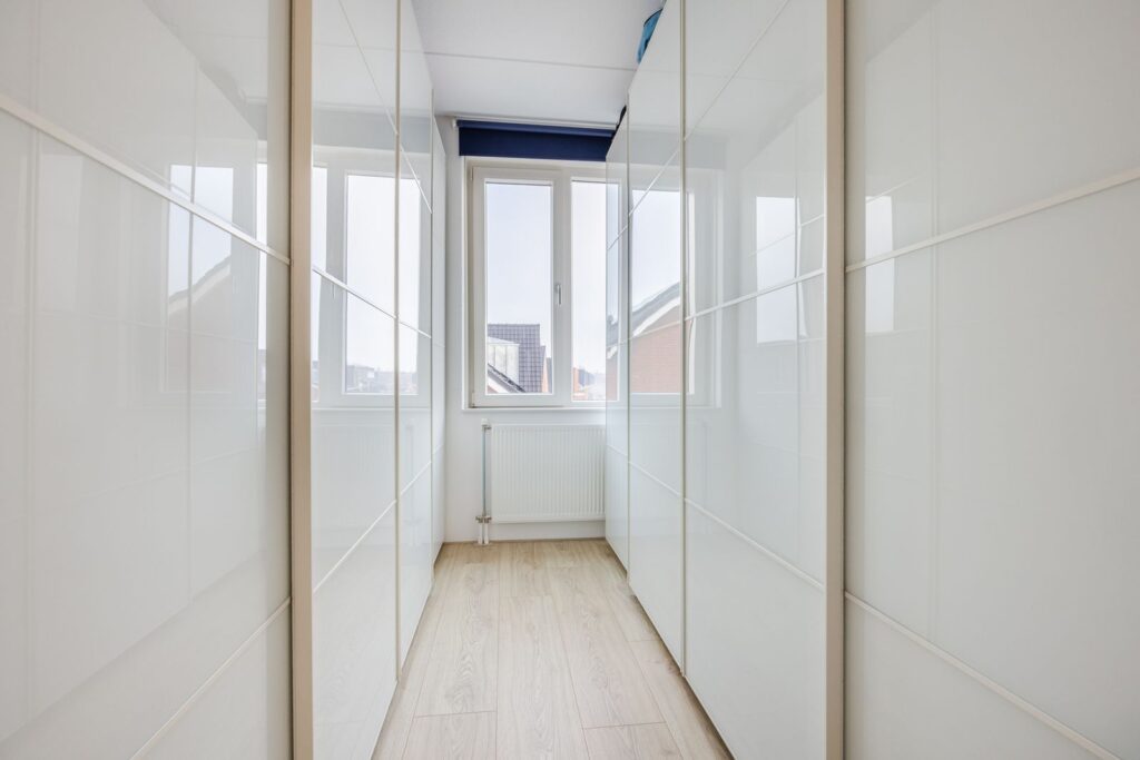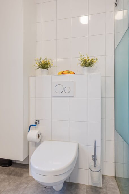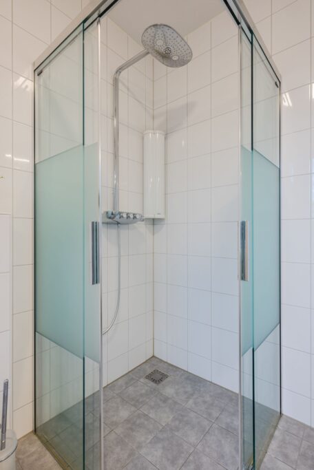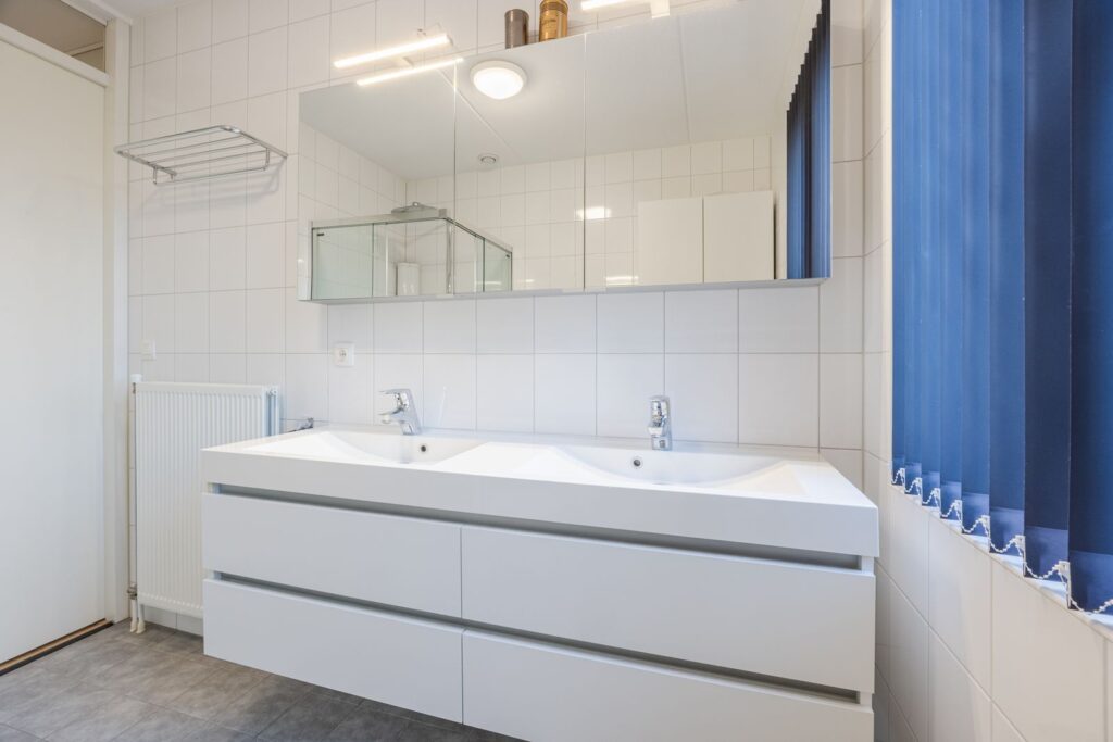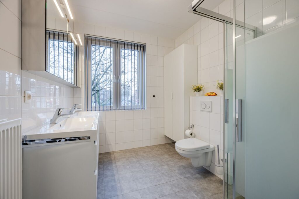 Op de eerste verdieping vind je een badkamer die je eigenlijk alleen in hotels verwacht: een luxe rainshower, een hoogwaardige Duscholux douchecabine, een dubbel wastafelmeubel én een ruime opbergkast—alles stijlvol afgewerkt. Op deze verdieping bevindt zich ook de masterbedroom over de volle breedte van de woning (ruimte genoeg voor een kingsize bed!) én een fijne tweede slaapkamer.
