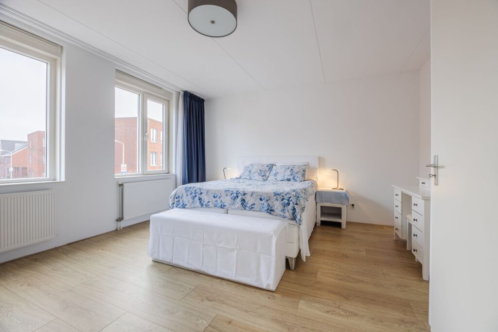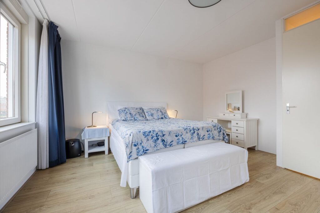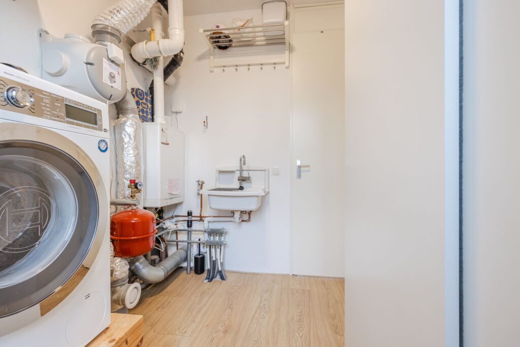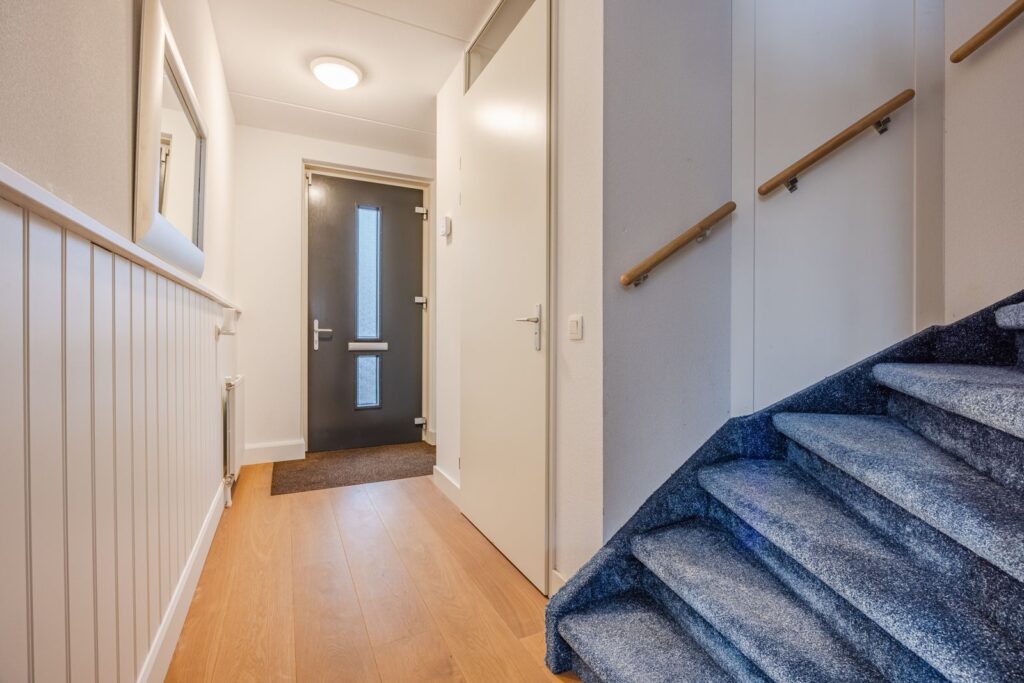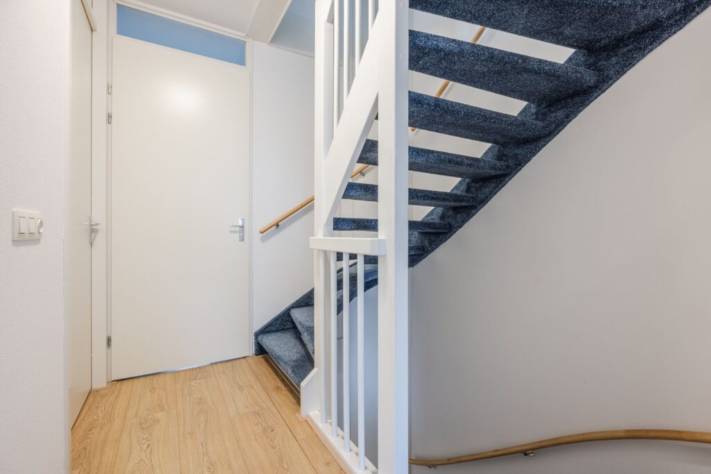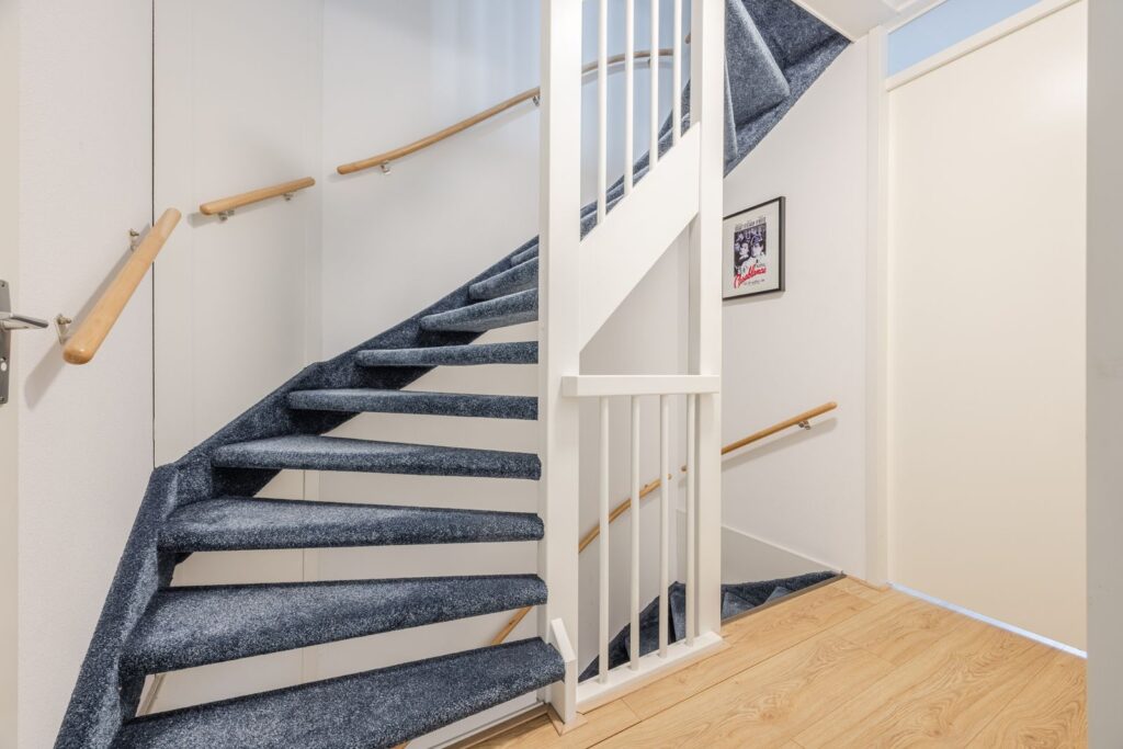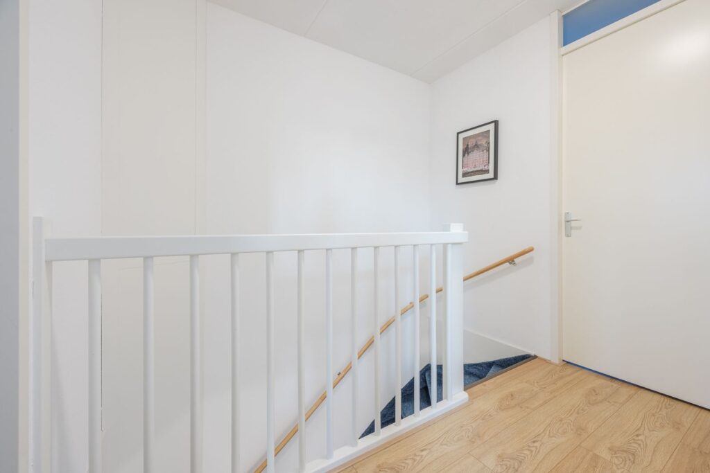Een verdieping hoger wordt het nog beter: drie royale slaapkamers, waarvan één op de hoek met extra veel ramen en licht. Een heerlijke kamer met een prachtig rondom uitzicht—perfect als slaapkamer, werkruimte of hobbykamer. Daarnaast is er een handige opstelkamer voor wasmachine, droger, HR-CV-installatie, mechanische ventilatie én zelfs een uitstortgootsteen. Alles bereikbaar via een brede, met tapijt beklede trap die de woning een rustige, comfortabele uitstraling geeft. De vloeren op de eerste en tweede verdieping zijn voorzien van kwalitatief hoogwaardige laminaatvloeren, wat de ruimtes een moderne en strakke look geeft.
