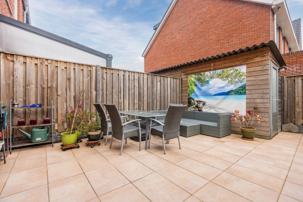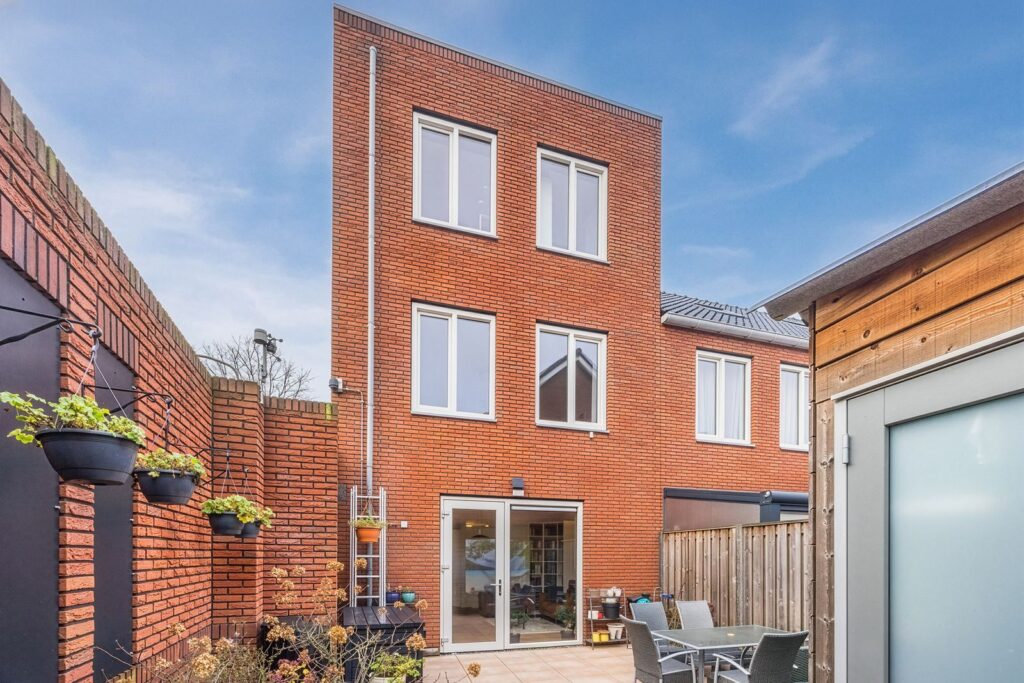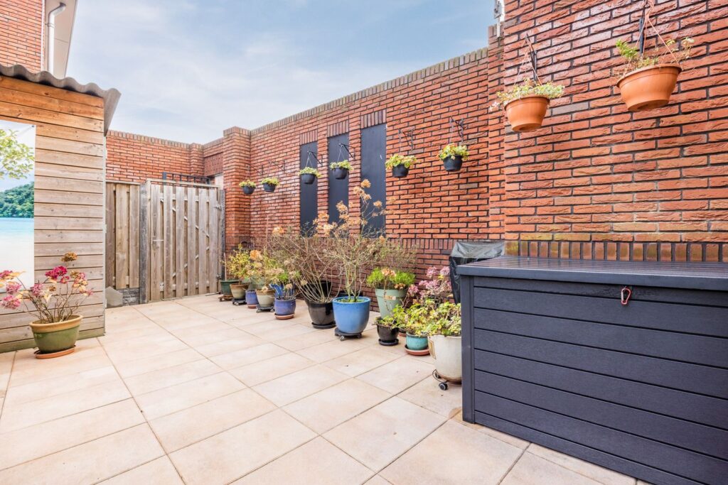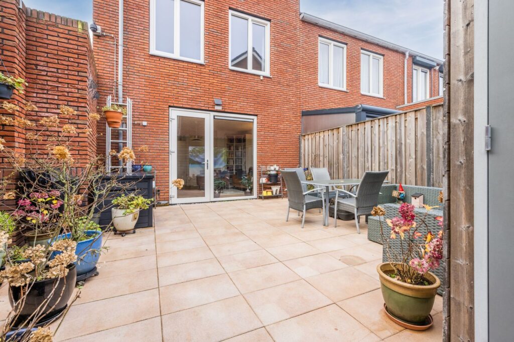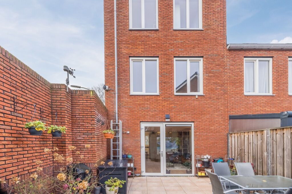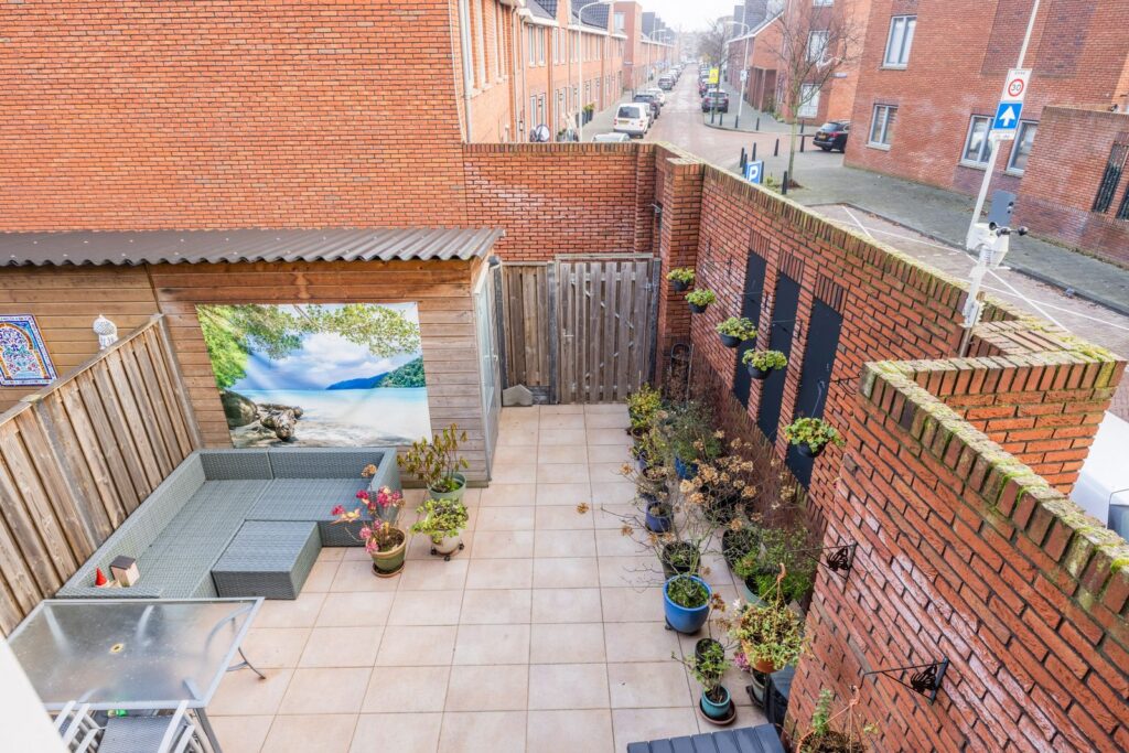 Dan de achtertuin: een fijne plek om even te ontsnappen aan de drukte van de stad. Afgeschermd door een stenen muur en houten schutting met entreedeur, waardoor je volop privacy hebt. In de tuin staat een houten berging, voorzien van verlichting en een wandcontactdoos—ideaal voor fietsen, gereedschap of gewoon extra opslag.