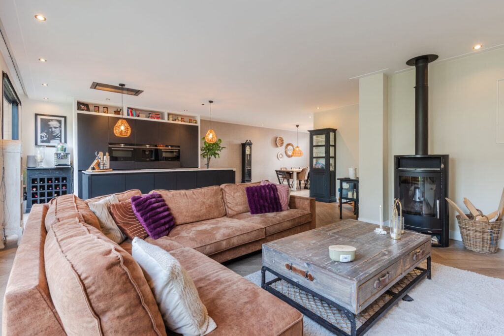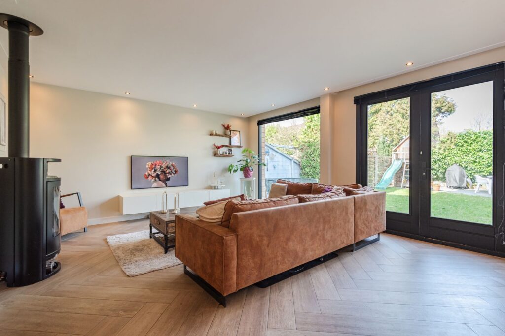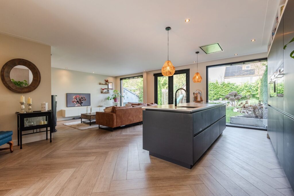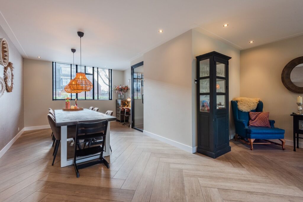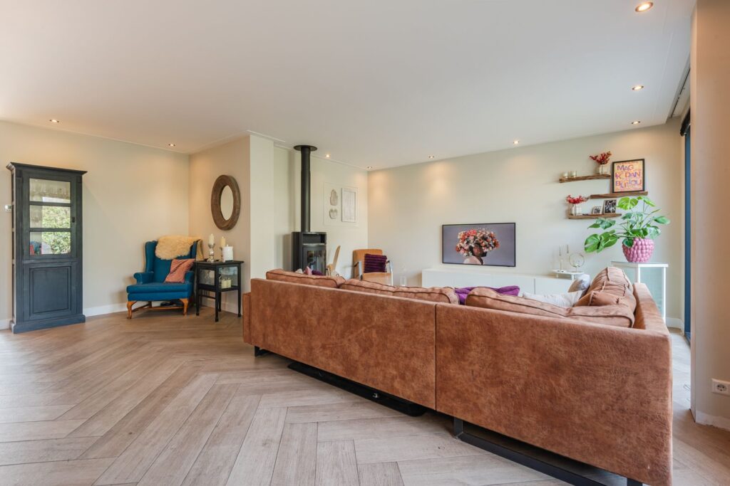 Bij binnenkomst valt direct de lichte en ruimtelijke opzet op. De sfeervolle woonkamer biedt volop mogelijkheden voor een grote zithoek en een royale eettafel. De fraaie stenen visgraatvloer met vloerverwarming zorgt voor een luxe uitstraling.