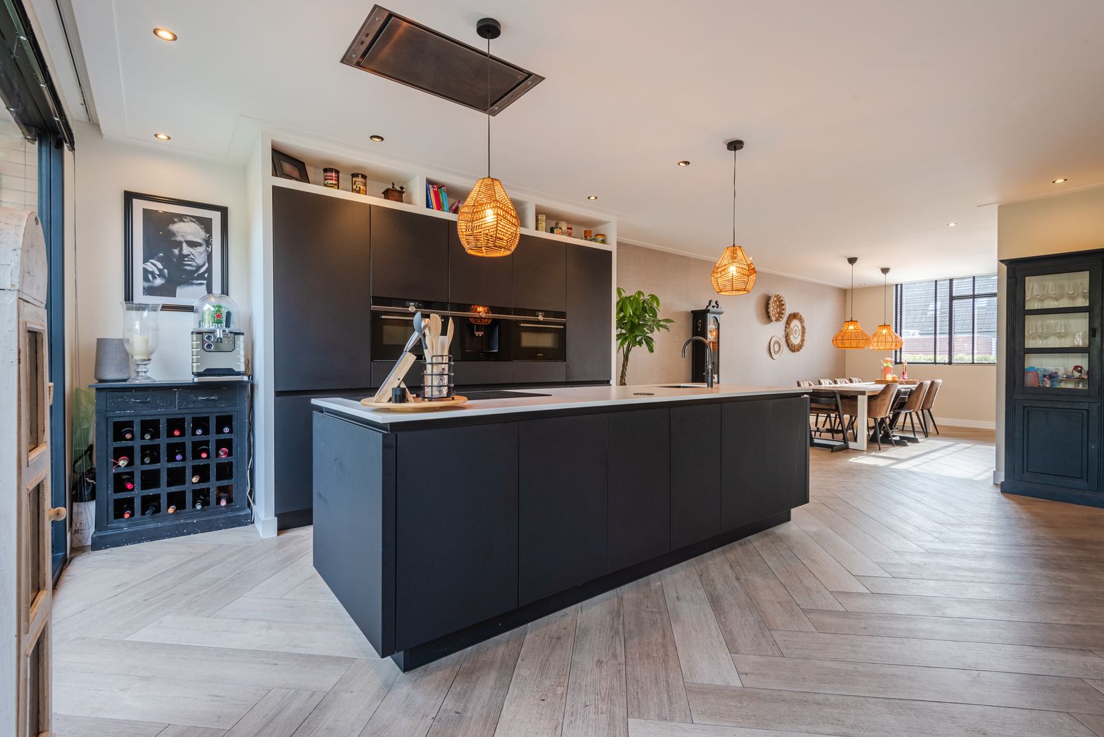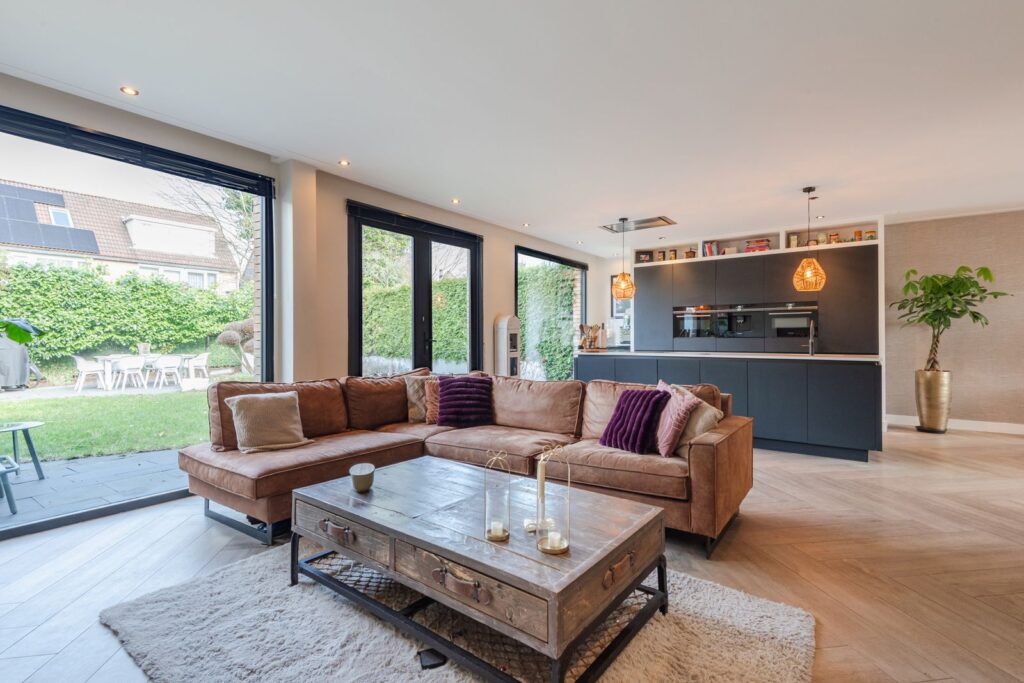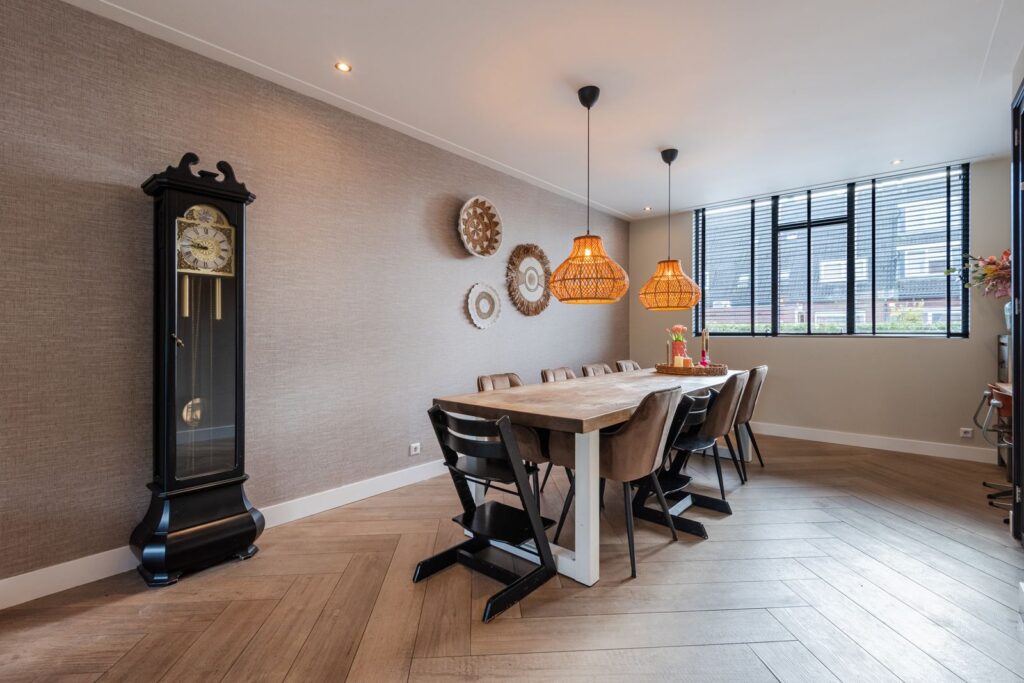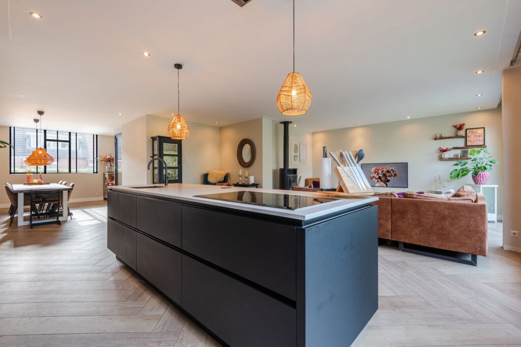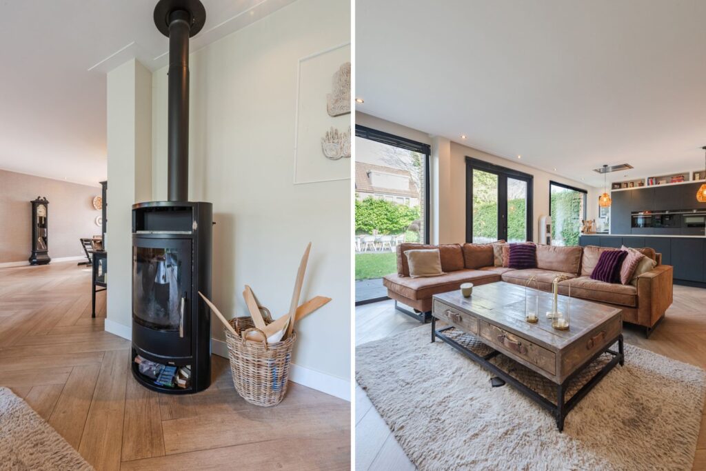 Bij binnenkomst valt direct de lichte en ruimtelijke opzet op. De sfeervolle woonkamer biedt volop mogelijkheden voor een grote zithoek en een royale eettafel. De fraaie stenen visgraatvloer met vloerverwarming zorgt voor een luxe uitstraling.