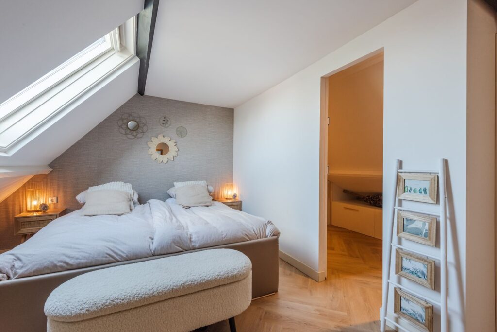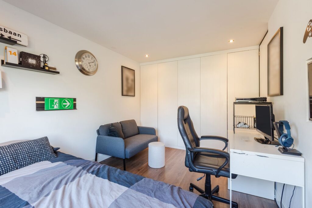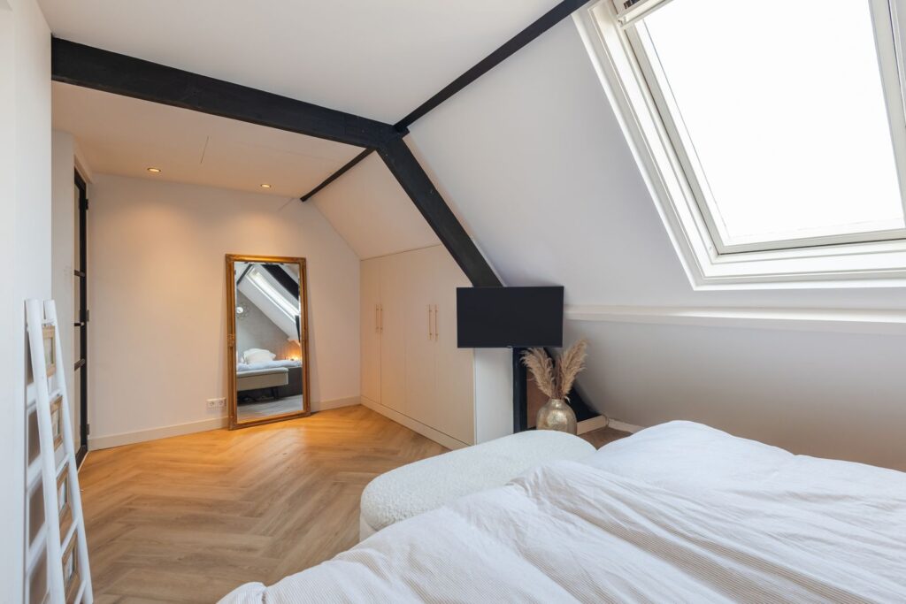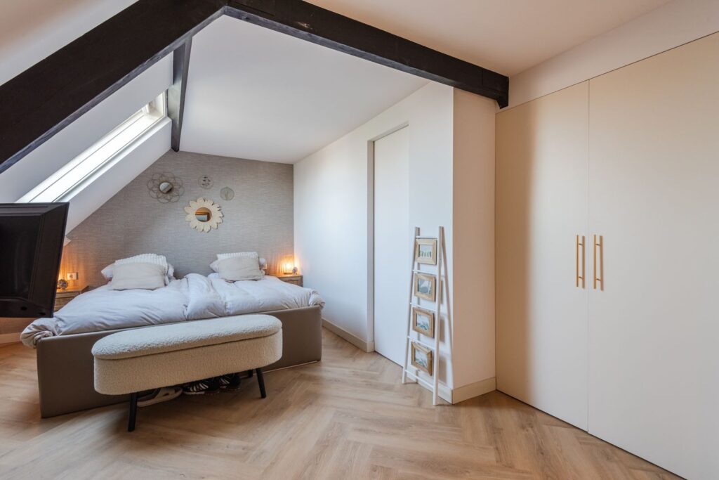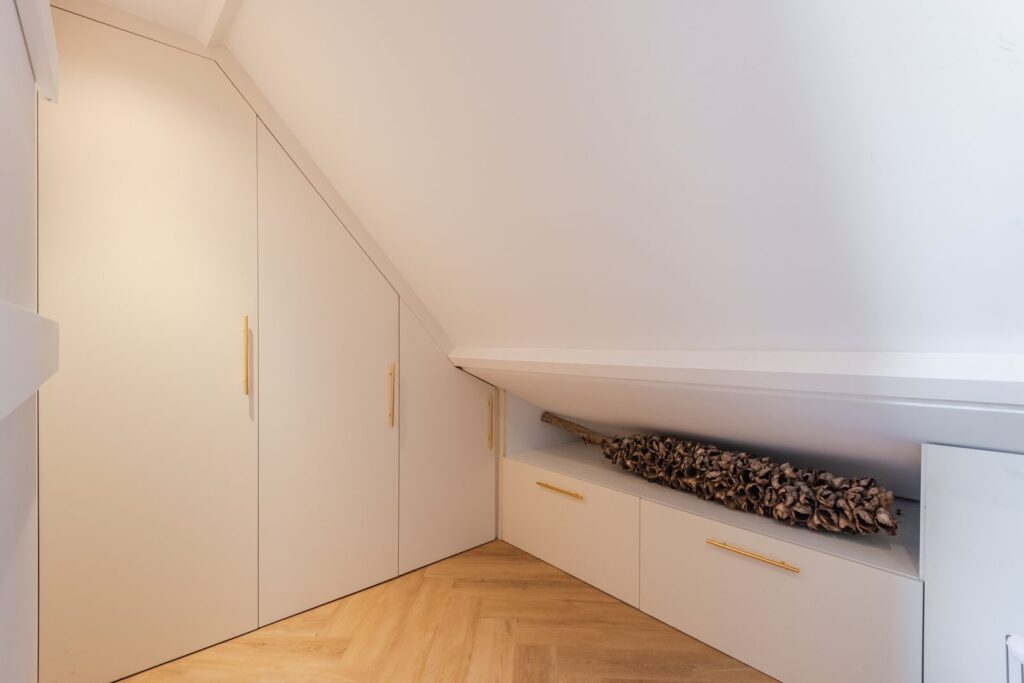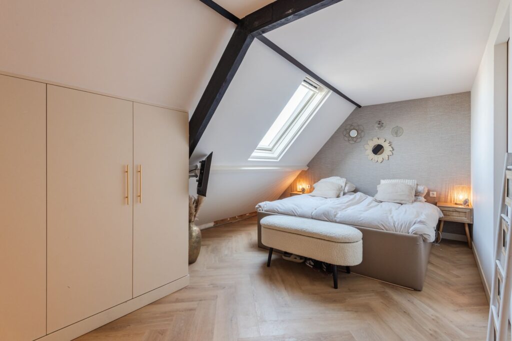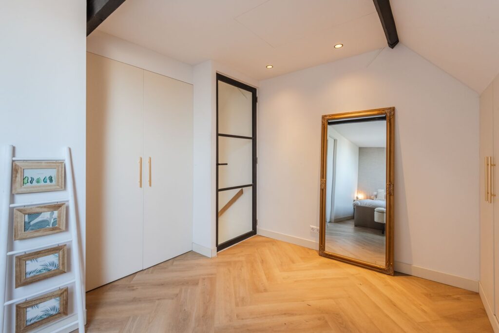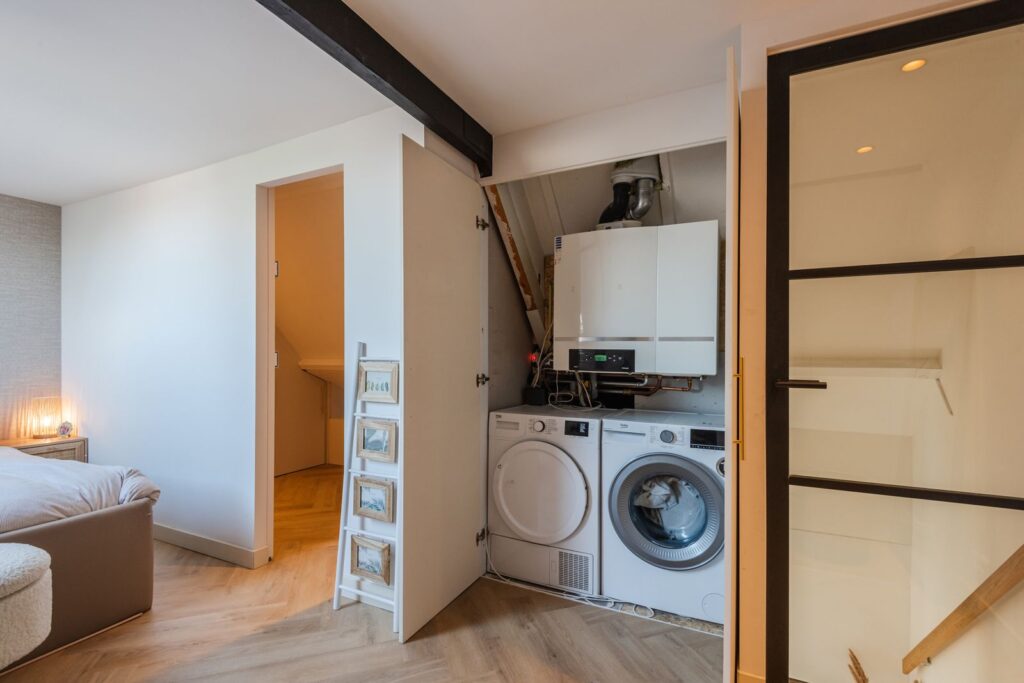 De hoogwaardig afgewerkte zolderverdieping biedt een ruime vierde slaapkamer en een tweede badkamer. Daarnaast zijn de wasmachine en droger netjes weggewerkt in een ingebouwde kast. Op meerdere plekken is extra bergruimte gecreëerd met inbouwkasten.
