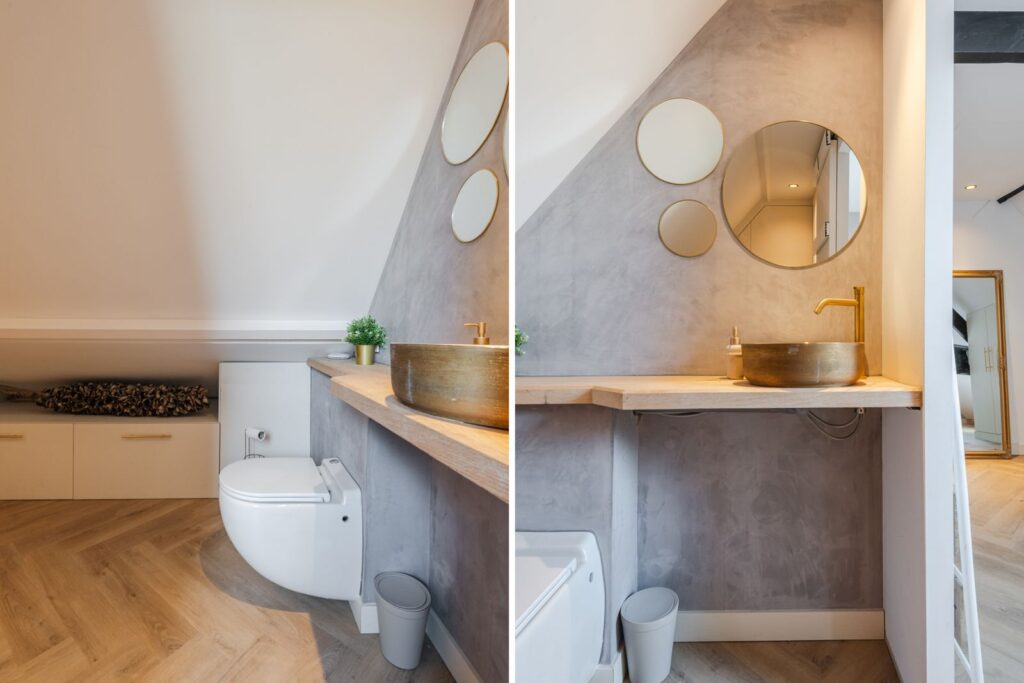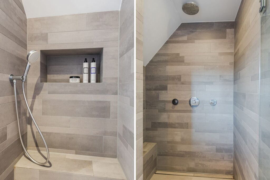 De moderne badkamer is stijlvol ingericht met een ruime inloopdouche met inbouwkranen, regendouche en handdouche. Het dubbele wastafelmeubel met twee waskommen en ingebouwde kranen maakt het geheel compleet. Slimme nissen zorgen voor extra opbergruimte.