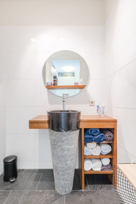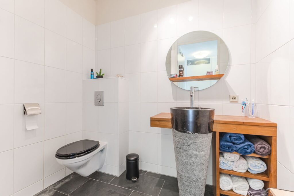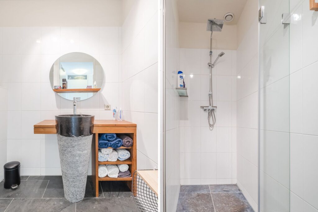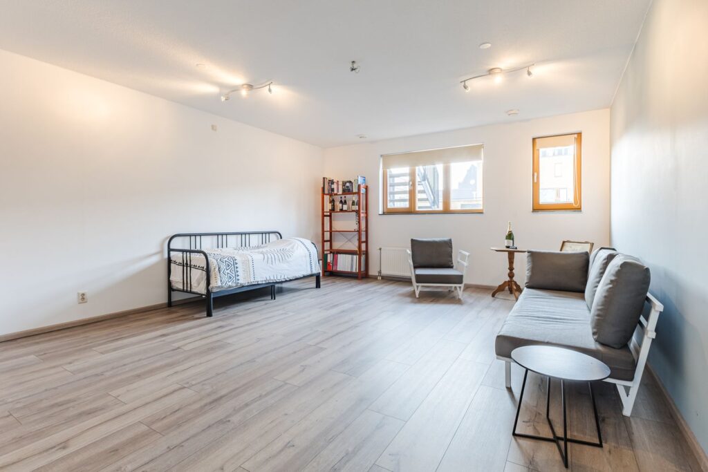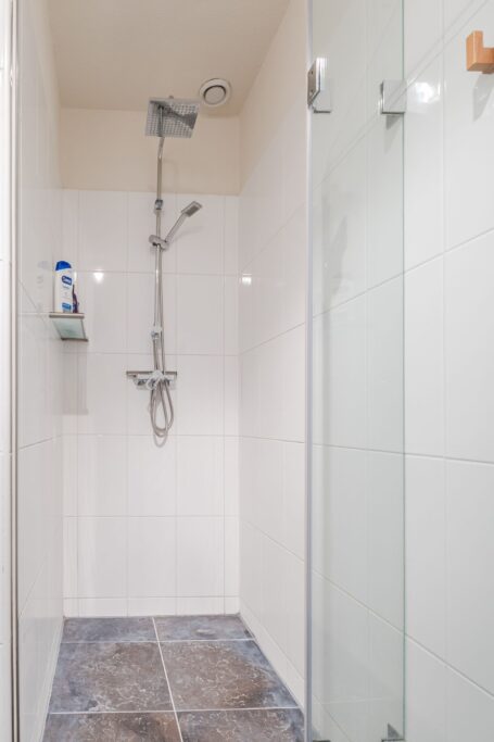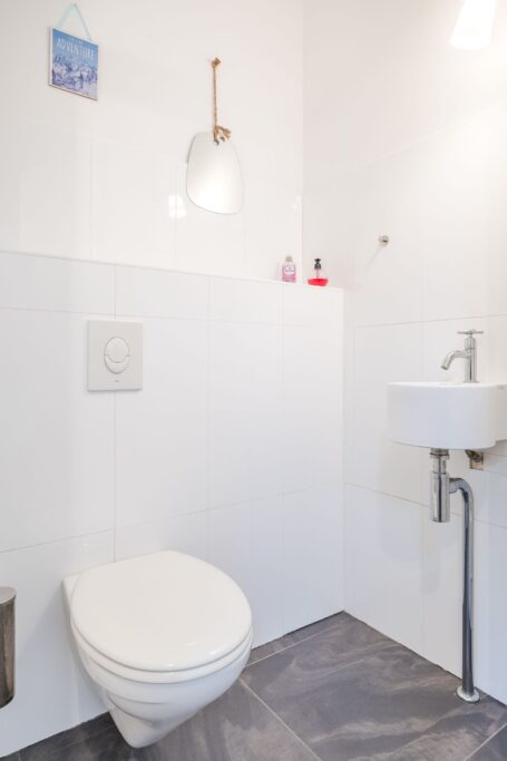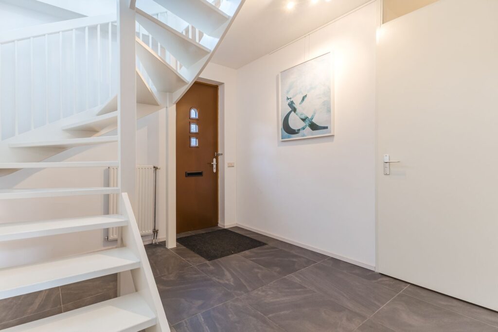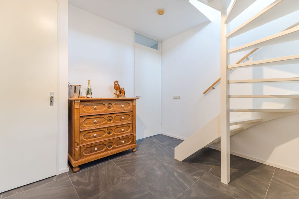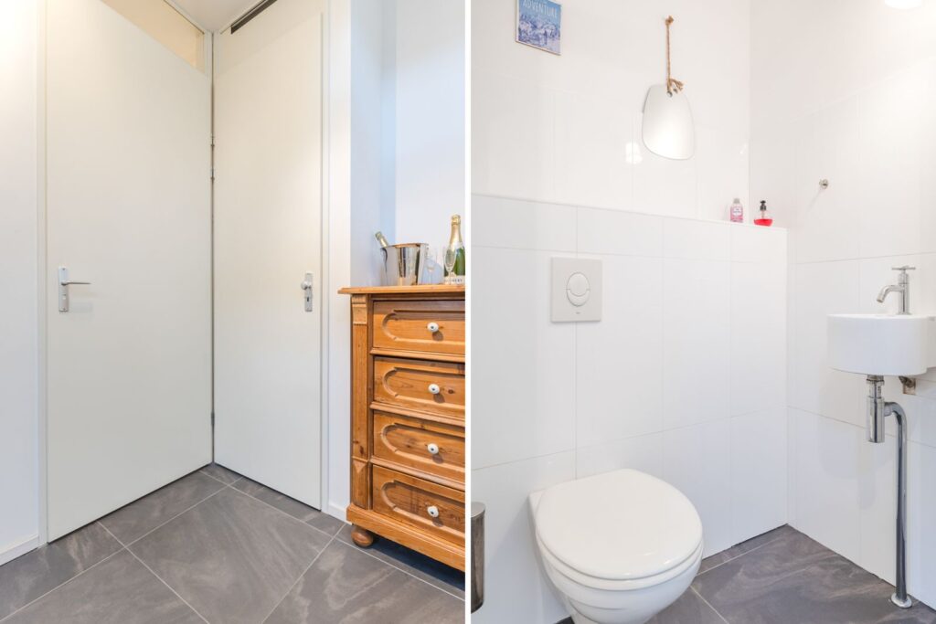 De entree biedt toegang tot een lichte hal met meterkast en modern toilet. De multifunctionele ruimte op de begane grond is momenteel ingericht als logeerkamer. Deze ruimte kan ook worden gebruikt als kantoor en/of praktijkruimte. Grote raampartijen zorgen hier voor veel natuurlijk licht.