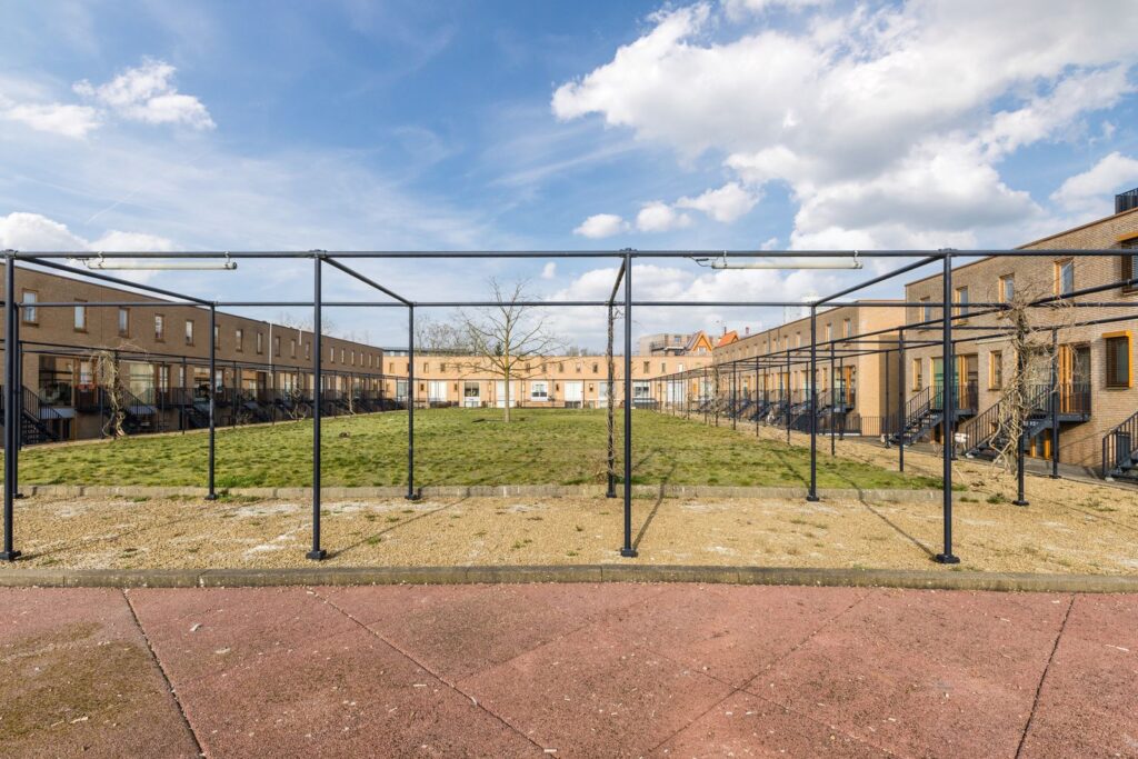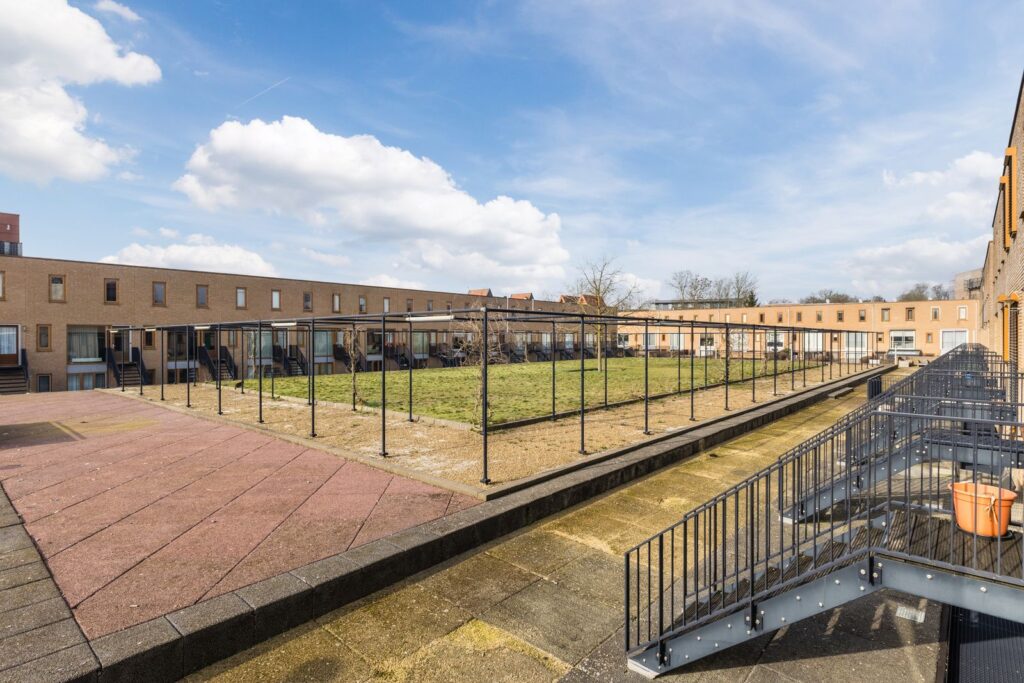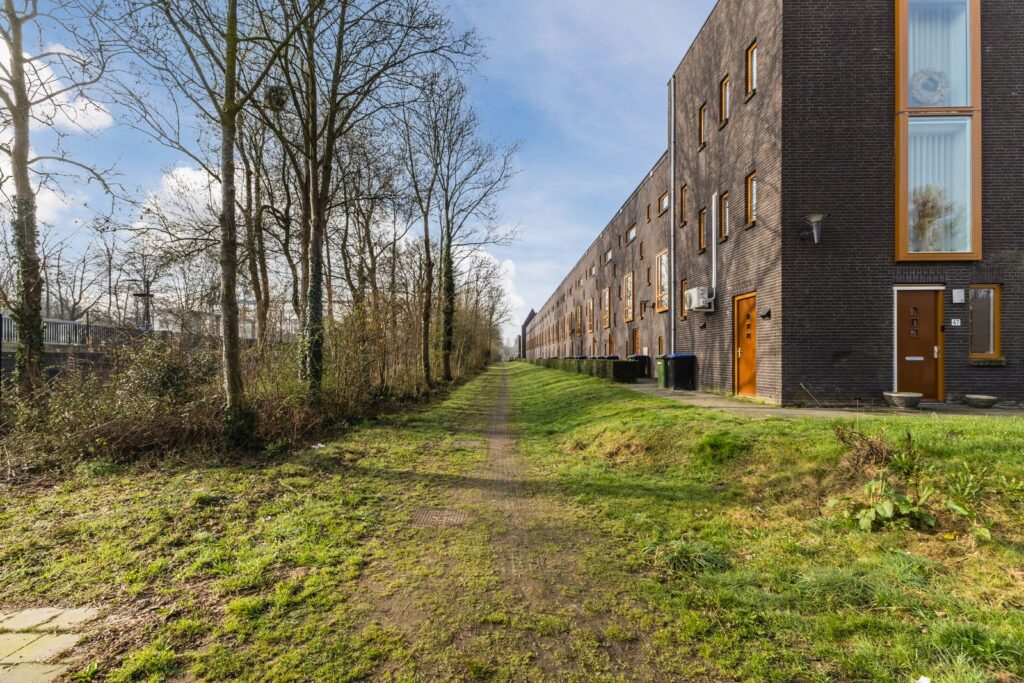 De woning heeft een ruime voortuin met veel groen en twee bomen gesitueerd op het noordoosten. De achtertuin grenst aan de gemeenschappelijke binnentuin, gesitueerd op het zuidwesten.