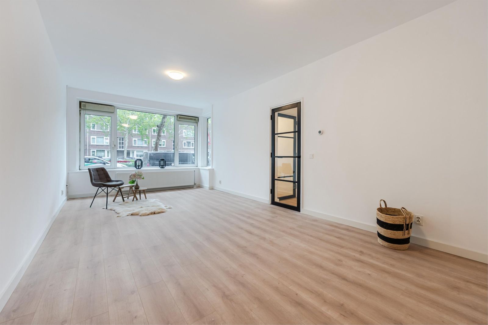 Entree, hal, gang met vaste kast, wasruimte, meterkast, nieuwe keuken (2025) met diverse inbouwapparatuur zoals vaatwasser, koel/vries combinatie, combi oven/magnetron, inductie kookplaat en afzuigkap. De keuken is voorzien van kunststof kozijnen en deur naar de achtertuin. Via de fraaie zwarte deur vanuit de gang bereikt men de zeer grote woonkamer met veel lichtinval door grote raampartijen. Aan de achterzijde bevindt zich de ruime slaapkamer met grote kunststof schuifpui naar zonnige achtertuin met eigen fietsenberging en achterom. Luxe badkamer (2025) met inloopdouche, rainshower, wastafelmeubel met spiegel en verlichting. De gehele woning is v.v. nieuwe laminaatvloer en glad stucwerk.