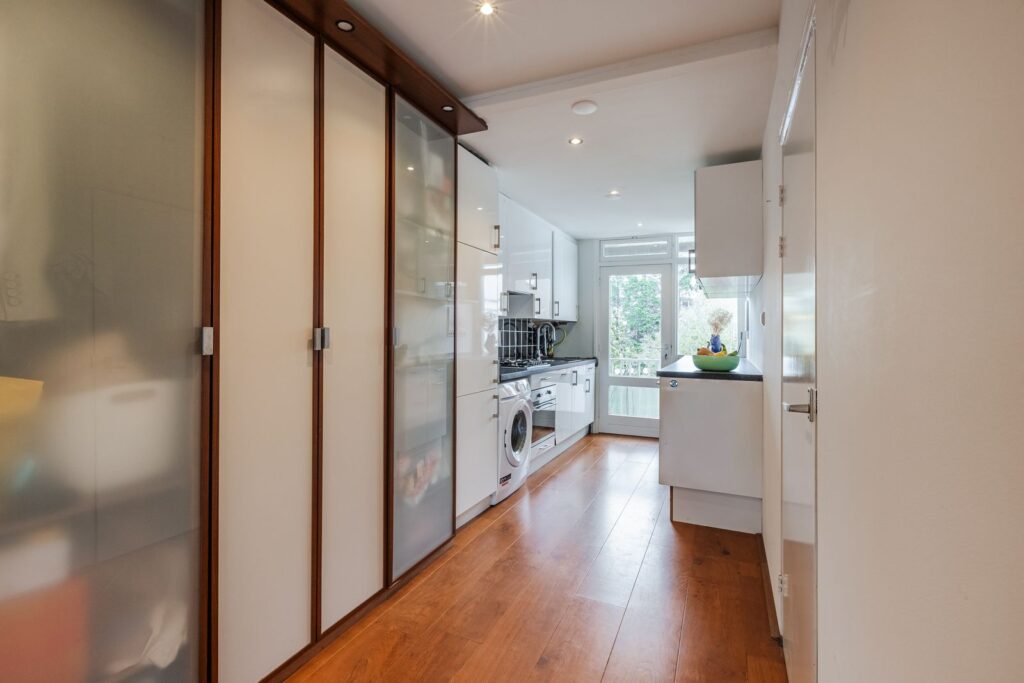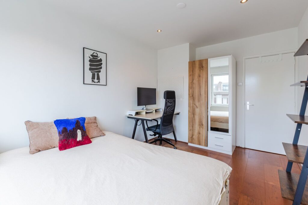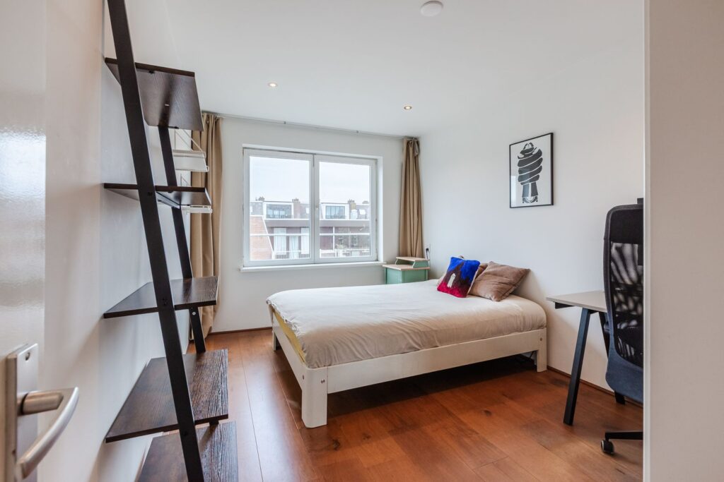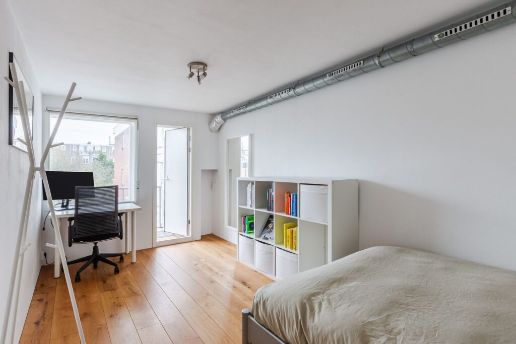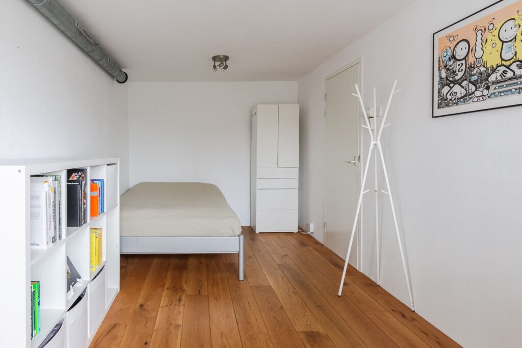 Het appartement beschikt over twee slaapkamers. De tweede slaapkamer is uitgevoerd als een zogenoemde “box in box” en is langere tijd gebruikt als combinatie van slaapkamer en muziekstudio. Deze “zwevende kamer” met dubbele deuren en mechanische ventilatie is sterk geluidsisolerend, zowel naar de buren als van buiten naar binnen. Ideaal als muziekstudio, maar ook perfect als stille slaapkamer of werkkamer.