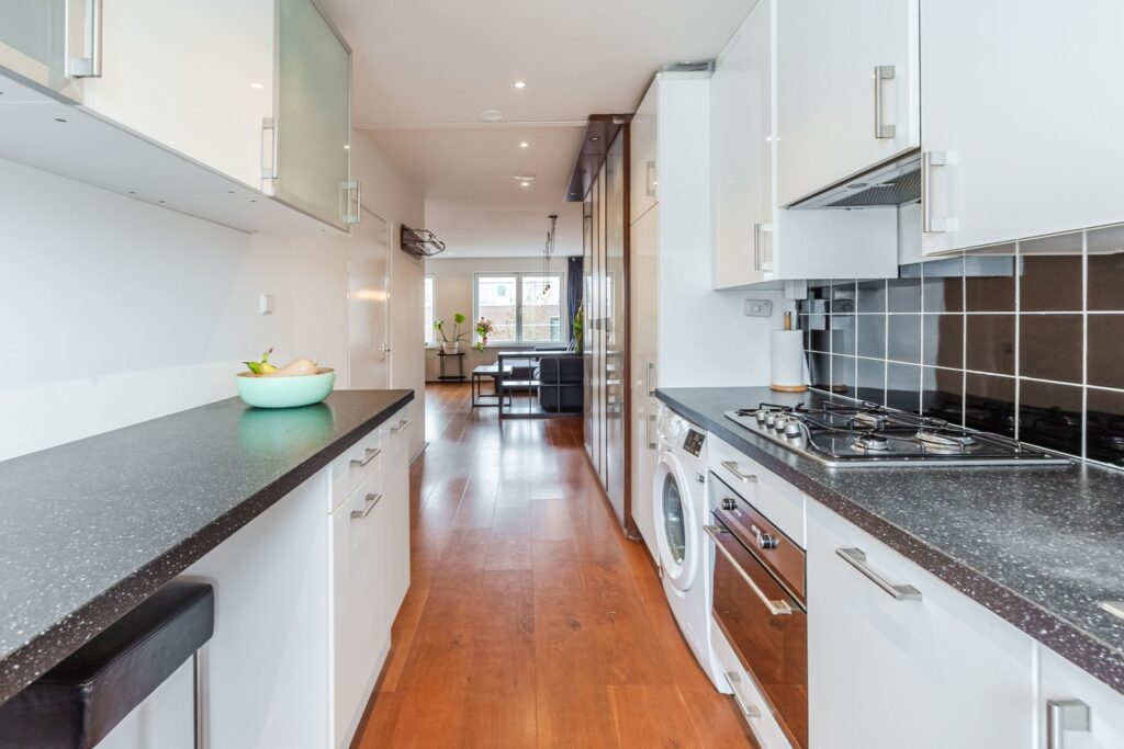 De woning bevindt zich volledig op één verdieping en heeft een prettige, logische indeling. De ruime woonkamer vormt het hart van het huis en biedt volop licht en leefruimte. In 2021 is de woonkamer gerenoveerd, waarbij de wanden zijn gestuct en een parketvloer met vloerverwarming is aangelegd, wat zorgt voor een moderne en warme uitstraling. De open keuken sluit hier direct op aan.